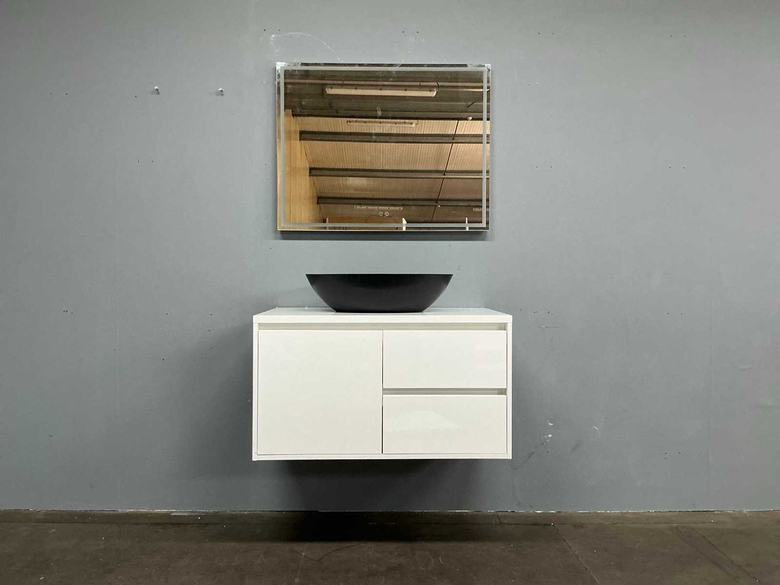 Badmeubelset met: onderkast 55x90x50 cm, waskom 57x40x14,2 cm, spiegel 90x70 cm Kleur: Hoogglans Wit,Antraciet Mat Waskom: Luca Sanitair Spiegel met verlichting: Primabad Lades: 2 Bevestigingsmateriaal: true