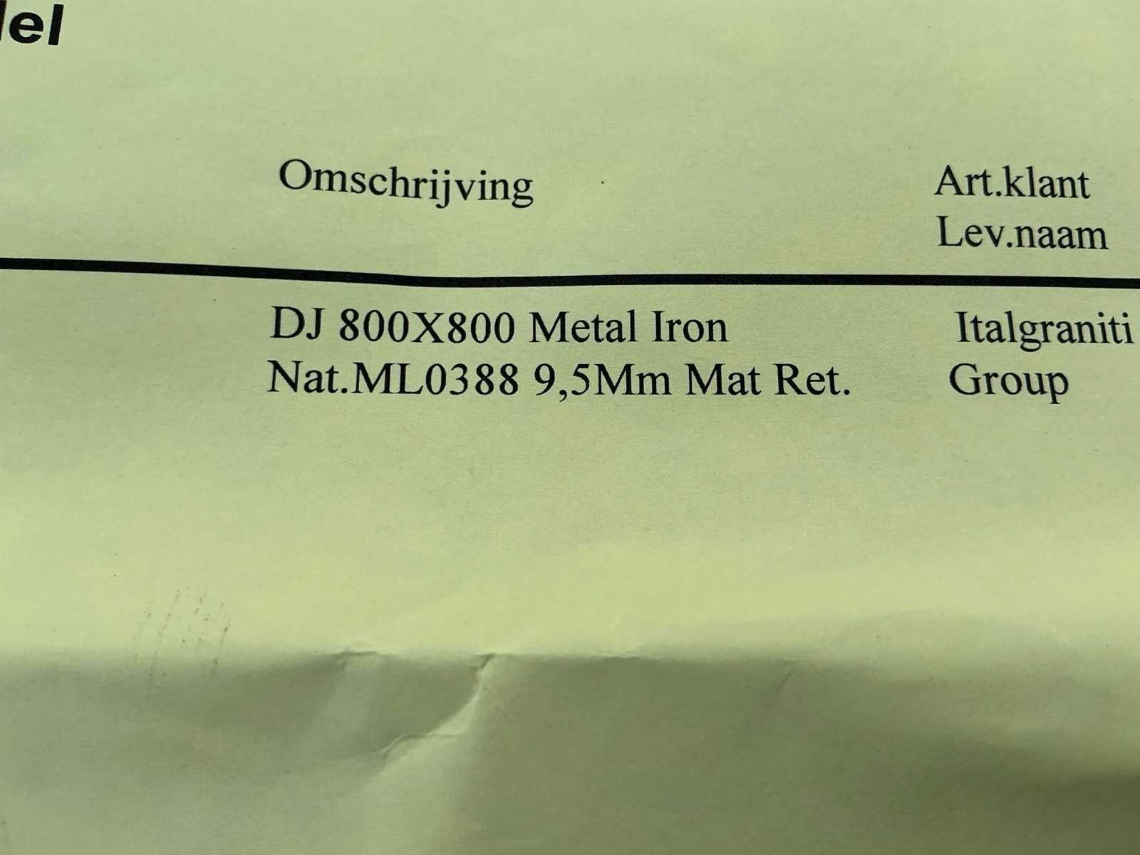 Volle pallet Merk: Italgraniti Kleur: Metal Iron Lengte: 800mm Breedte: 800mm Dikte: 9,5mm Aantal pakken: 40 Totaal oppervlakte: 51.2m²