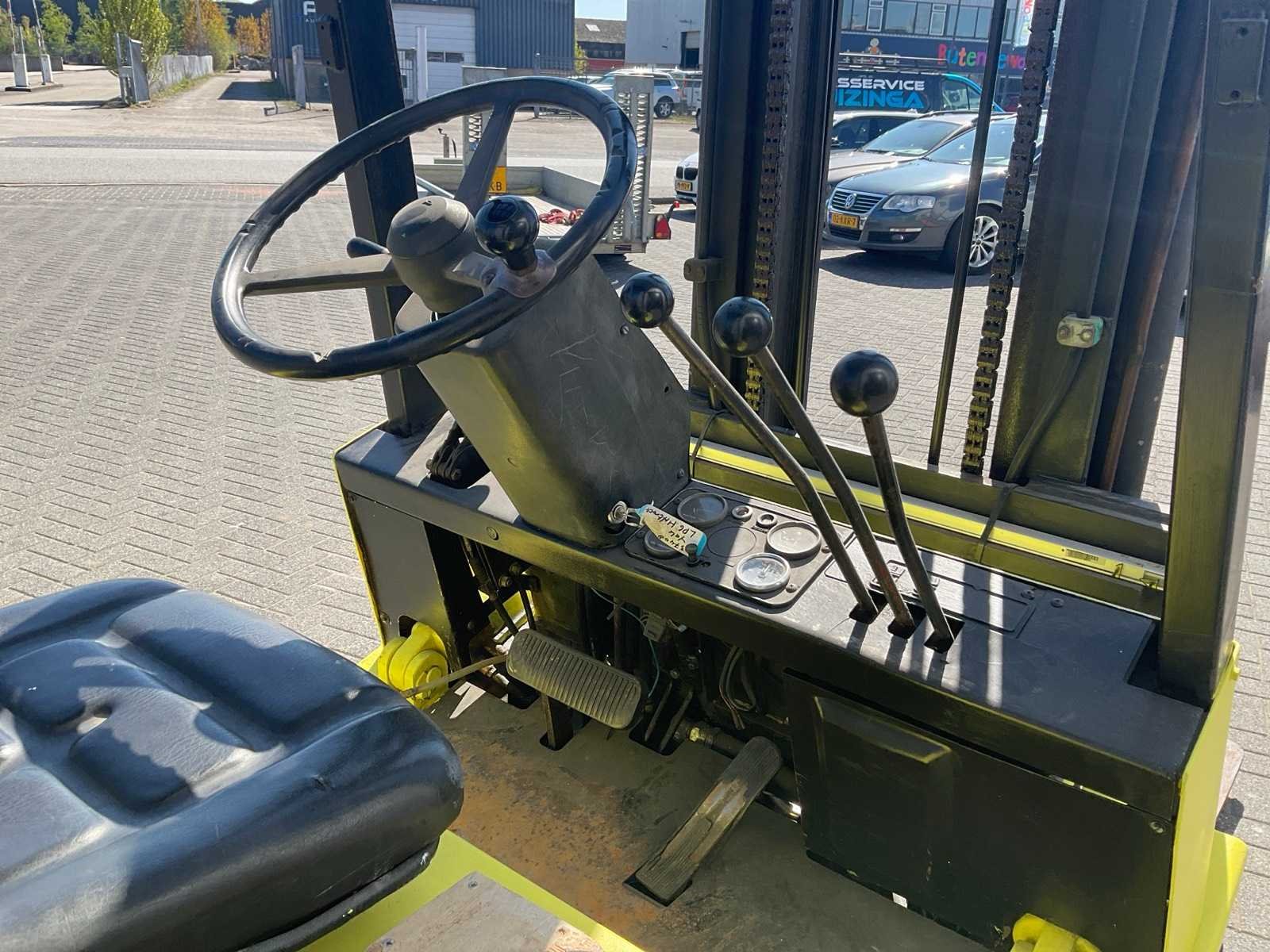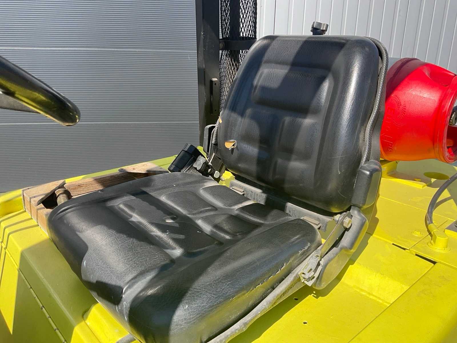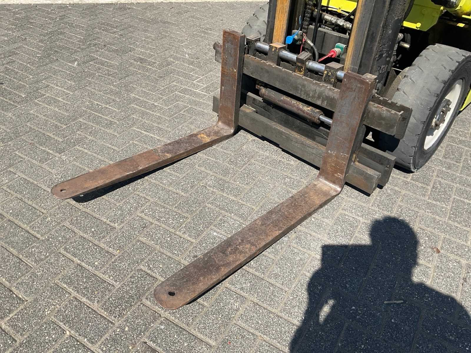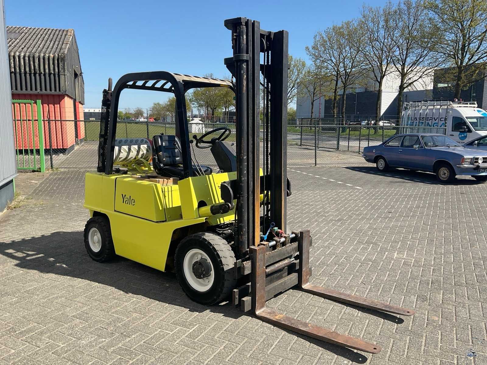 Specificaties en verdere gegevens onbekend. Let op! Remmen defect. Wordt geleverd zonder gasfles. Merk: Yale Brandstof: LPG Mast: Duplex Soort band: Volrubber banden Aantal wielen: 4 Afgelezen urenstand: 9322 Side-shift: true Duplex mast: true Lepellengte: 1000mm Max. hefhoogte: 3650mm Vol rubber banden: true Minimale doorrijhoogte: 2450mm Totale afmeting L: 3550mm Totale afmeting Breedte: 1150mm Totale afmeting Hoogte: 2450mm LPG: true