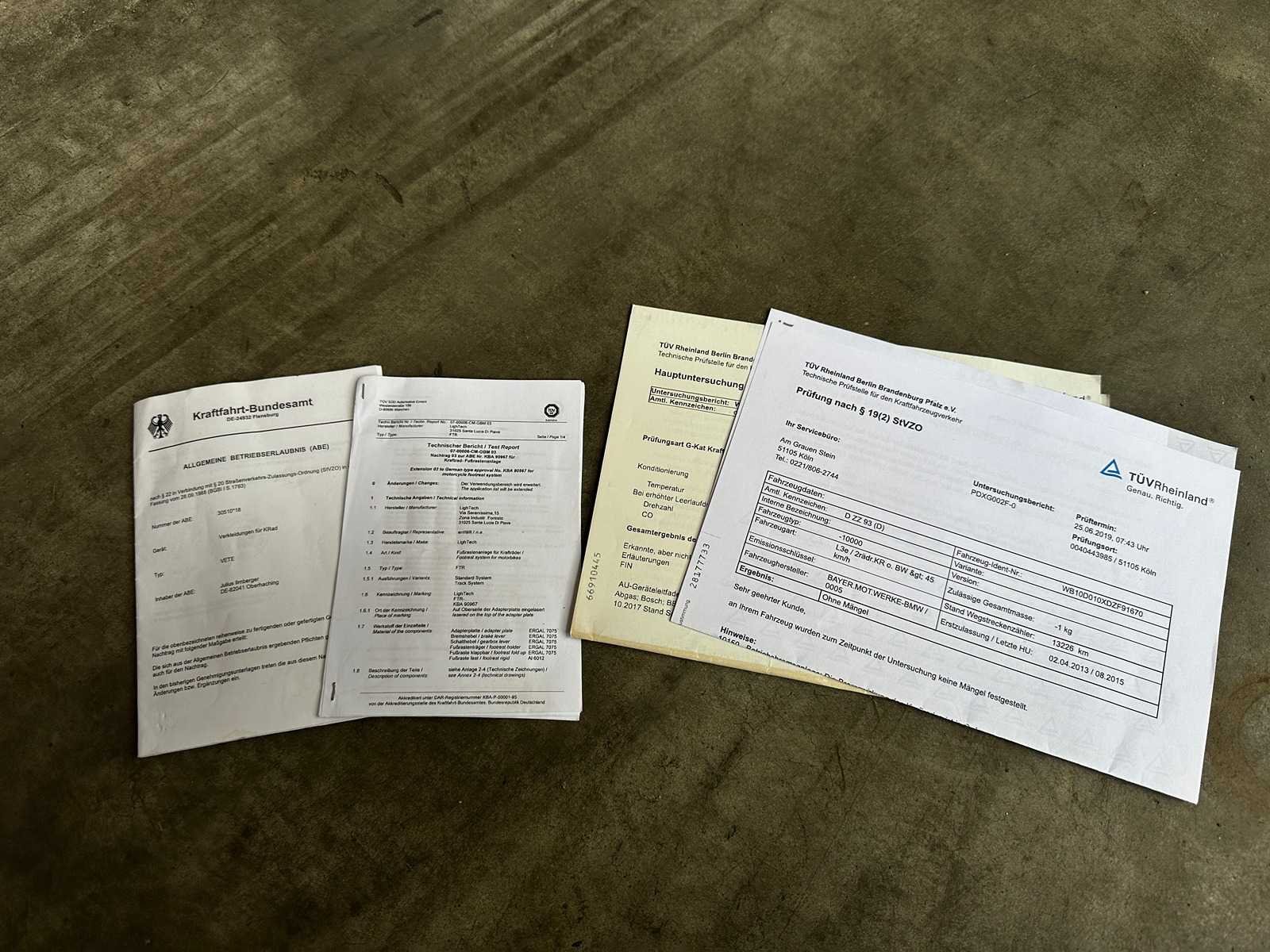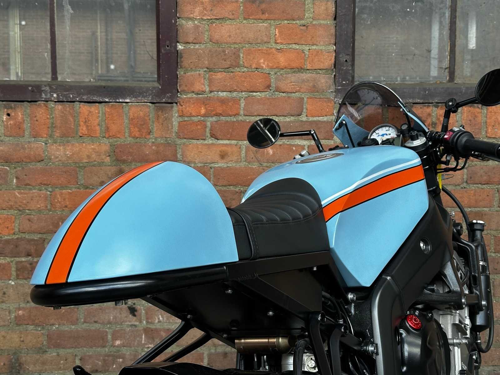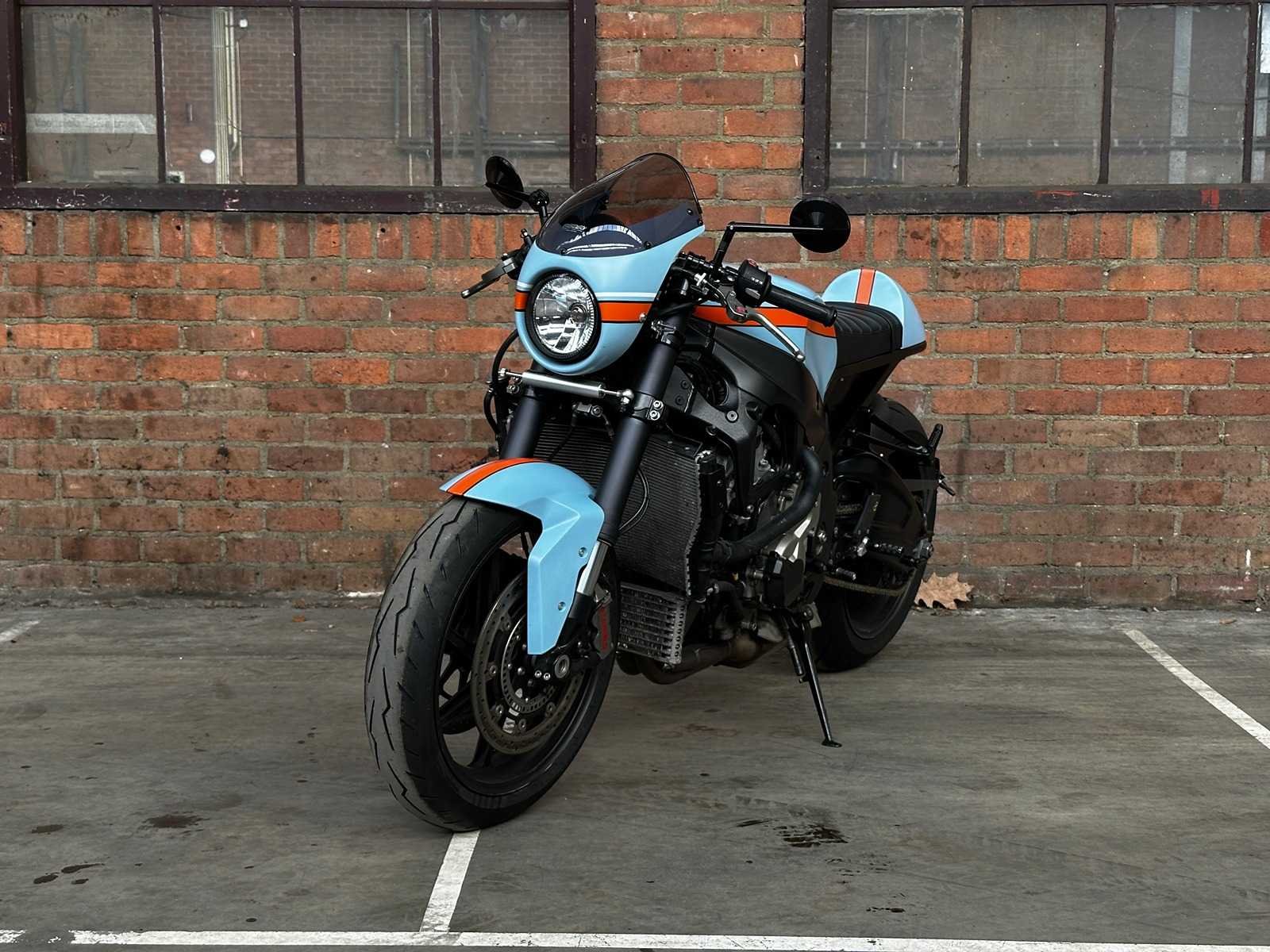 Merk: BMW Model: S1000RR HP4 Type: Cafe Racer Brandstof: Benzine Chassisnummer: WB10D010XDZF91670 Cilinderinhoud: 999cc Datum eerste toelating: 2013-04-02 Kleur: Gulf kleuren, lichtblauw met rood Afgelezen kilometerstand: 14352km Nationaliteit documenten: Duitse kentekendocumenten