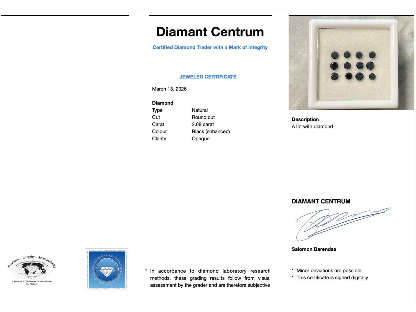 Samenvatting van gegevens Diamant - 2.08 carat echte zwarte diamant (gecertificeerd) Diamant: Natuurlijk; Aantal: 12 stuks; Slijpvorm: Rond geslepen; Gewicht (carat): 2.08 carat; Kleur: Zwart (enhanced); Zuiverheid: Opaak; Conditie: Nieuw; Verpakking: Edelsteendoos; Toelichting: De kwaliteit is overgenomen van het rapport behorend bij item. De waardebepaling is een beoordeling van een gecertificeerde diamantair, gebaseerd op consumentenprijzen.; Extra informatie: Aan de oppervlakte van deze diamanten zitten nog natuurlijke kenmerken van ruwe diamant, dit kan voor een leek lijken op beschadigingen; Consumentenprijs: € 1.840,- Within 14 days Voornaamste diamant: Natuurlijk Kleur diamant: Zwart (enhanced) Gewicht diamant: 2.08ct Slijpvorm diamant: Rond geslepen Zuiverheidsgraad diamant: Opaak Lage schatting: 1472€ Hoge schatting: 1840€