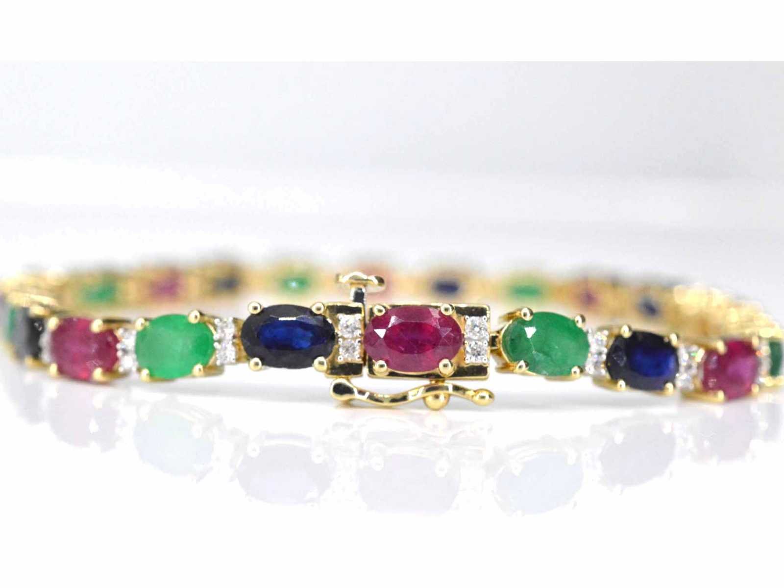 Samenvatting van gegevens Gouden tennisarmband met diamanten, saffier, robijn en smaragd Diamant: Natuurlijk; Slijpvorm: Briljant geslepen; Gewicht (carat): 0.50 carat; Kleur: F-G; Zuiverheid: SI-P; Slijpkwaliteit: Zeer mooi; Edelsteen: Saffier, smaragd en robijn; Slijpvorm: Ovaal geslepen; Gewicht (carat): 13.00 carat; Kleur: blauw, rood en groen; Zuiverheid: Met natuurlijke insluitsels; Slijpkwaliteit: Very good; Juweel: Armband; Gewicht: 10.5 gram; Afmetingen/lengte: 18 cm; Materiaal: 14 karaat (585); Conditie: Nieuw; Verpakking: Luxe sieradendoos; Toelichting: De kwaliteit is overgenomen van het rapport behorend bij item. De waardebepaling is een beoordeling van een gecertificeerde diamantair, gebaseerd op consumentenprijzen.; Consumentenprijs: € 7.823,- Within 14 days Voornaamste diamant: Natuurlijk Kleur diamant: F-G Gewicht diamant: 0.50ct Slijpvorm diamant: Briljant geslepen Slijpkwaliteit diamant: Zeer mooi Zuiverheidsgraad diamant: SI-P Edelsteen: Saffier, smaragd en robijn Kleur edelsteen: blauw, rood en groen Slijpvorm edelsteen: Ovaal geslepen Slijpkwaliteit edelsteen: Very good Zuiverheidsgraad edelsteen: Met natuurlijke insluitsels Totaal gewicht: 10.5g Keurmerk: 585 Lage schatting: 6258€ Hoge schatting: 7823€