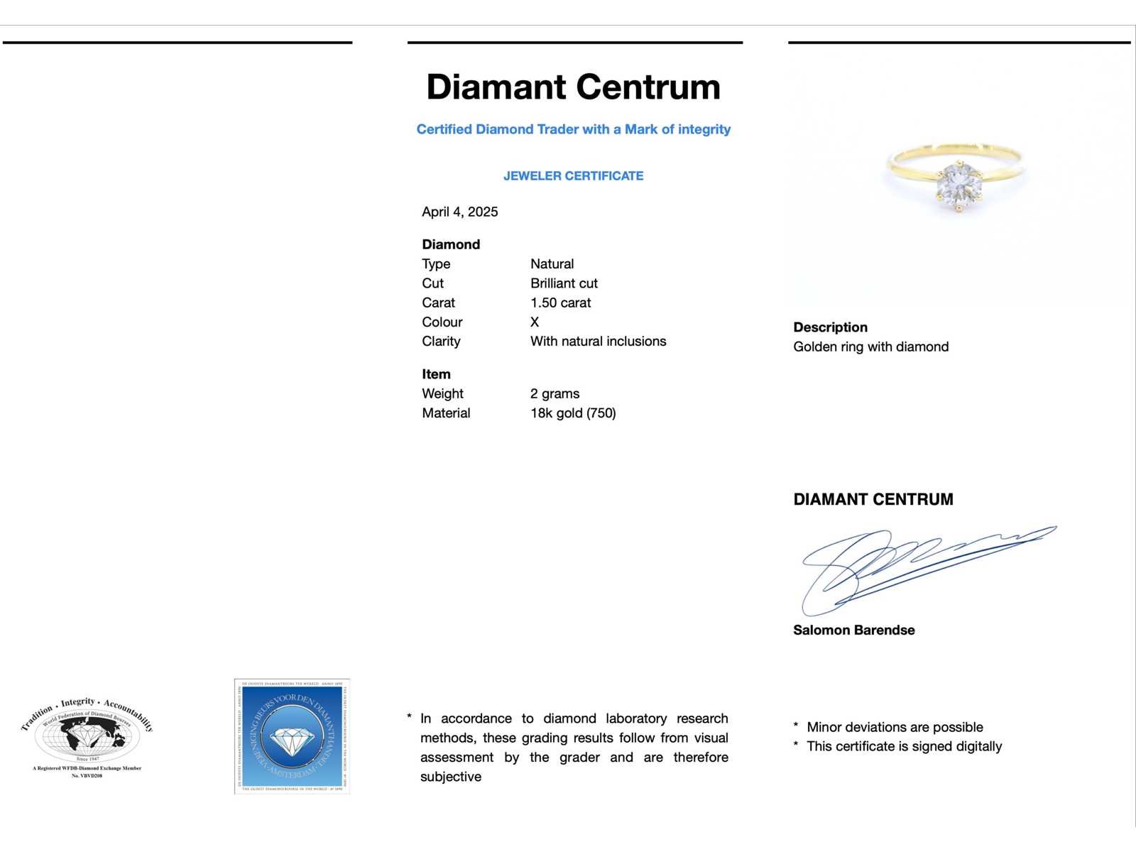 Samenvatting van gegevens Verlovingsring met een diamant van 1.50 carat in 18 carats goud Diamant: Natuurlijk; Aantal: 1 stuk; Slijpvorm: Briljant geslepen; Gewicht (carat): 1.50 carat; Kleur: Commercial (X); Zuiverheid: Met natuurlijke insluitsels (P); Slijpkwaliteit: Zeer goed; Juweel: Ring; Gewicht: 2 gram; Ringmaat (op maat gemaakt*): 53 (17 mm); Materiaal: 18K goud (750); Conditie: Nieuw; Verpakking: Luxe sieradendoos; Toelichting: De kwaliteit is overgenomen van het rapport behorend bij item. De waardebepaling is een beoordeling van een gecertificeerde diamantair, gebaseerd op consumentenprijzen.; Consumentenprijs: € 7.480,- Within 14 days Materiaal: Goud Voornaamste diamant: Natuurlijk Gewicht diamant: 1.50ct Totaal gewicht: 2g Keurmerk: 750 Lage schatting: 5984€ Hoge schatting: 7480€ Kleur diamant: Commercial (X) Slijpvorm diamant: Briljant geslepen Slijpkwaliteit diamant: Zeer goed Zuiverheidsgraad diamant: Met natuurlijke insluitsels (P)