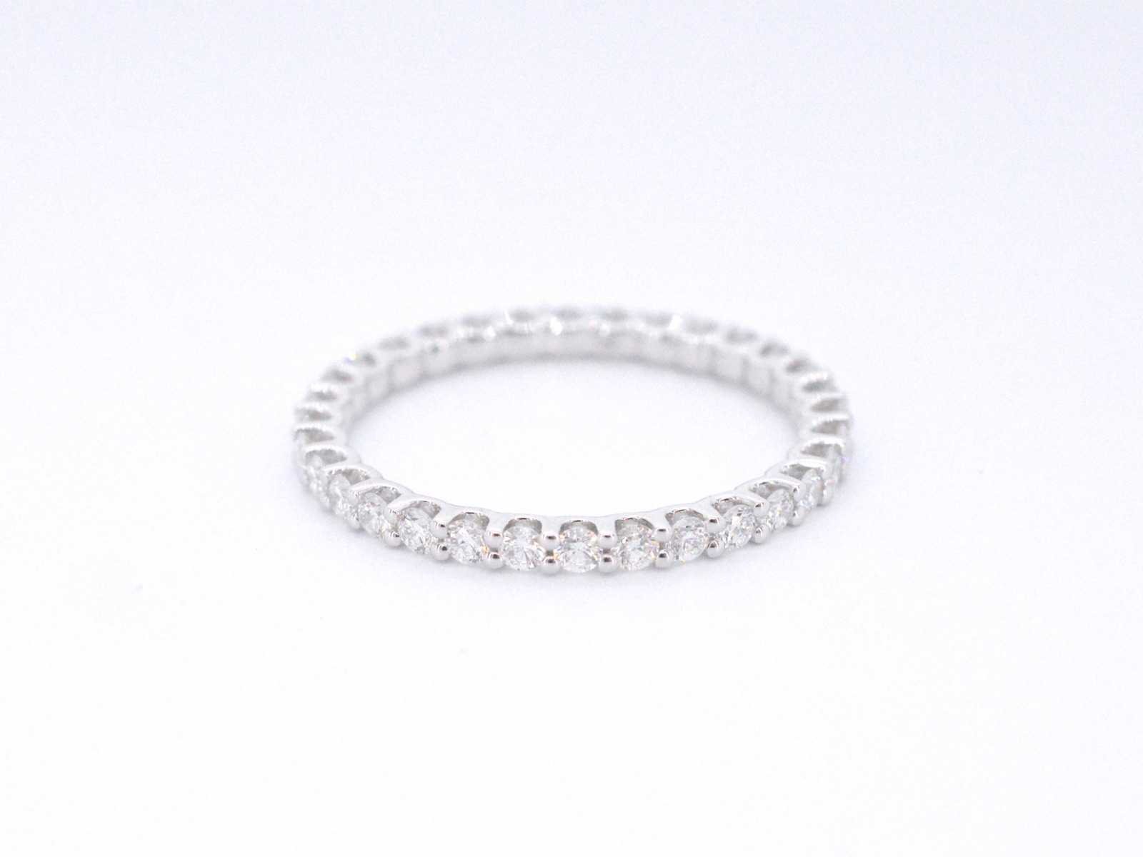 Samenvatting van gegevens Witgouden alliance ring met briljant geslepen diamant Diamant: Natuurlijk; Aantal: 32 stuks; Slijpvorm: Briljant geslepen; Gewicht (carat): 0.75 carat; Kleur: F-G; Zuiverheid: VS; Slijpkwaliteit: Zeer mooi; Juweel: Ring; Gewicht: 1.3 gram; Ringmaat (op maat gemaakt*): 53 (17 mm); Materiaal: 18K goud (750); Conditie: Nieuw; Verpakking: Luxe sieradendoos; Toelichting: De kwaliteit is overgenomen van het rapport behorend bij item. De waardebepaling is een beoordeling van een gecertificeerde diamantair, gebaseerd op consumentenprijzen.; Consumentenprijs: € 4.218,- Within 14 days Materiaal: Goud Voornaamste diamant: Natuurlijk Gewicht diamant: 0.75ct Totaal gewicht: 1.3g Keurmerk: 750 Lage schatting: 3374€ Hoge schatting: 4218€ Kleur diamant: F-G Slijpvorm diamant: Briljant geslepen Slijpkwaliteit diamant: Zeer mooi Zuiverheidsgraad diamant: VS