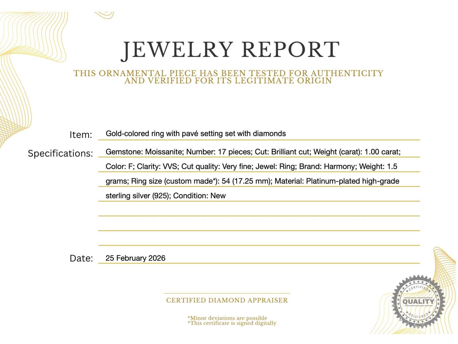 Samenvatting van gegevens Goudkleurige ring met pavézetting bezet met briljanten Edelsteen: Moissaniet; Aantal: 17 stuks; Slijpvorm: Briljant geslepen; Gewicht (carat): 1.00 carat; Kleur: F; Zuiverheid: VVS; Slijpkwaliteit: Zeer mooi; Juweel: Ring; Merk: Harmony; Gewicht: 1.5 gram; Ringmaat (op maat gemaakt*): 54 (17.25 mm); Materiaal: Geplatineerd hoog gehalte sterling zilver (925); Conditie: Nieuw; Verpakking: sieradendoos of fluwelen etui; Toelichting: De kwaliteit is overgenomen van het rapport behorend bij item. De waardebepaling is een beoordeling van een gecertificeerde diamantair, gebaseerd op consumentenprijzen.; Extra informatie: Meerdere kleine elementen zichtbaar.; Consumentenprijs: € 1.000,- Within 14 days Materiaal: Zilver Edelsteen: Moissaniet Totaal gewicht: 1.5g Keurmerk: 925 Lage schatting: 800€ Hoge schatting: 1000€ Kleur edelsteen: F Slijpvorm edelsteen: Briljant geslepen Slijpkwaliteit edelsteen: Zeer mooi Zuiverheidsgraad edelsteen: VVS