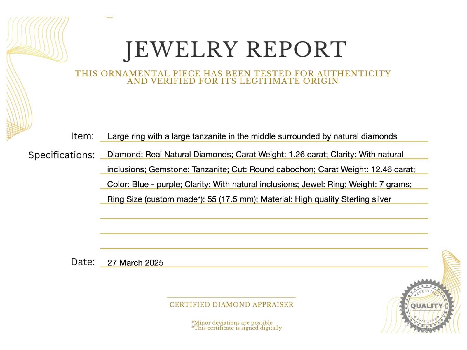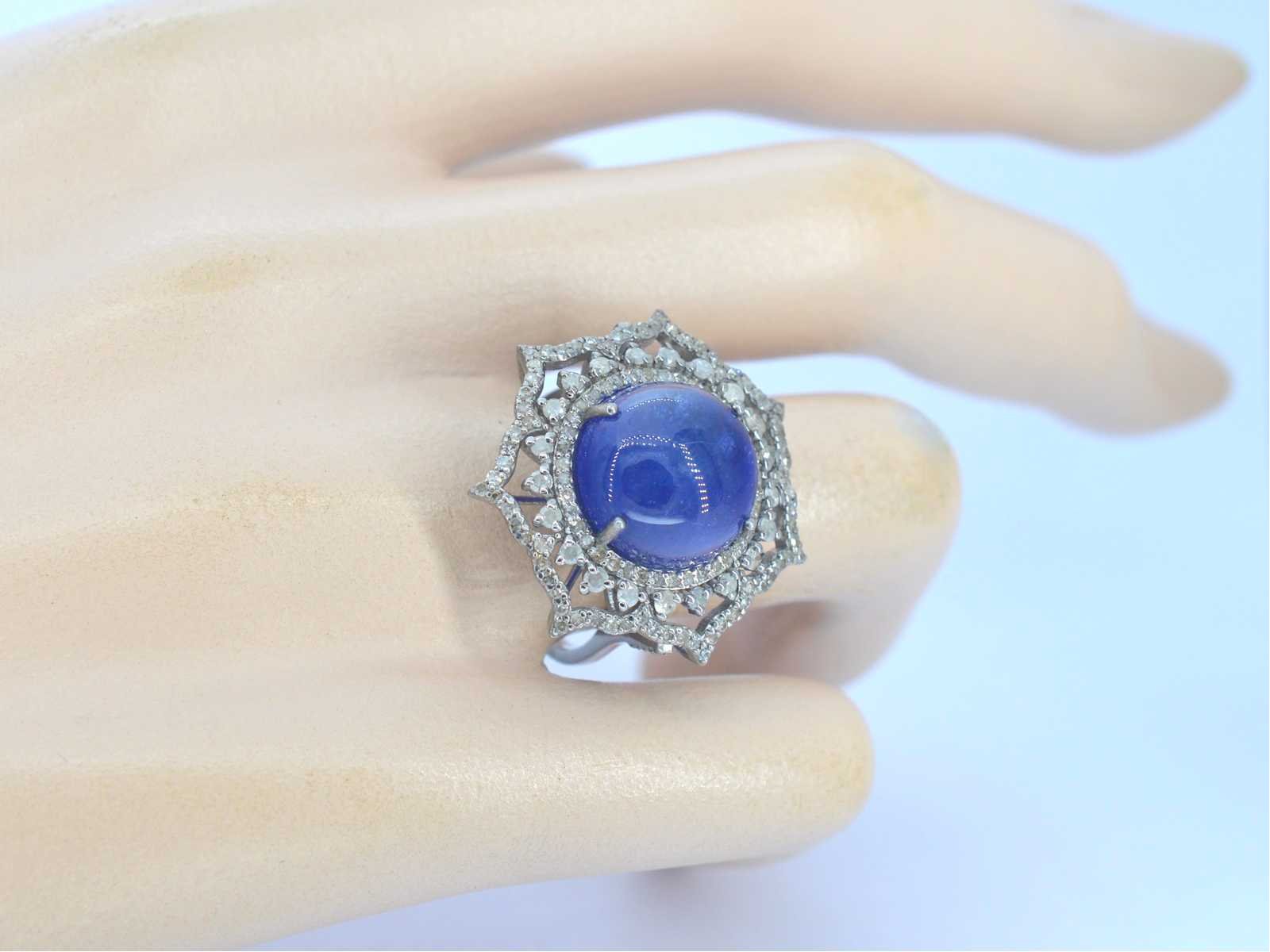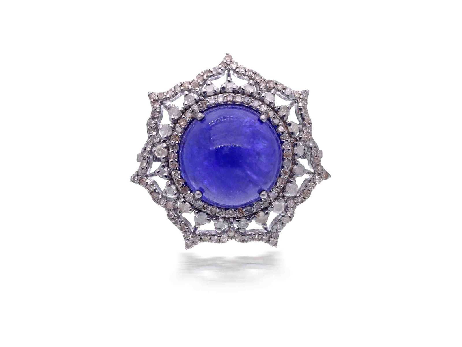Samenvatting van gegevens Groot uitgevoerde ring met in het midden een grote tanzaniet omringt door natuurlijk diamanten Diamant: Echte Natuurlijk diamanten; Gewicht (carat): 1.26 carat; Zuiverheid: Met natuurlijke insluitsels; Edelsteen: Tanzaniet; Slijpvorm: Rond cabochon; Gewicht (carat): 12.46 carat; Kleur: Blauw - paars; Zuiverheid: Met natuurlijke insluitsels; Juweel: Ring; Gewicht: 7 gram; Ringmaat (op maat gemaakt*): 55 (17.5 mm); Materiaal: Hoge kwaliteit Sterling zilver; Conditie: Vintage; Verpakking: Sieradendoos of fluwelen etui; Toelichting: De kwaliteit is overgenomen van het rapport behorend bij item. De waardebepaling is een beoordeling van een gecertificeerde diamantair, gebaseerd op consumentenprijzen.; Extra informatie: Dit is een met de hand vervaardigd sieraad.; Consumentenprijs: € 3.075,- Within 14 days Materiaal: Zilver Voornaamste diamant: Echte Natuurlijk diamanten Gewicht diamant: 1.26ct Edelsteen: Tanzaniet Totaal gewicht: 7g Lage schatting: 2460€ Hoge schatting: 3075€ Zuiverheidsgraad diamant: Met natuurlijke insluitsels Kleur edelsteen: Blauw - paars Slijpvorm edelsteen: Rond cabochon Zuiverheidsgraad edelsteen: Met natuurlijke insluitsels