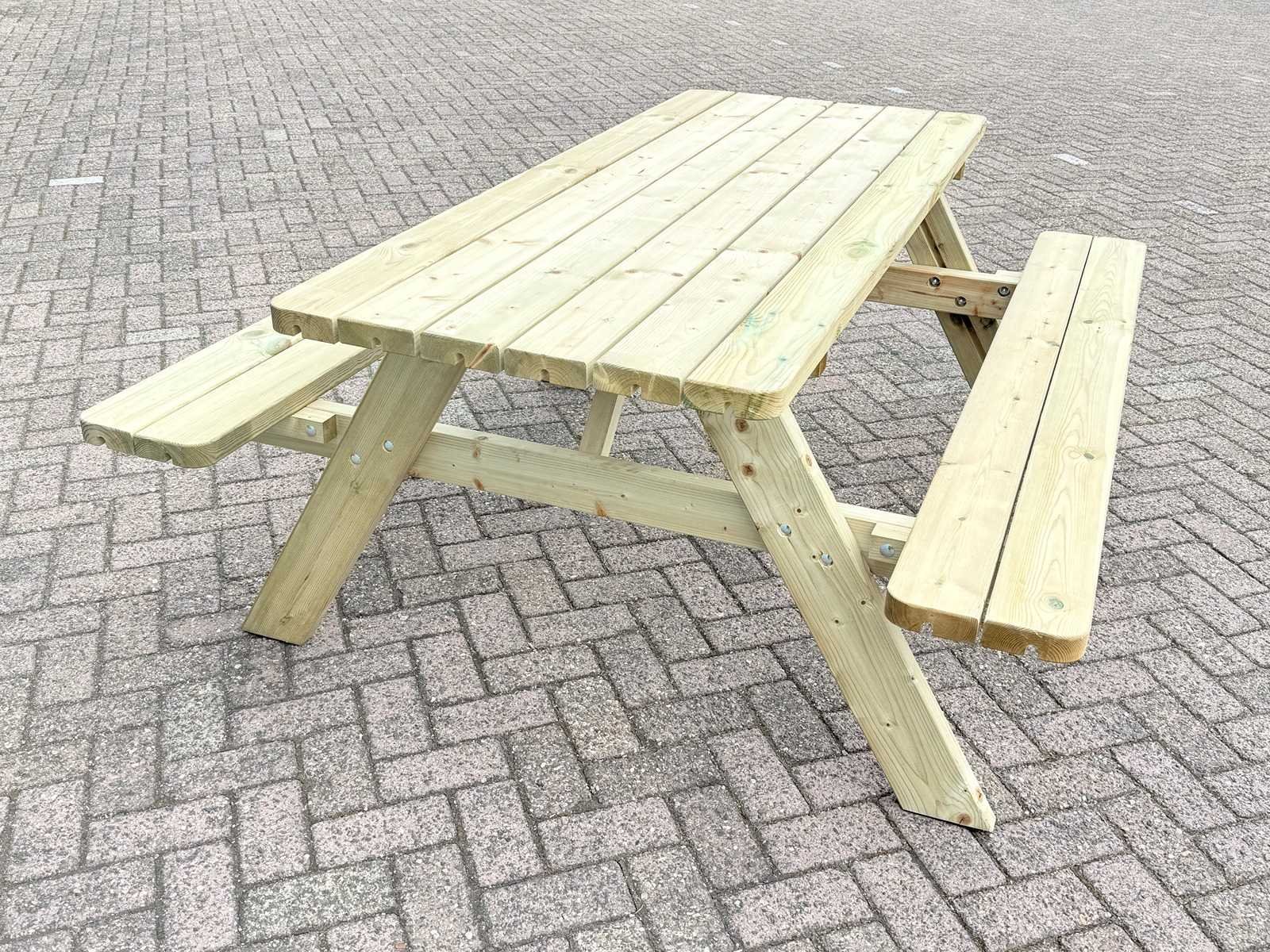 Degelijke Picknicktafel. zware kwaliteit 38mm dik hout. Geimpregneerd. Ongebruikt! Zitgedeelte is opklapbaar. Lengte ±1780mm / Hoogte ±760mm / Totale breedte ±1520mm Word als bouwpakket meegeleverd. Zie laatste foto. Lengte: 177cm Breedte: 152cm Hoogte: 76cm