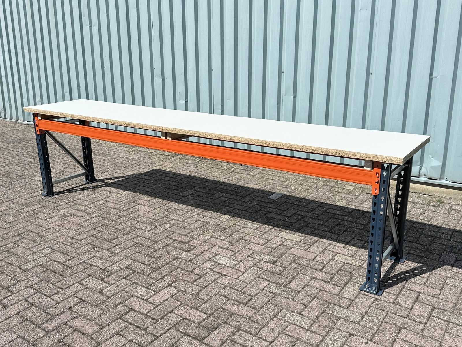 Zware werkbank uitgevoerd met gladde 38mm dikke platen. bovenblad in 2 delen. Belasting tot 1000kg !! Super stevig. Makkelijk in elkaar te klikken. Werkbank is nog niet gebruikt, dus super netjes. Bladmaat: ±3605x700x38mm Framemaat: ±3460x600mm Goede en fijne werkhoogte: ±905mm (bovenkant werkblad) Gemakkelijk in elkaar te zetten. Word meegegeven zoals op laatste 2 foto's. Is met heftruck te laden. Breedte: 700mm Lengte: 3605mm Hoogte: 905mm