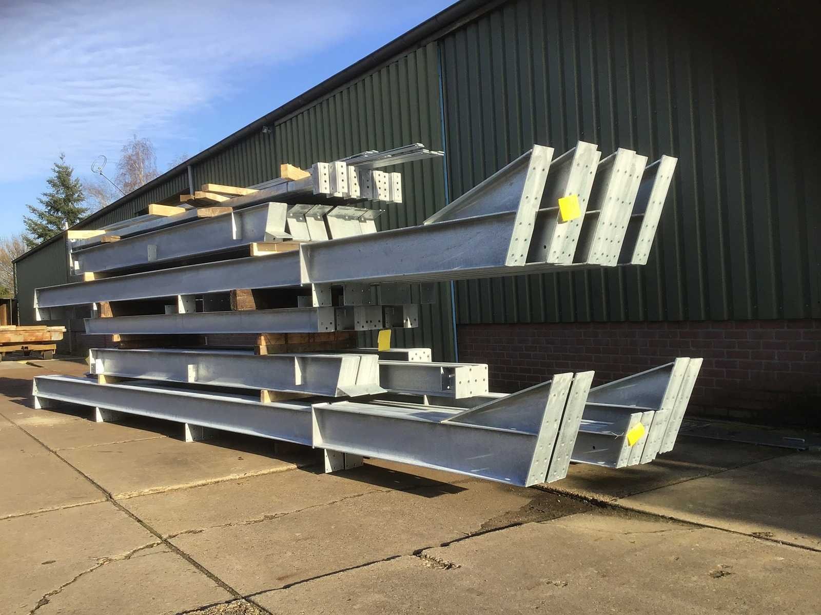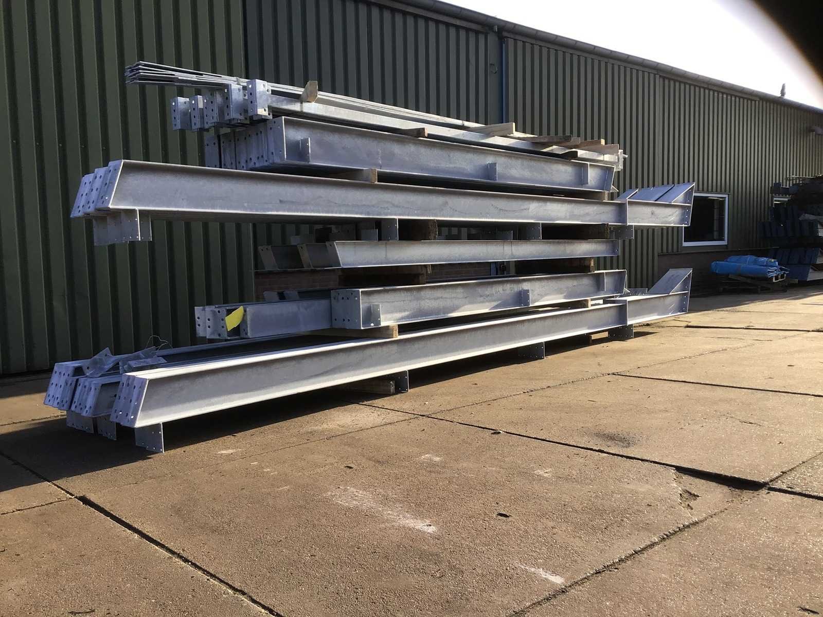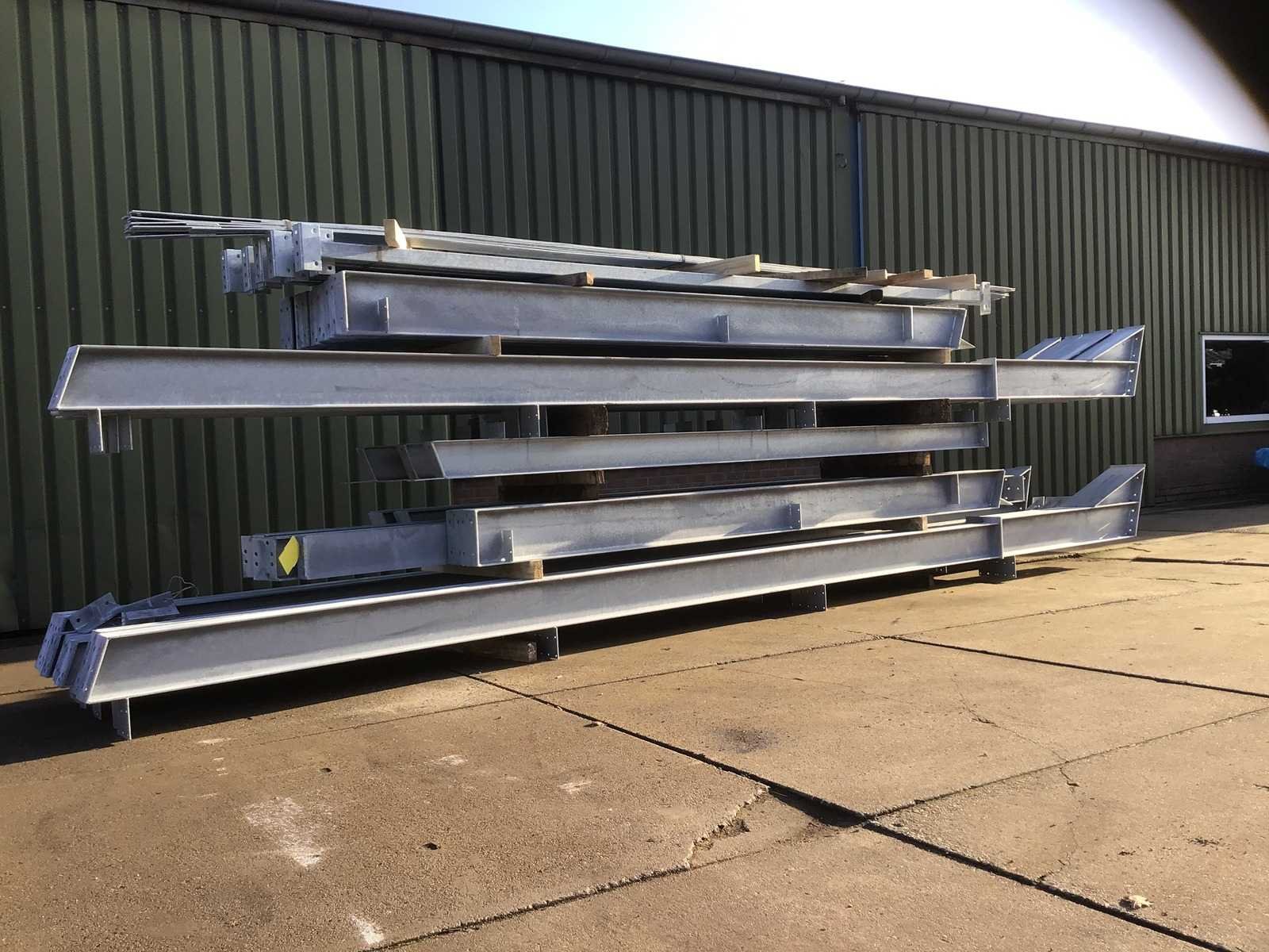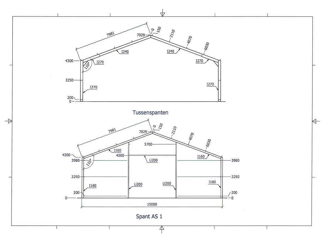 Dakhelling 20 graden Constructie bestaat uit: 5 Tussenspanten: 2 x kolom I270 en de eerste 1,70 mtr. v.d. dakligger I270, de rest v.d. dakligger I240 1 Eindspant: 2 x hoekkolom I180, 2 x dakligger I180 en 2 x tussenkolom I200 1 Eindspant: 2 x hoekkolom I180, 2 x dakligger I180, 2 x tussenkolom U200 en 1x deurbalk U200 a 5,00 mtr. 10 Koppelbuizen 70 x 70 x 3 24 Windverbandstrippen plat 5O x 6 met spanner M16 Verzinkt Schroeven 8.8 Met NEN 1090 CE Markering Certificaat Kavel wordt met een heftruck gratis geladen Materiaal: staal verzinkt Bouwjaar: 2026 Goot hoogte: 4300.00mm Nok hoogte: 7029.00mm Totale afmeting L: 30000.00mm Totale afmeting Breedte: 15000.00mm