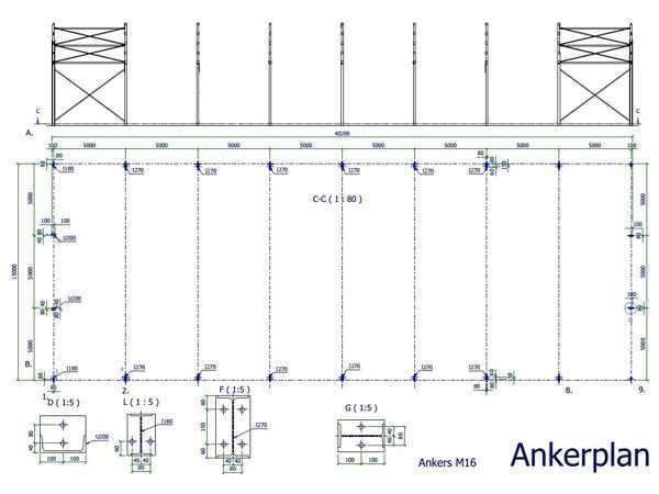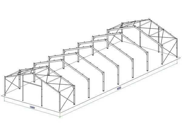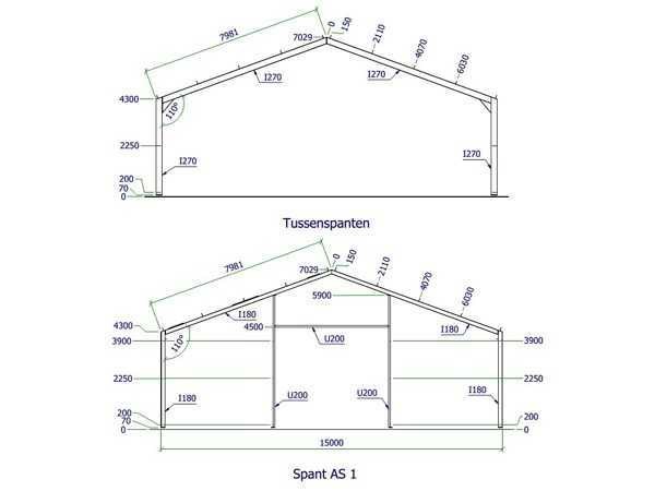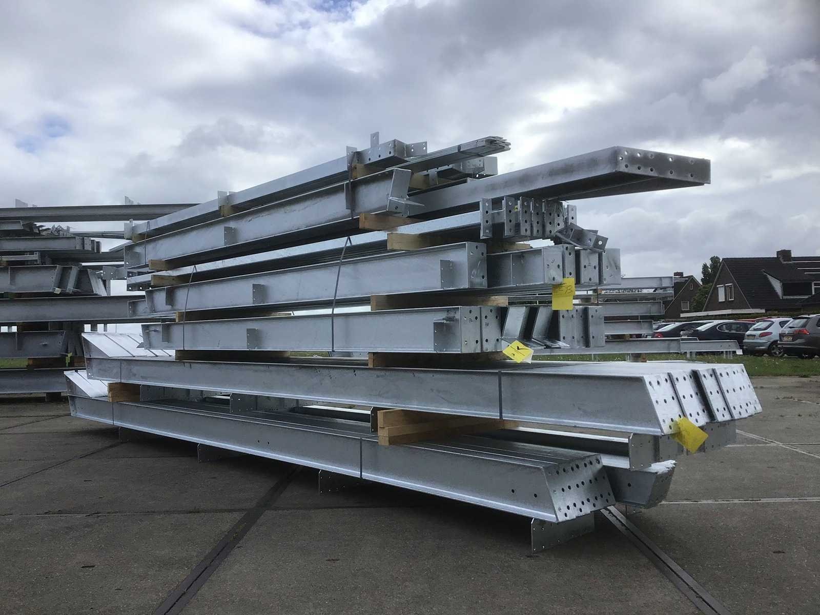 Dakhelling 20 graden Constructie bestaat uit: 7 Tussenspanten: 2x kolom I270 en 2x dakligger I270 1 Eindspant: 2x hoekkolom I180, 2x dakligger I180 en 2x tussenkolom I200 1 Eindspant: 2x hoekkolom I180, 2x dakligger I180, 2x tussenkolom U200 en 1x deurbalk U200 à 5 meter 10 Koppelbuizen 70x70x3 mm 24 Windverbandstrippen plat 50x6 mm met spanner M16 Verzinkt Schroeven 8.8 Inclusief NEN 1090 CE Markering Certificaat Kavel wordt met een heftruck gratis geladen Materiaal: staal verzinkt Bouwjaar: 2026 Goot hoogte: 4300.00mm Nok hoogte: 7029.00mm Totale afmeting L: 40000mm Totale afmeting Breedte: 15000mm