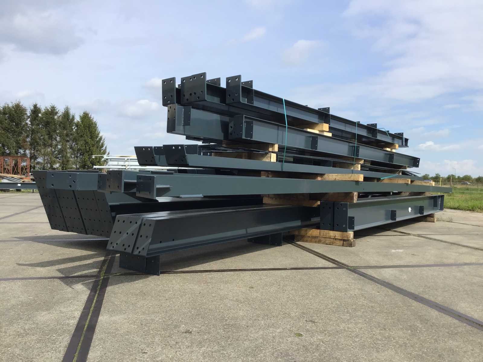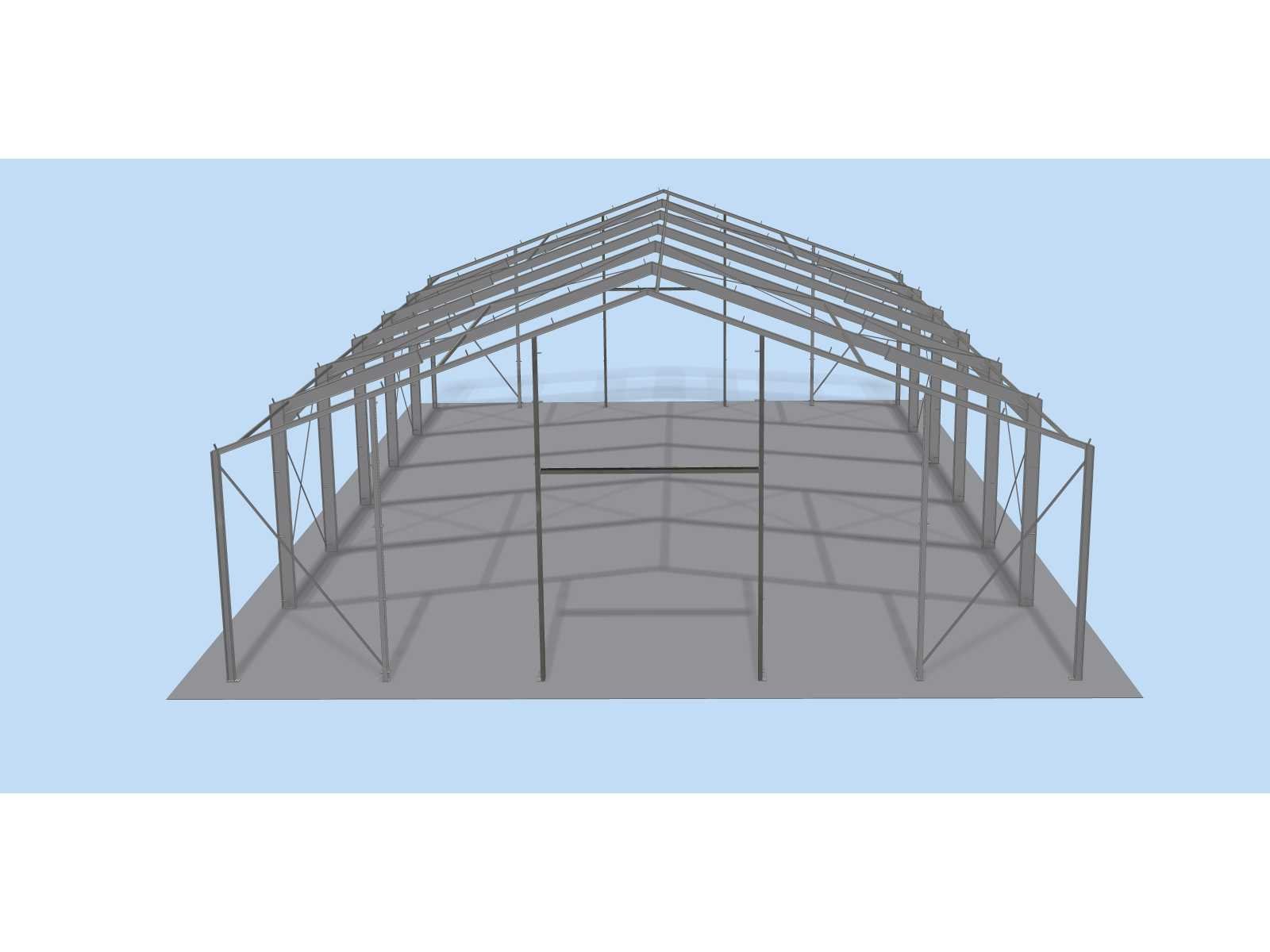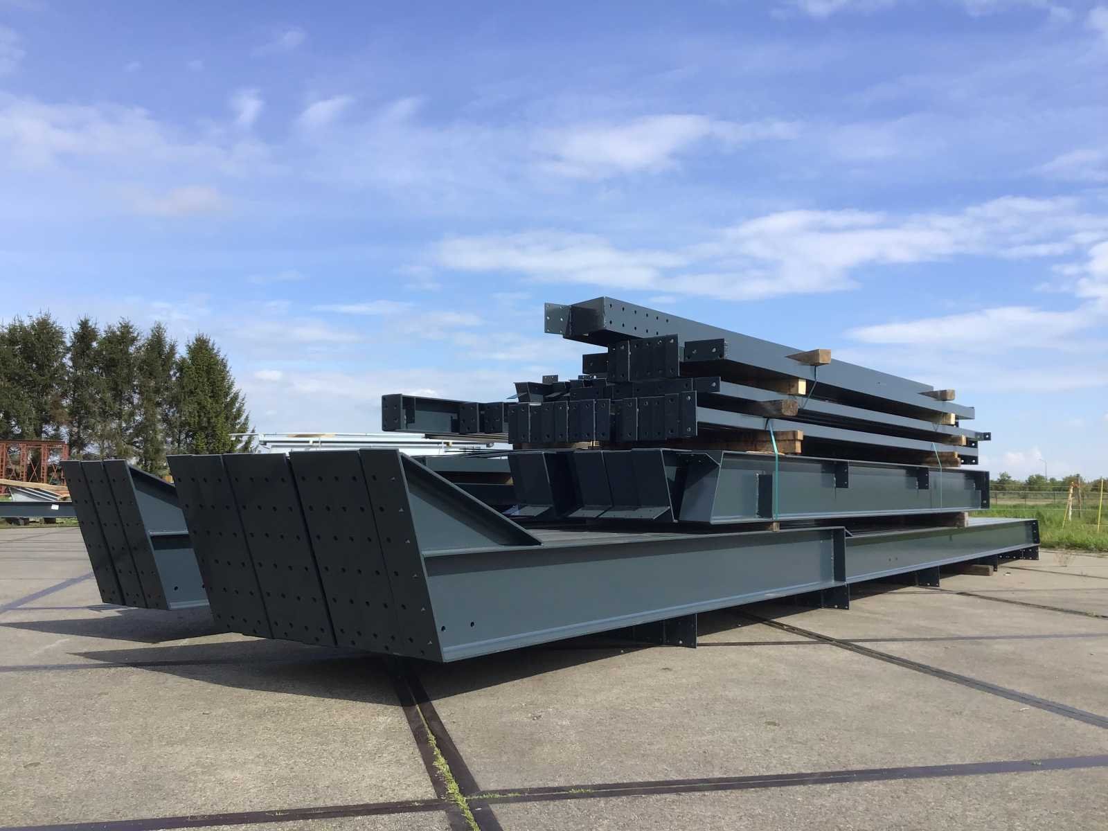 Dakhelling 20 graden Constructie bestaat uit: 5 Tussenspanten: 2 x kolom I330 en de eerste 3,40mtr van de dakligger I330 de rest van de dakligger I270 2 Eindspanten: 2 x hoekkolom H160, 2 x dakligger H120, 2 x tussenkolom I200, 2 x tussenkolom U220 en 1 x deurbalk U220 á 4,50mtr. 26 Koppelbuizen 70 x 70 x 3 28 Windverbandstrippen plat 50 x 6 met spanner m16 Gepoedercoat RAL7016 Schroeven 8.8 Met NEN 1090 CE Markering Certificaat Kavel wordt met een heftruck gratis geladen Materiaal: staal gepoedercoat Bouwjaar: 2026 Goot hoogte: 5000mm Nok hoogte: 8275mm Totale afmeting L: 30000mm Totale afmeting Breedte: 18000mm