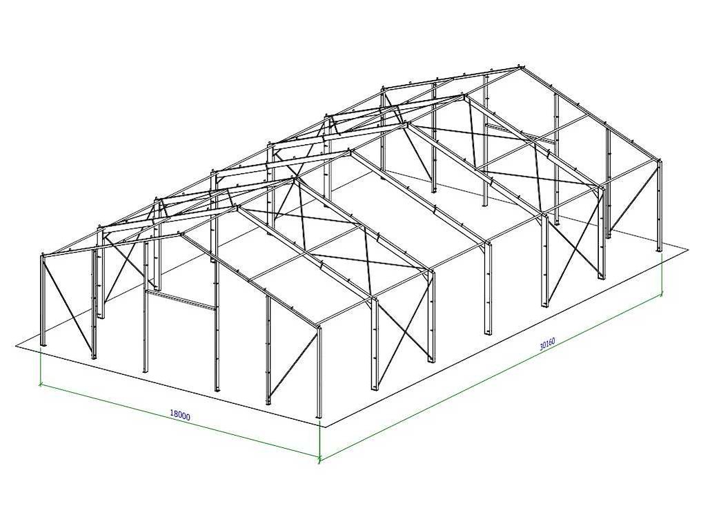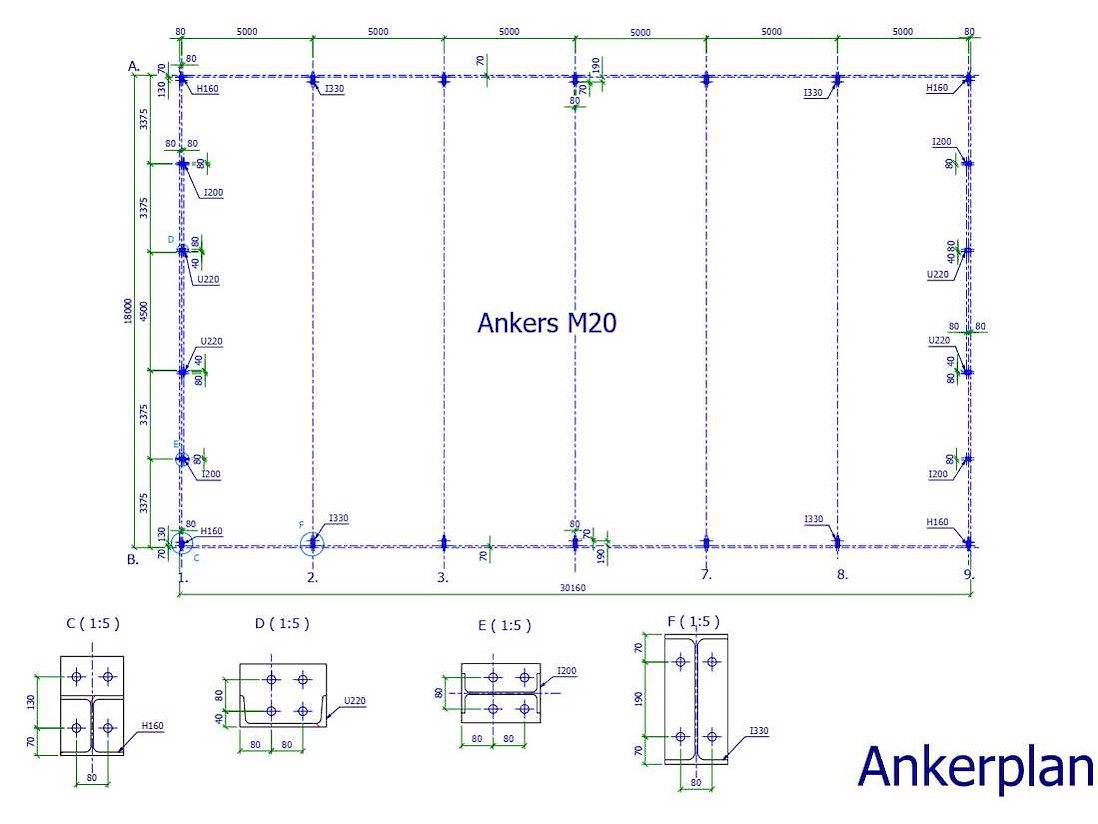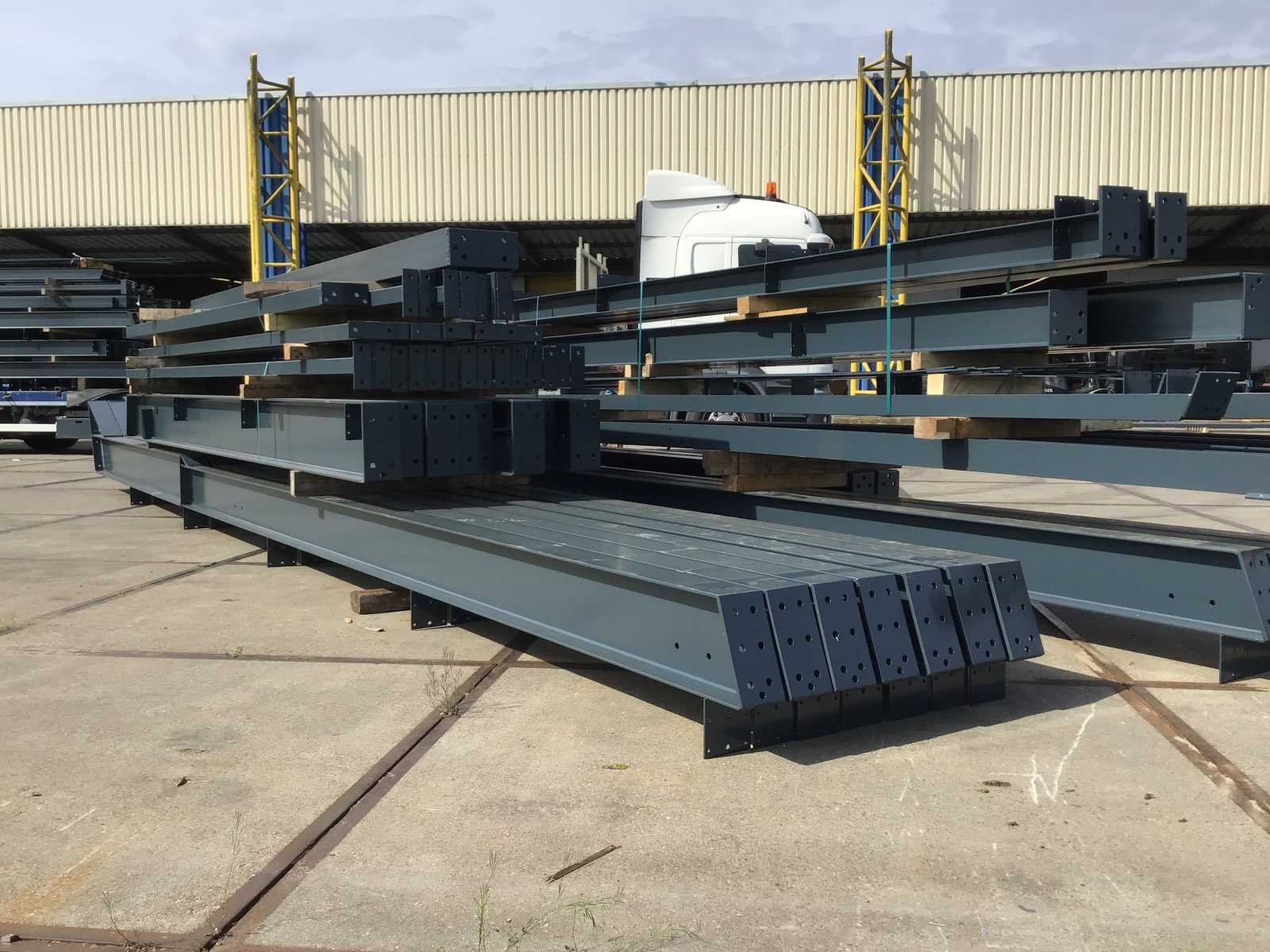 Dakhelling 20 graden Constructie bestaat uit: 5 Tussenspanten: 2 x kolom I330 en de eerste 3,40mtr van de dakligger I330 de rest van de dakligger I270 2 Eindspanten: 2 x hoekkolom H160, 2 x dakligger H120, 2 x tussenkolom I200, 2 x tussenkolom U220 en 1 x deurbalk U220 á 4,50mtr. 26 Koppelbuizen 70 x 70 x 3 28 Windverbandstrippen plat 50 x 6 met spanner m16 Gepoedercoat RAL7016 Schroeven 8.8 Met NEN 1090 CE Markering Certificaat Kavel wordt met een heftruck gratis geladen Materiaal: staal gepoedercoat Bouwjaar: 2026 Goot hoogte: 5000mm Nok hoogte: 8275mm Totale afmeting L: 30000mm Totale afmeting Breedte: 18000mm
