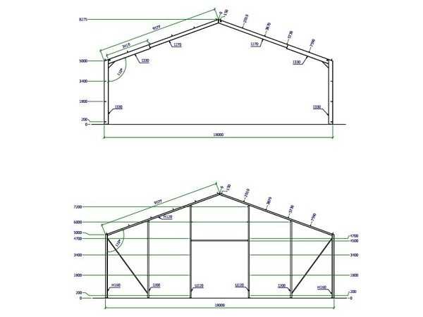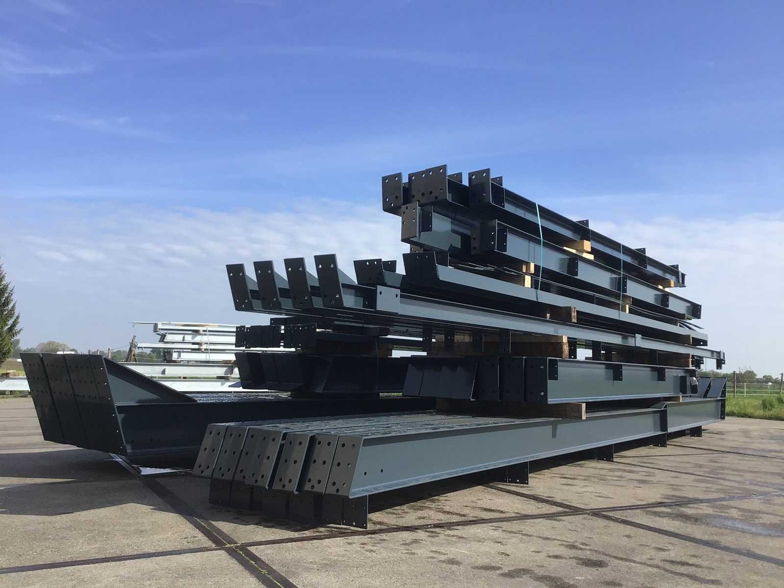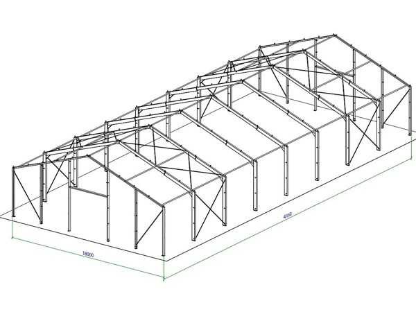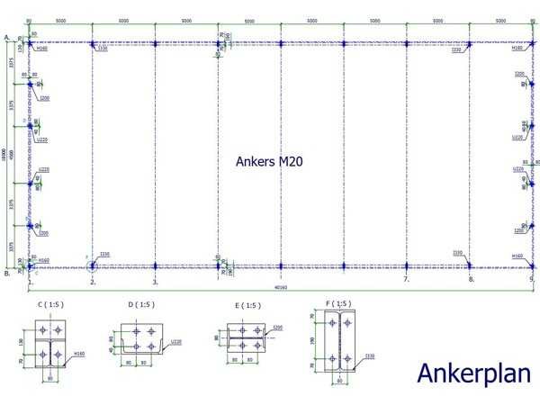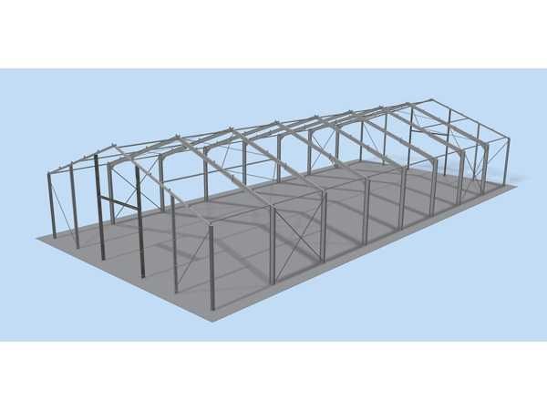 Dakhelling 20 graden Constructie bestaat uit: 7 Tussenspanten: 2 x kolom I330 en de eerste 3,40mtr van de dakligger I330 de rest van de dakligger I270 2 Eindspanten: 2 x hoekkolom H160, 2 x dakligger H120, 2 x tussenkolom I200, 2 x tussenkolom U220 en 1 x deurbalk U220 á 4,50mtr. 32 Koppelbuizen 70 x 70 x 3 mm 28 Windverbandstrippen plat 50 x 6 met spanner M16 Gepoedercoat RAL7016 Schroeven 8.8 Met NEN 1090 CE Markering Certificaat Kavel wordt met een heftruck gratis geladen Materiaal: staal gepoedercoat Bouwjaar: 2026 Goot hoogte: 5000mm Nok hoogte: 8275mm Totale afmeting L: 40000mm Totale afmeting Breedte: 18000mm