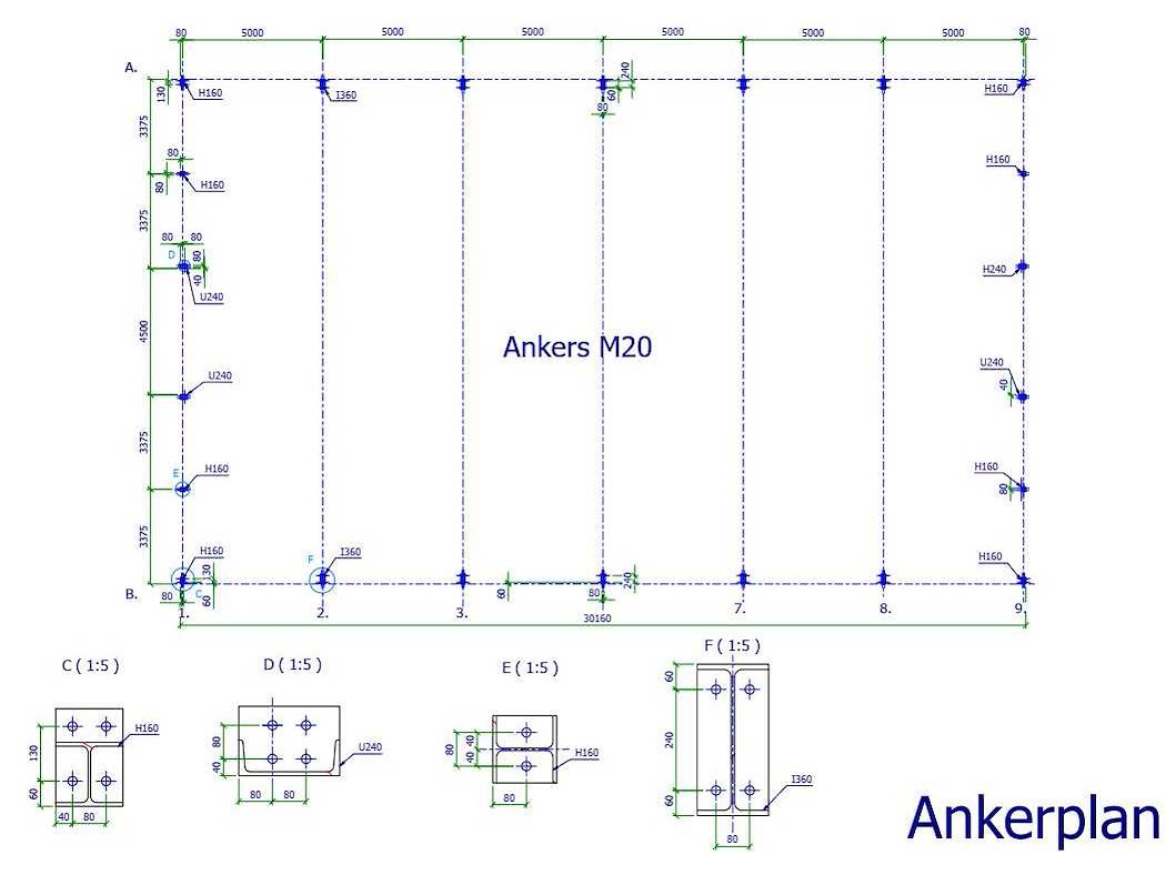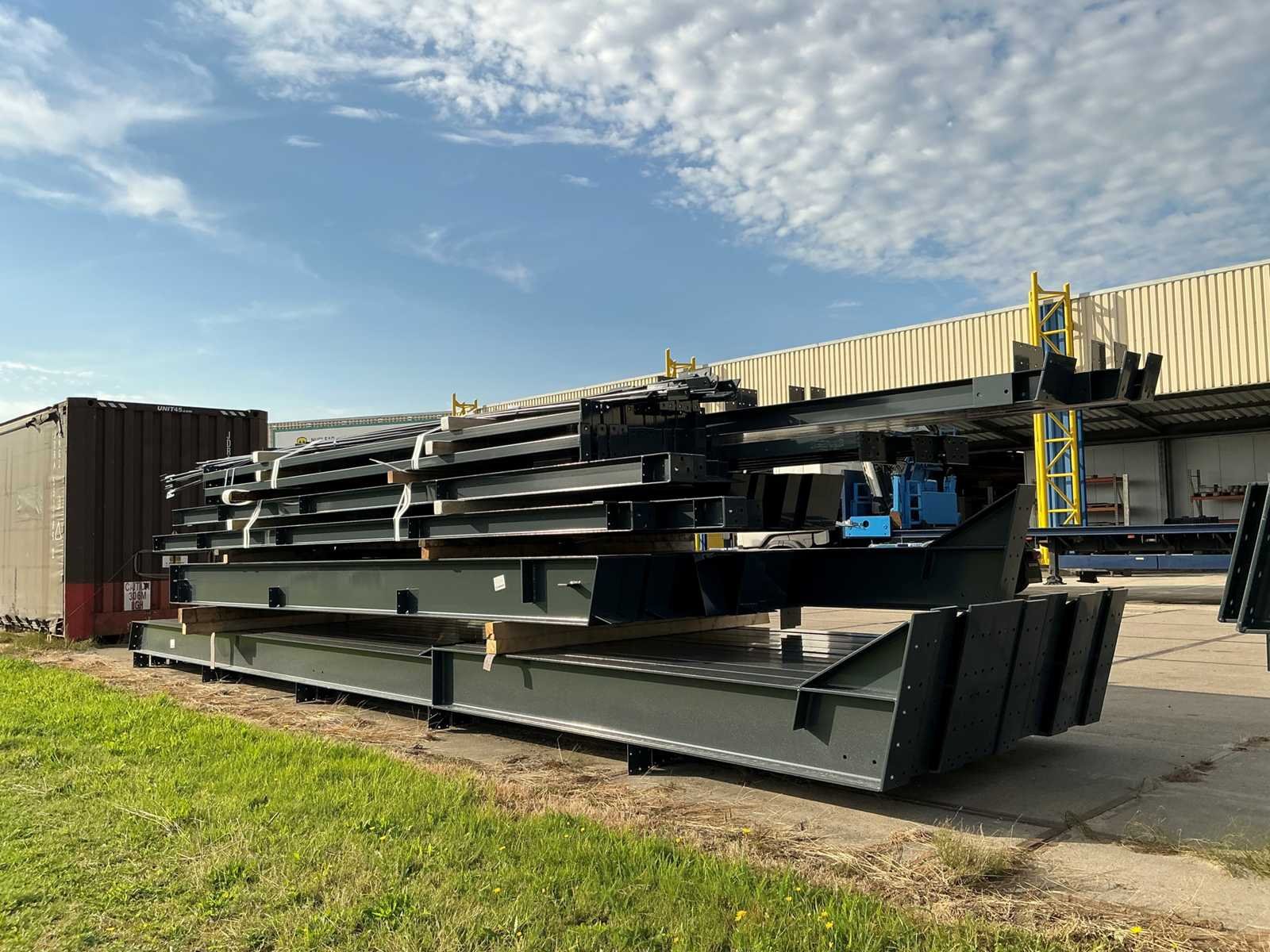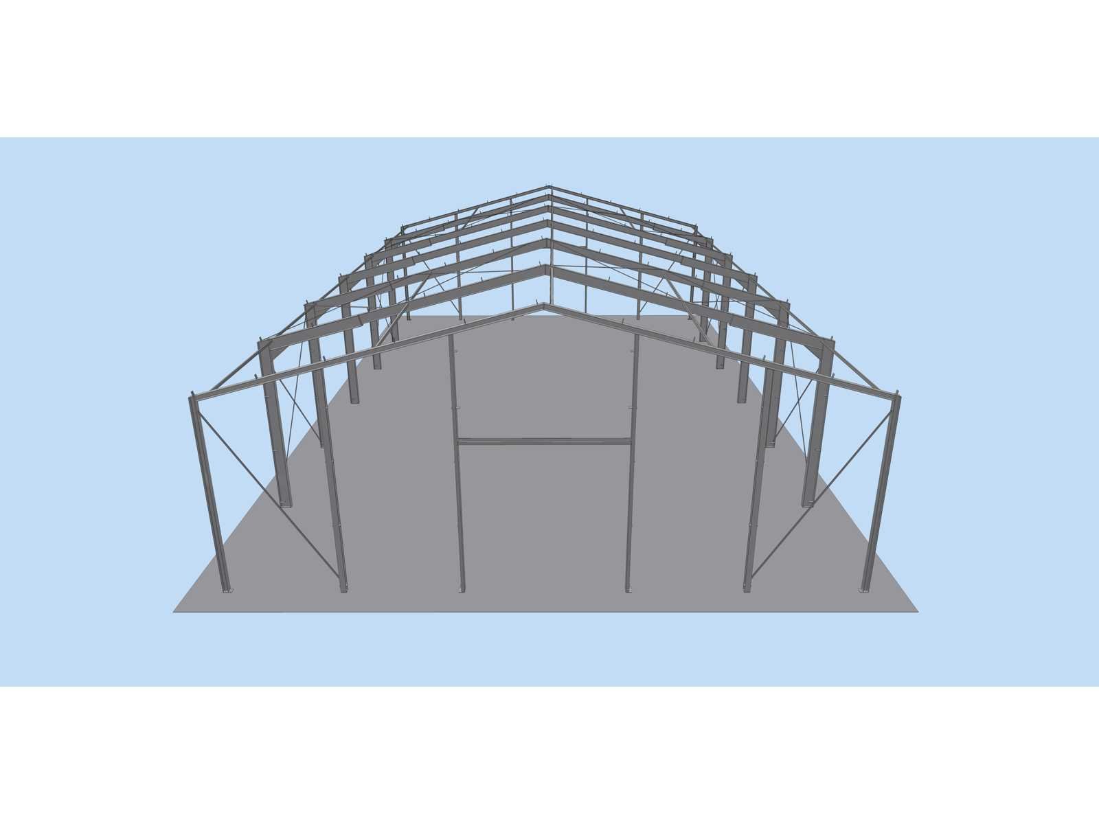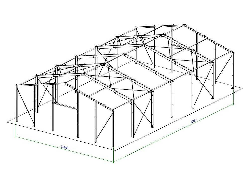 Dakhelling 15 graden Constructie bestaat uit: 5 Tussenspanten: 2 x kolom I360 en de eerste 3,20 mtr van de dakligger I360 en de rest van de dakligger I300 2 Eindspanten: 2 x hoekkolom H160, 2 x dakligger H160, 2 x tussenkolom H160, 2 x tussenkolom U240 en 1 x deurbalk U240 á 5,00mtr. 26 Koppelbuizen 70 x 70 x 3mm 28 Windverband rond 20mm. met spanner m20 Gepoedercoat RAL7016 Schroeven 8.8 Met NEN 1090 CE Markering Certificaat. Kavel wordt met een heftruck gratis geladen Materiaal: staal gepoedercoat Bouwjaar: 2026 Goot hoogte: 5800mm Nok hoogte: 8211mm Totale afmeting L: 30000mm Totale afmeting Breedte: 18000mm