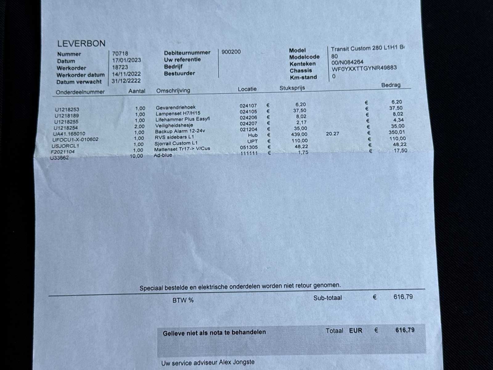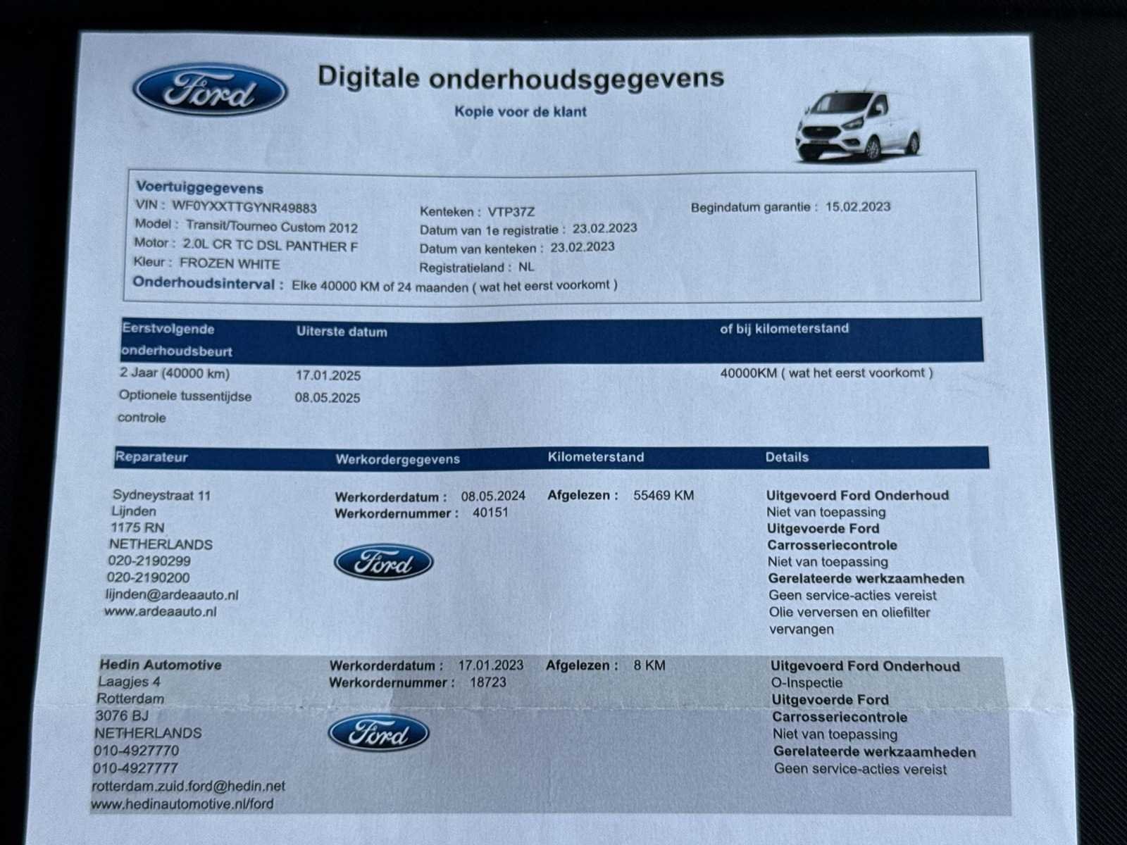 | CRUISE CONTROL | PARKEERSENSOREN | TREKHAAK | SCHUIFDEUR RECHTS | STOELVERWARMING | DEALER ONDERHOUDEN | Kenteken: VTP-37-Z Merk: Ford Type: 280 2.0 TDCI L1H1 Li Model: Transit Custom Bouwjaar: 2023 Chassisnummer: WF0YXXTTGYNR49883 Afgelezen kilometerstand: 72126km Cilinderinhoud: 1995cc Vermogen (kW): 95kW Brandstof: Diesel Datum eerste toelating: 2023-02-23 Datum eerste toelating (NL): 2023-02-23 APK vervaldatum: 2026-02-23 NAP status: Logisch Aandrijving: Start en rijdt Transmissie: Handgeschakeld Aantal zitplaatsen: 3 Kleur: wit Stuurwiel: Linksgestuurd Bruto BPM (NL): 13402 Aantal deuren: 3 Aantal sleutels: 1 Ledig gewicht: 1943kg Laadvermogen: 857kg Vermogen (pk): 127 Aantal cilinders: 4 Carrosserie: Gesloten opbouw Emissieklasse: 6 Onderhoudshistorie: Ja, aanwezig, danwel digitaal Startinformatie: Start en rijdt Maximaal trekgewicht geremd: 750