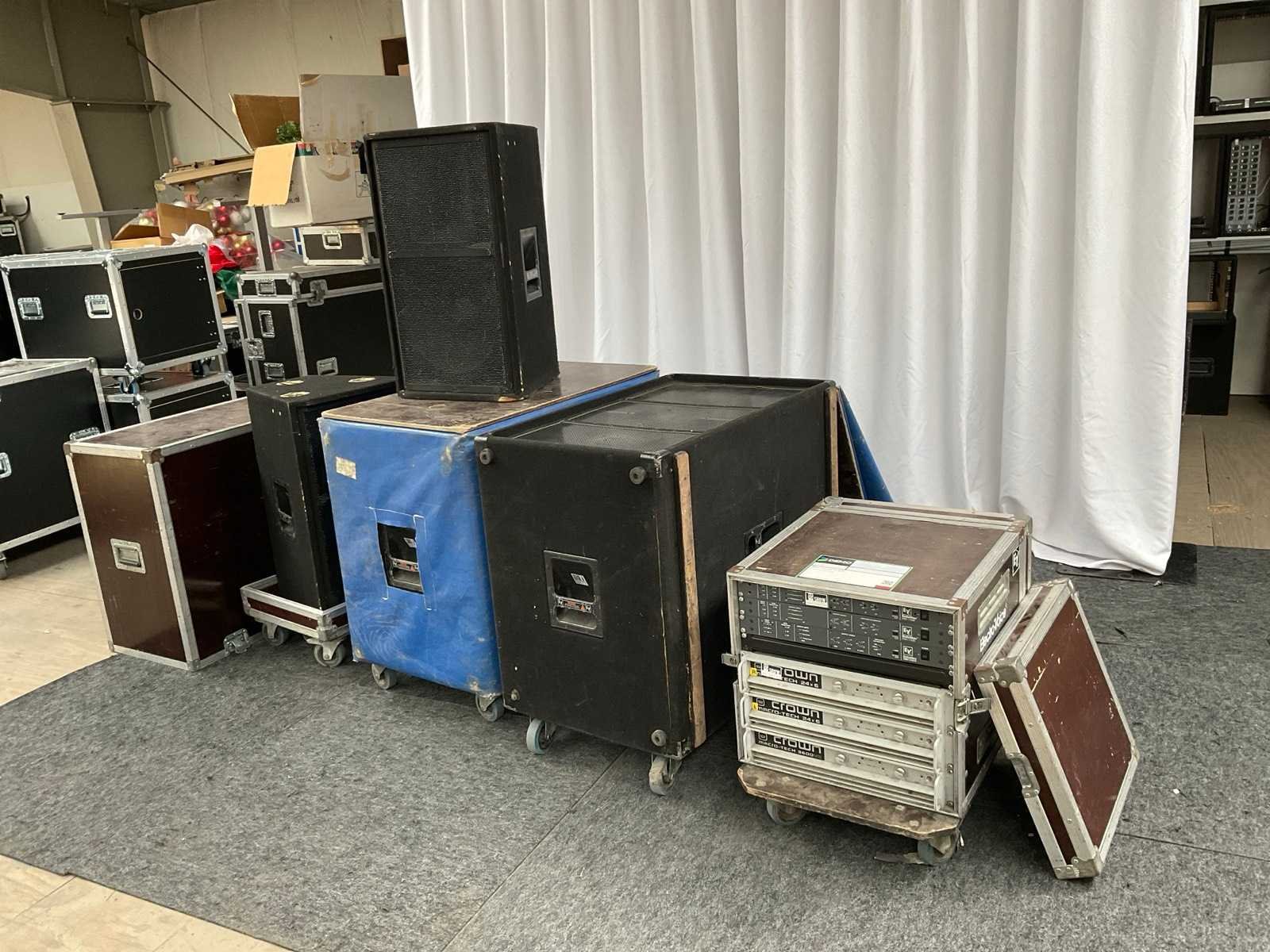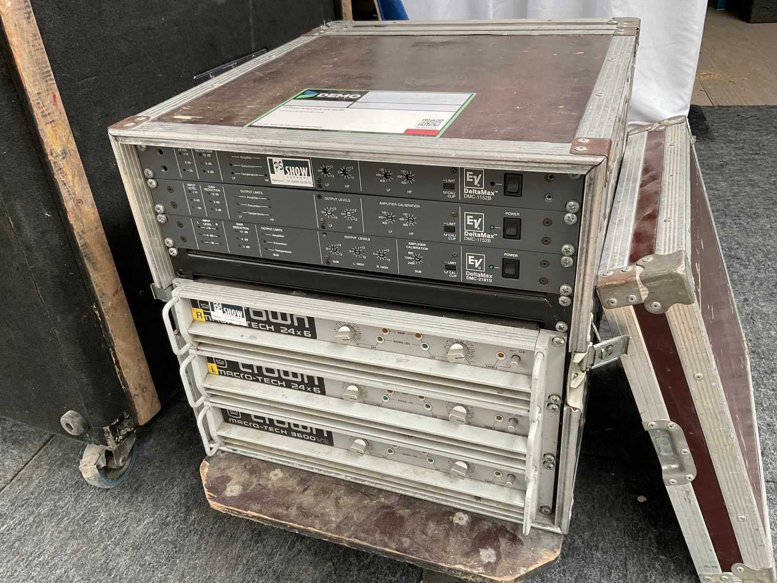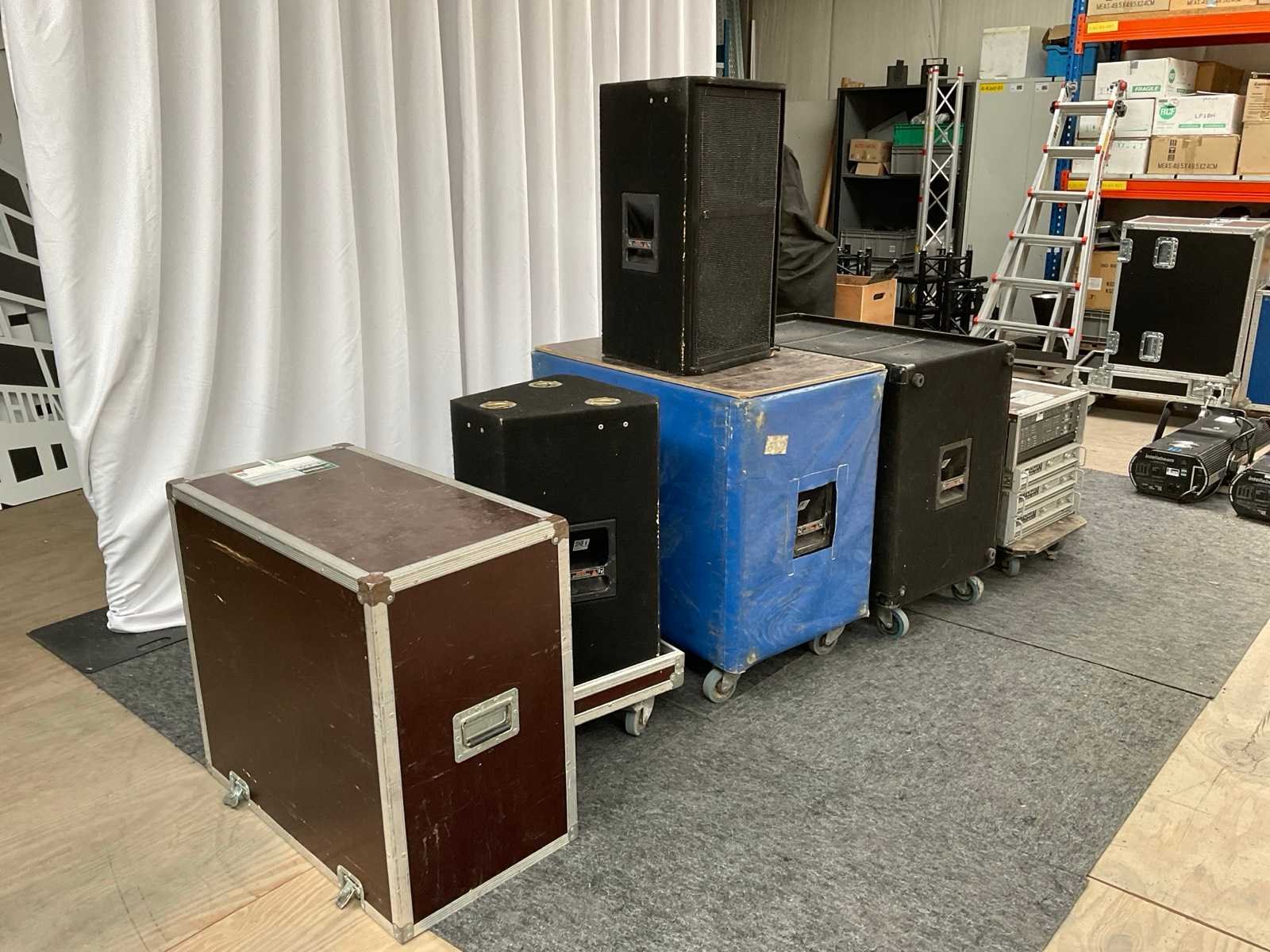 Deltamax Set 2x DML-1152 Top 1x15 inch en 1x3 inch hoog/ 2x DMLX2181 Sub 2x18 inch . Inclusief hoes en Amp-rack Merk: Deltamax Model: Set 2x DML-1152 Top / 2x DMLX2181 Sub