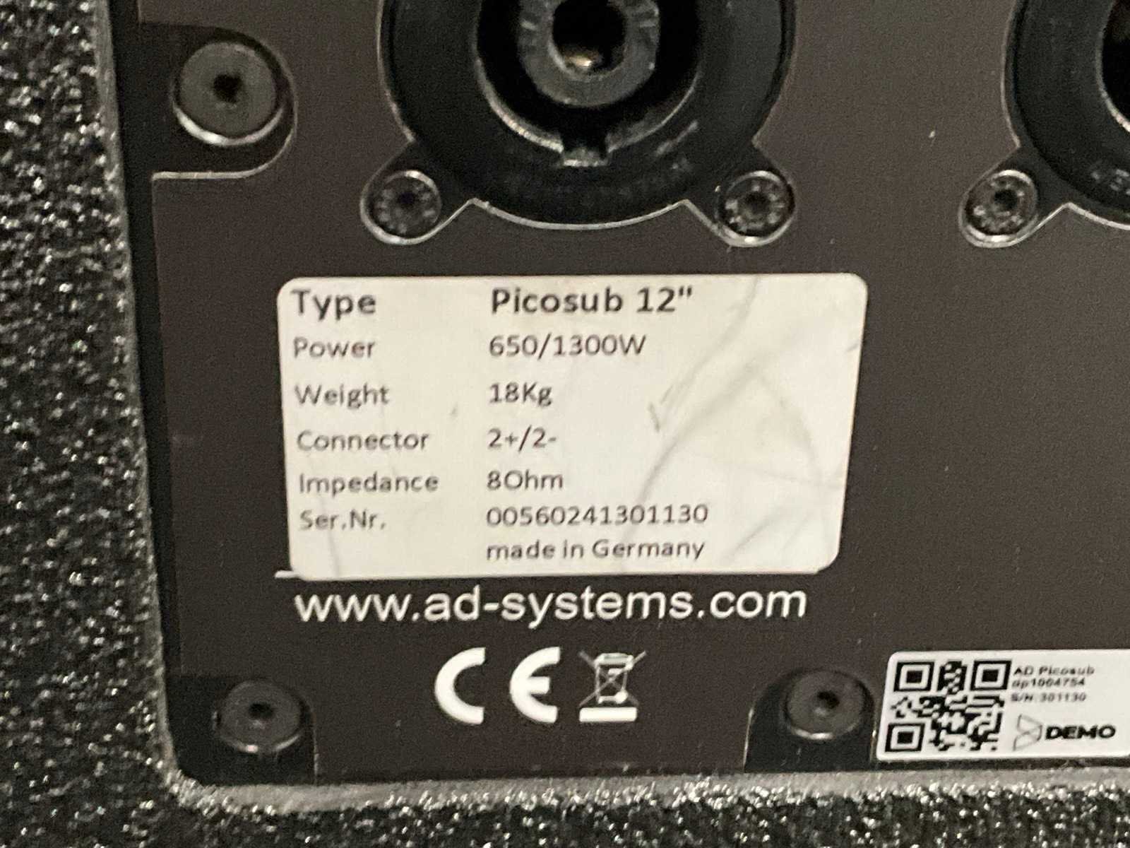 Per 2 in flightcase Merk: AD Model: Picosub DTS: true Impedantie: 8O Wattage: 450W Gewicht: 21.4g Lengte: 500cm Breedte: 450cm Hoogte: 360cm