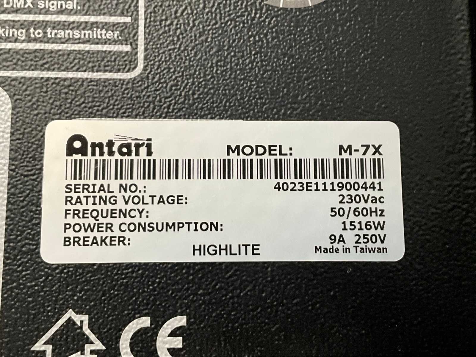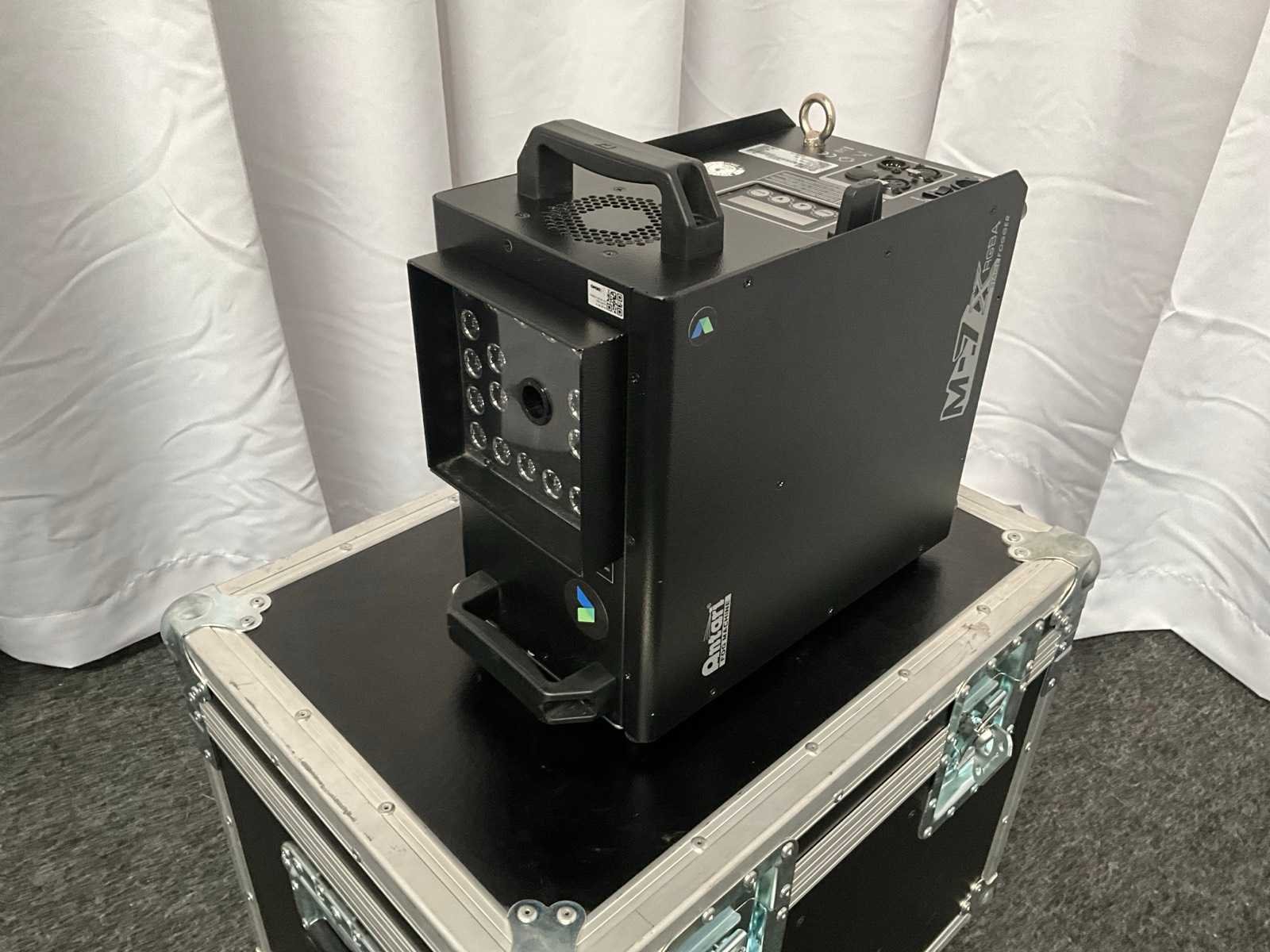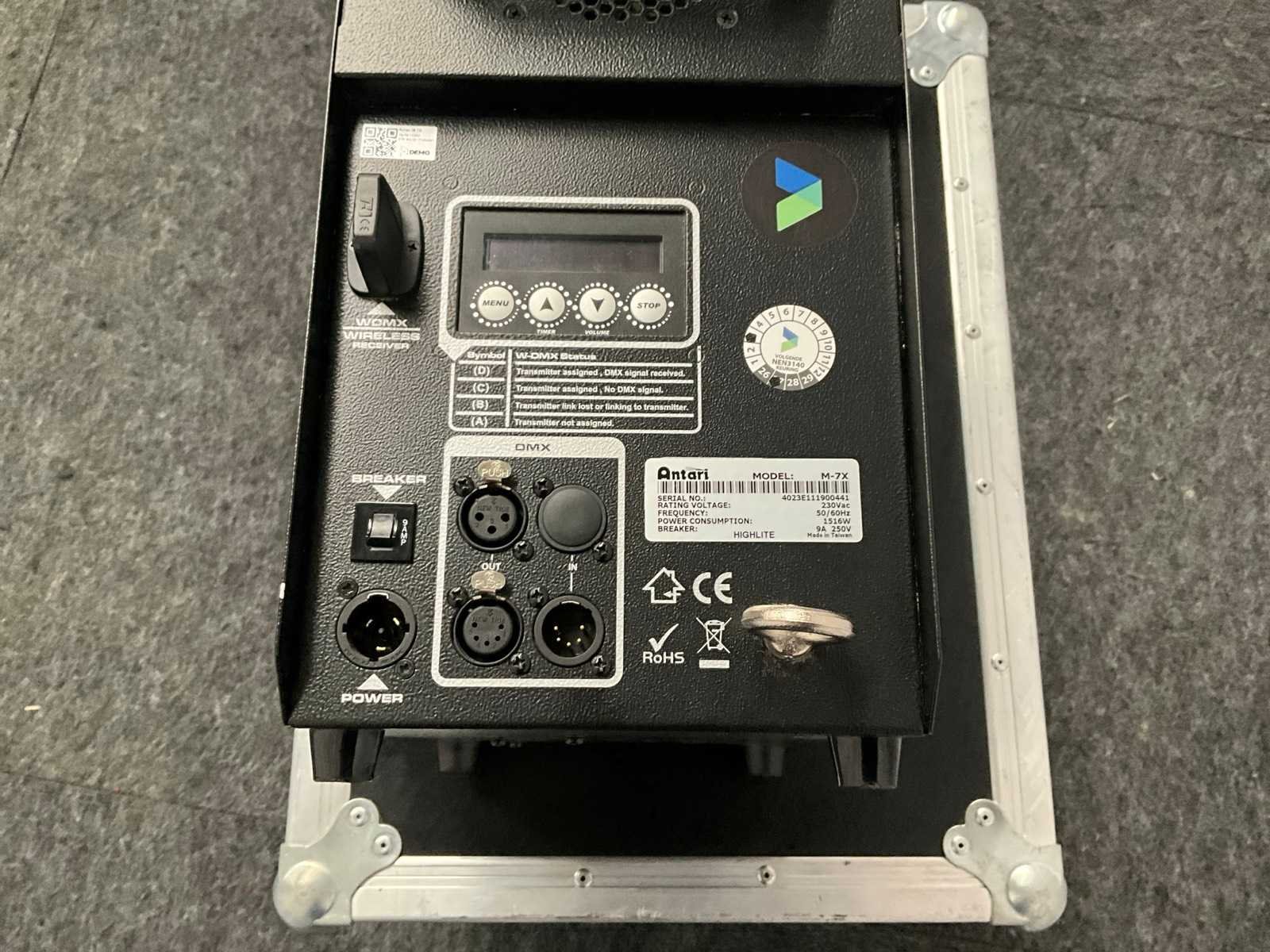 22x 3W LED, 2.4L tank, 200ml/min verbruik max, 1516W, Merk: Antari Type: M-7X RGBA Uitstoottijd: 12min DMX: true Timer: true Met flightcase: true Aansluiting: 240V Totale afmeting L: 346mm Totale afmeting Breedte: 193mm Totale afmeting Hoogte: 383mm Eigen gewicht: 14kg