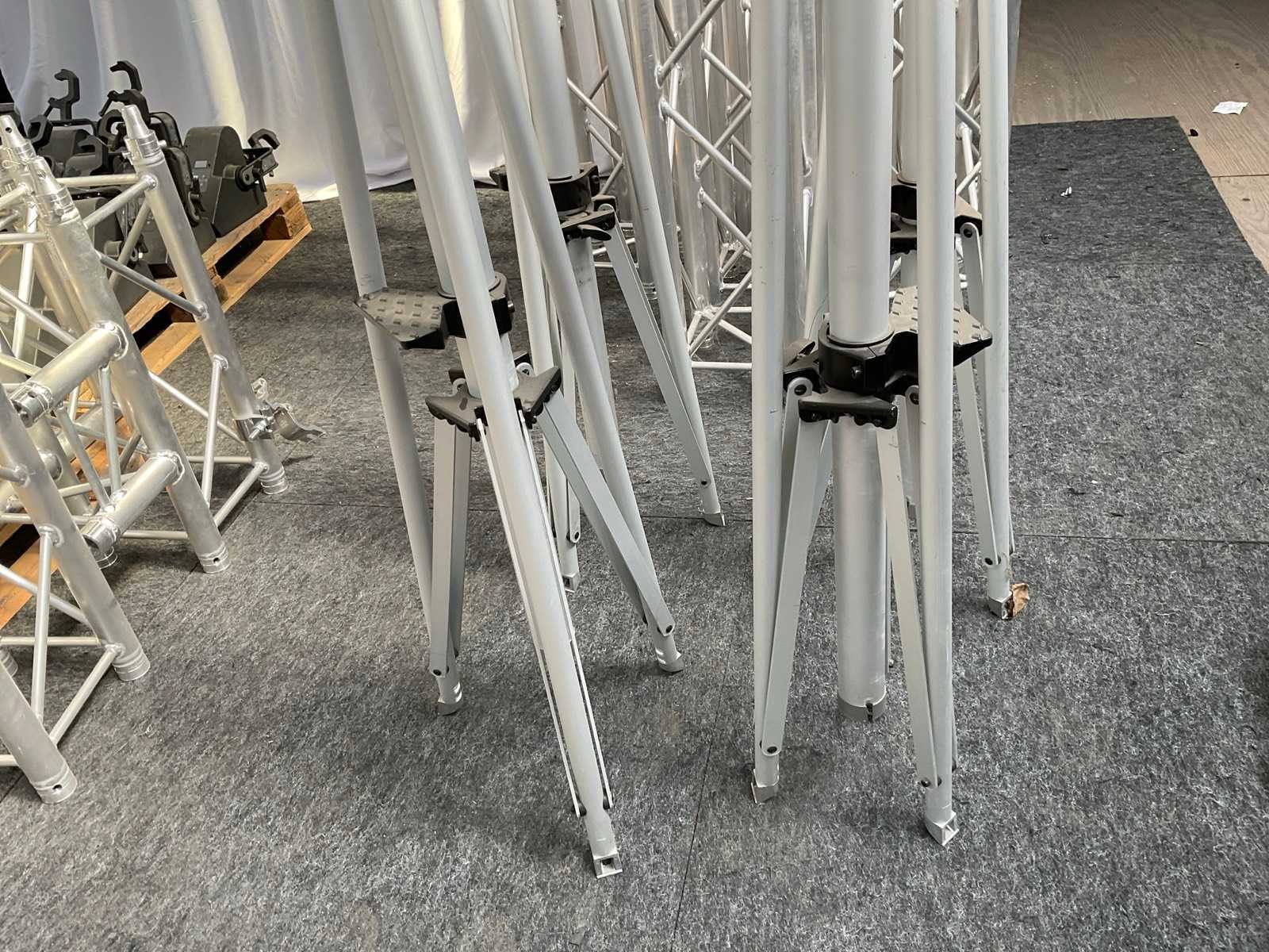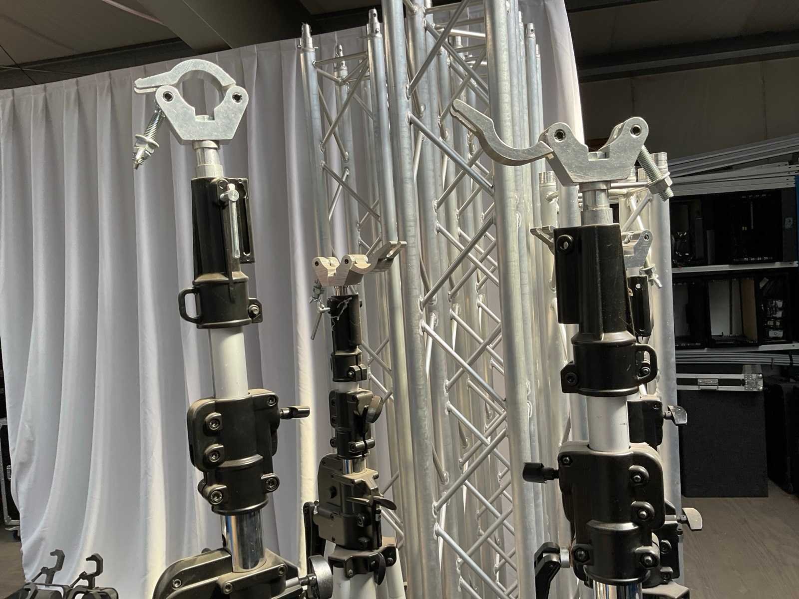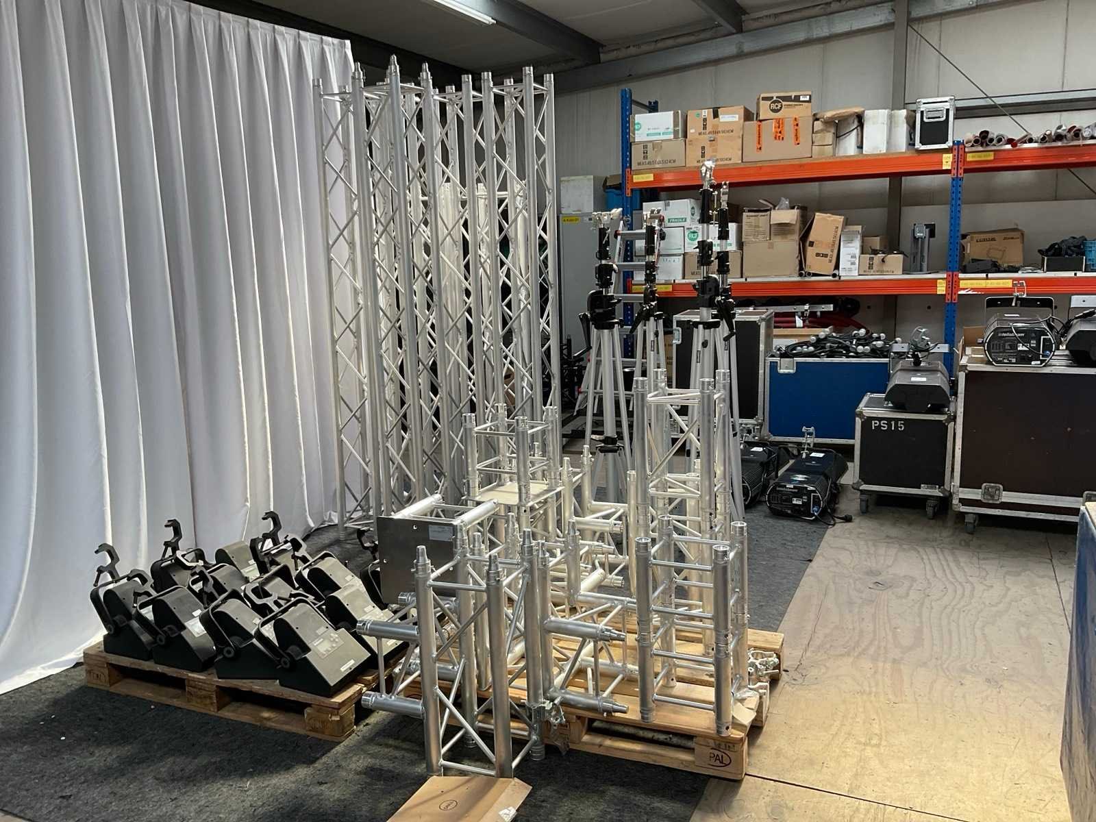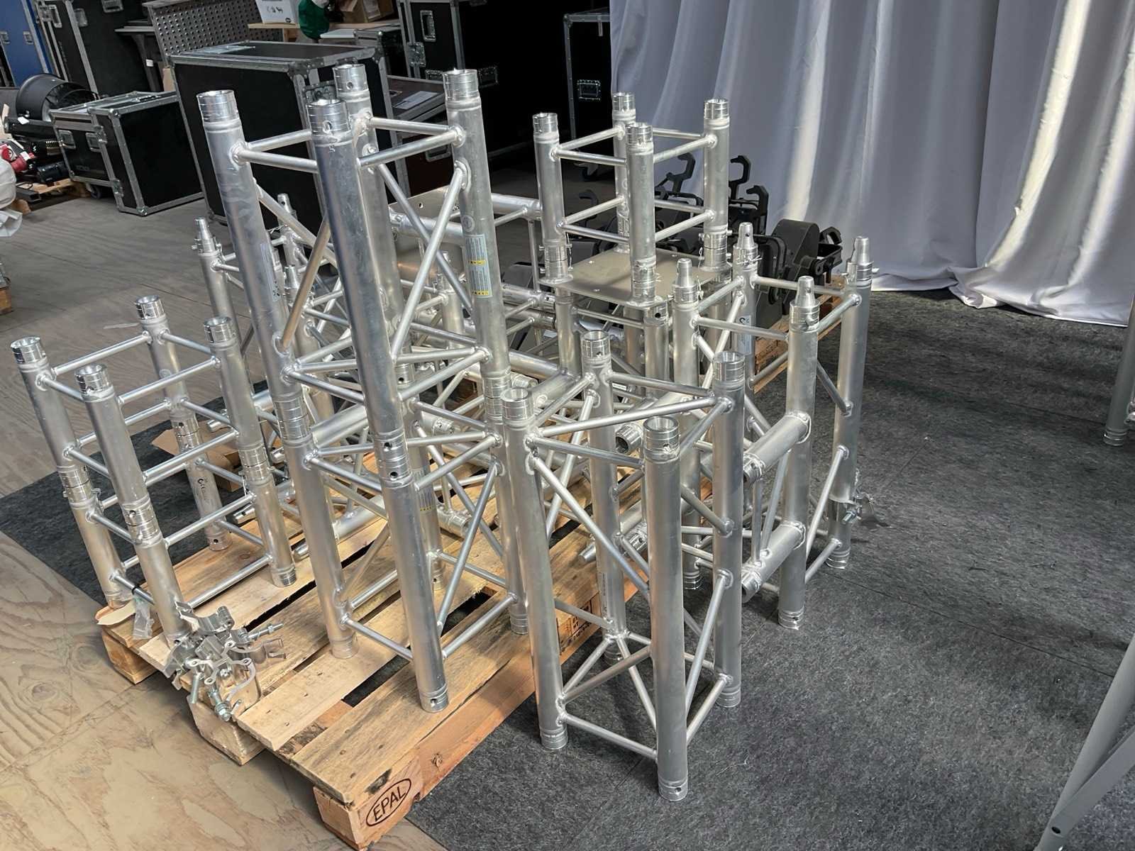 Bestaande uit: 2x t-stuk, 2x drieweg-hoek, 2x baseplate, 5x 30 cm, 2x 50 cm, 1x 71 cm, 5x 250 cm, 2x 200 cm, 4x trusst statief.