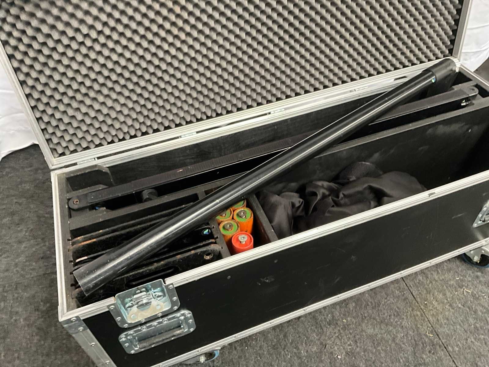 Bestaande uit, 6x voet, 6x voetpin 20cm, 6x staander 116cm, 6x ligger 120-180cm, 2x ligger 90-120cm, 4x doek 275x120cm Merk: Showtec Met flightcase: true