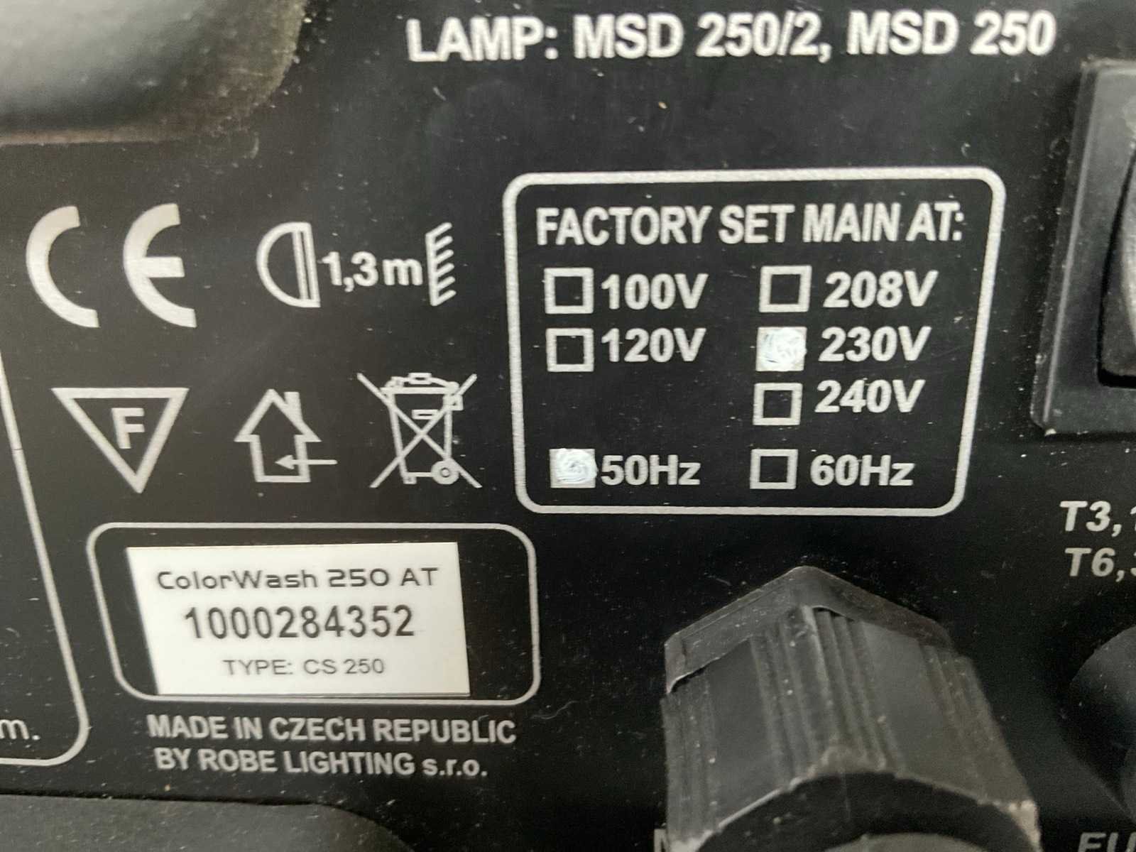 In 5 flightcases. Merk: Robe Type: Colorwash 250AT Aansluiting: 230V Totale afmeting L: 1030mm Totale afmeting Breedte: 490mm Totale afmeting Hoogte: 760mm