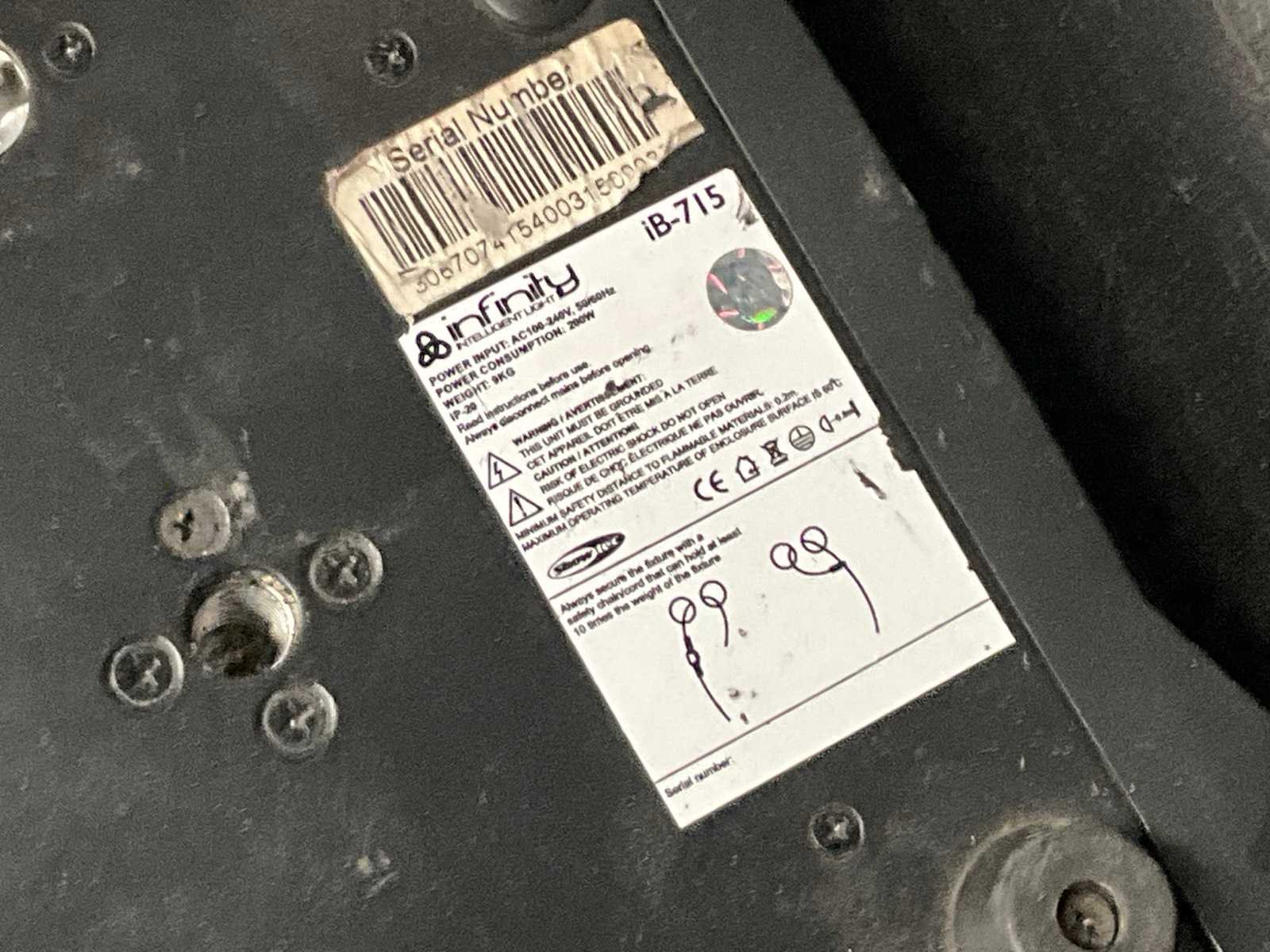DMX in en uit, Power in en uit, per 4 in flightcase Merk: Infinity Type: IB-715 DMX: true Met flightcase: true Aansluiting: 240V Eigen gewicht: 9kg