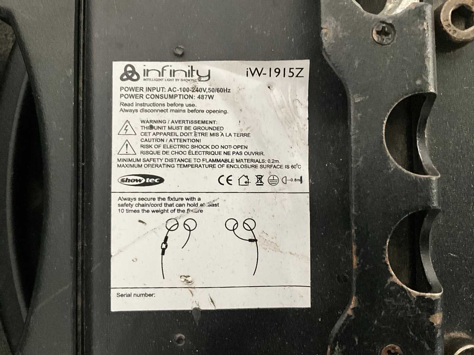 DMX in en uit (3 en 5 pin), power in en uit Merk: Infinity Type: IW-1915 DMX: true Met flightcase: true Aansluiting: 230V