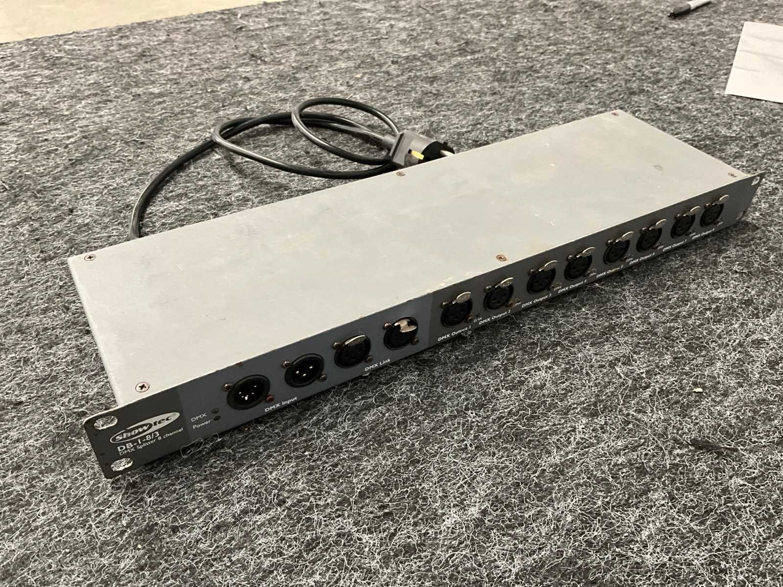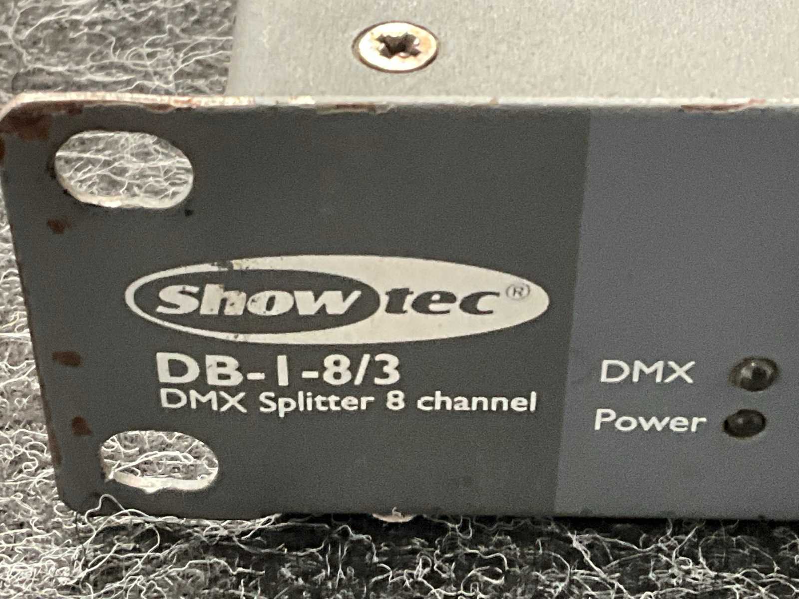 8x DMX 3-pin uit, DMX in en uit (3 en 5 pins) Merk: Showtec Type: DB 1-8 Aansluiting: 230V