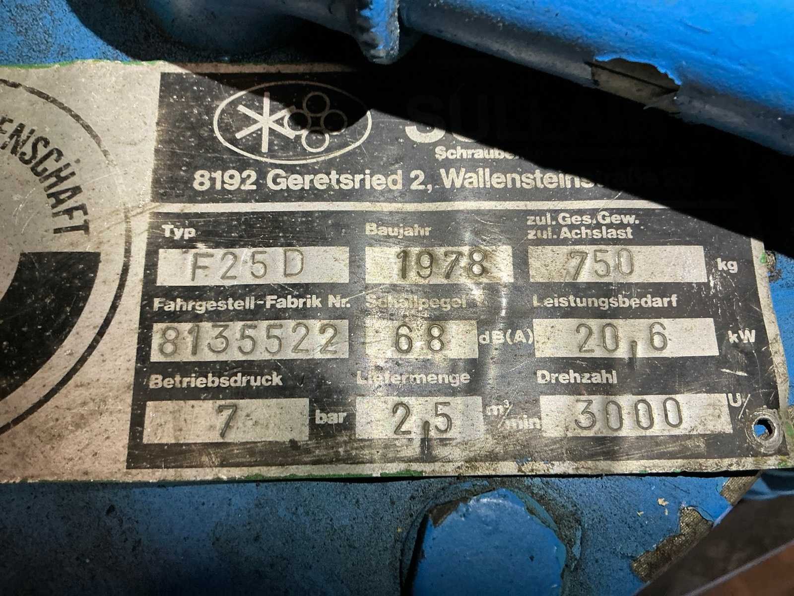 Dient opgestart te worden, geen kenteken en registratie Merk: Sullair Type: F25D Bouwjaar: 1978 Serienummer: 8135522 Mobiel: true Capaciteit.: 7bar Vermogen: 20.6kW Afgelezen urenstand: 2212hr Eigen gewicht: 750kg