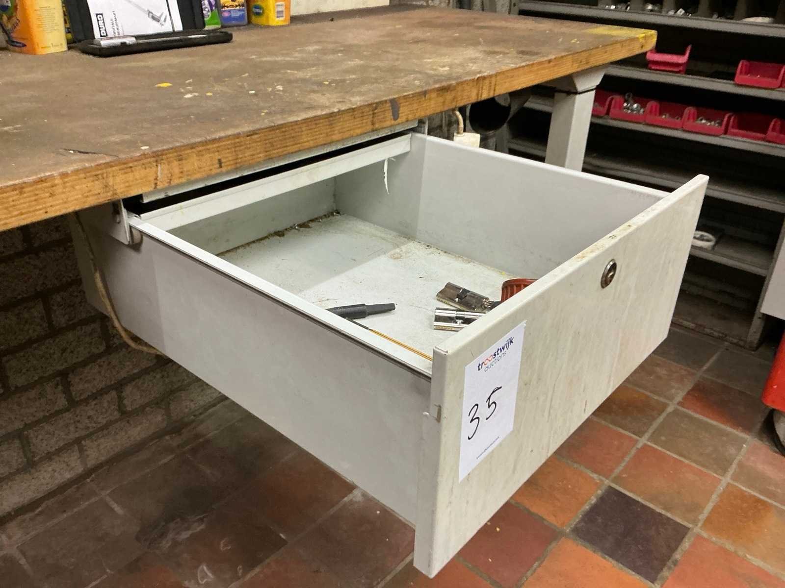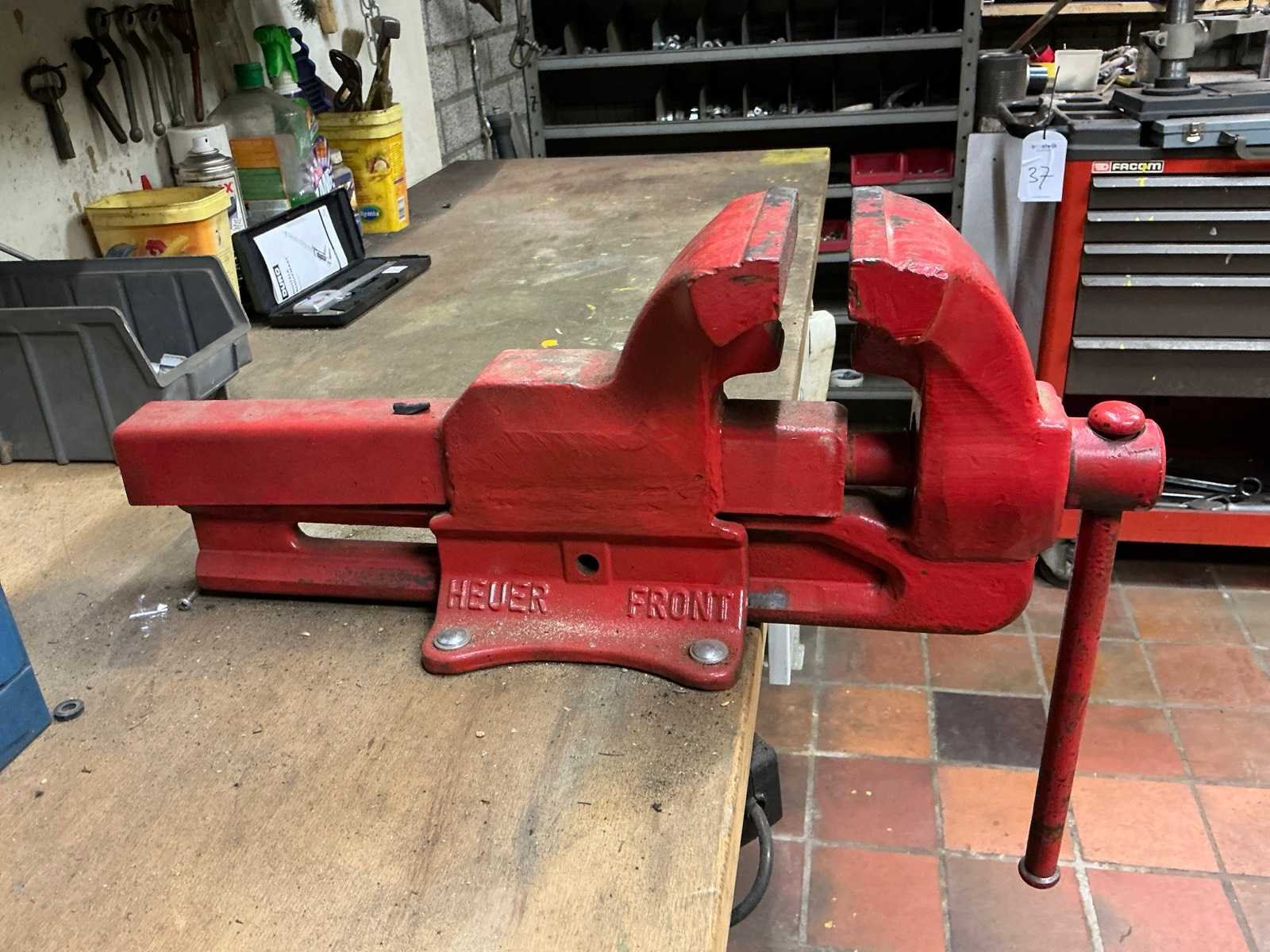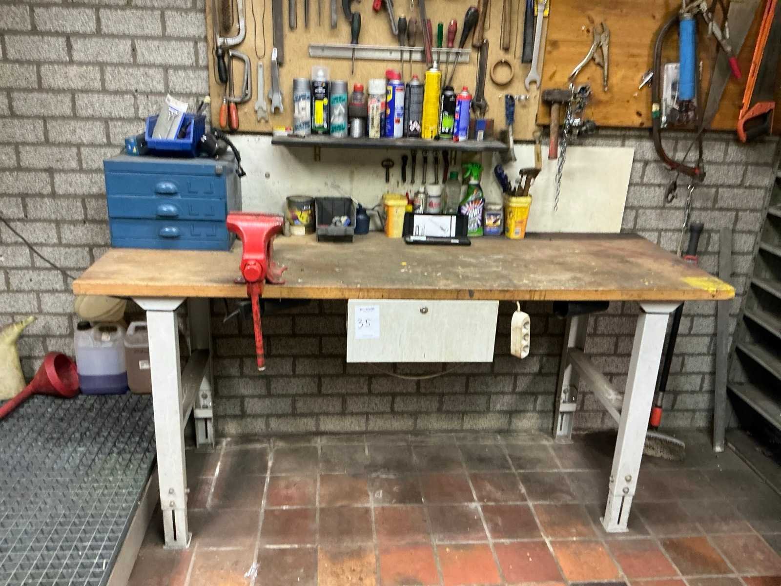 In hoogte verstelbaar, Stalen onderstel met houten werkblad, HEUER bankschroef, Diverse gereedschappen Breedte: 2000mm Lengte: 700mm Hoogte: 950mm