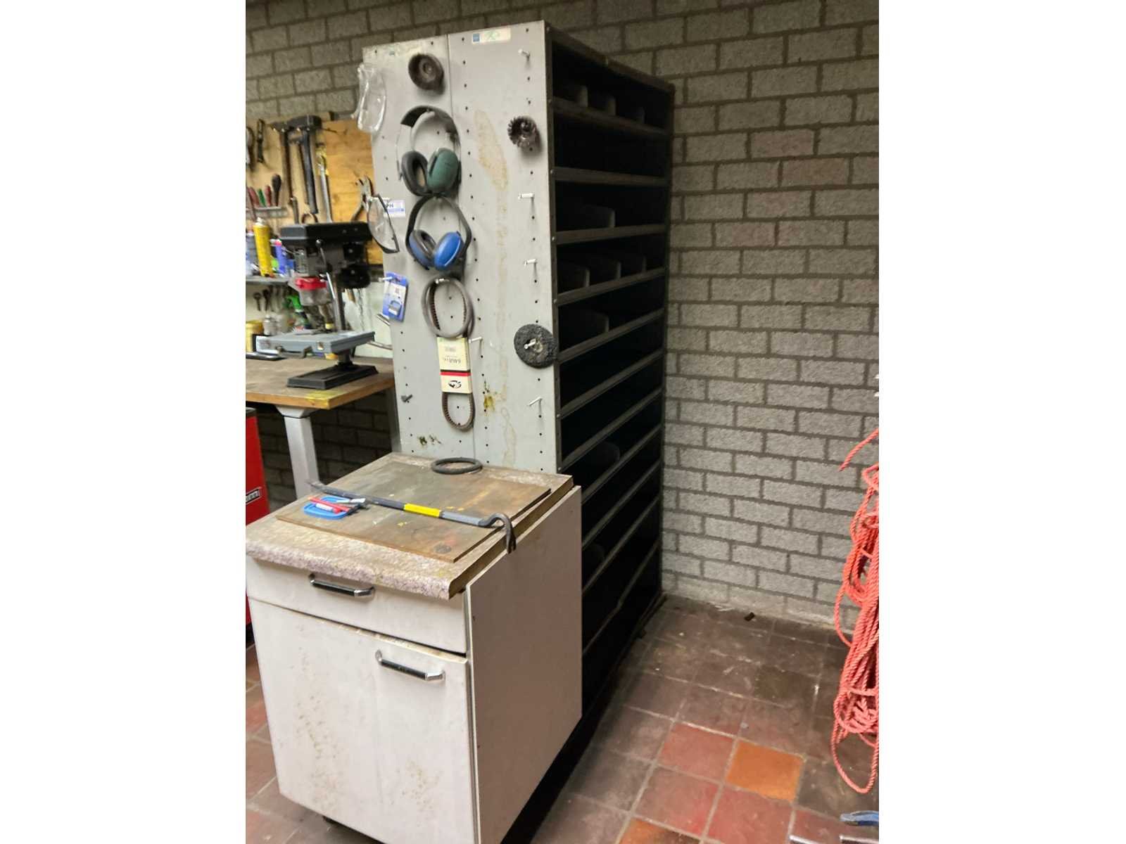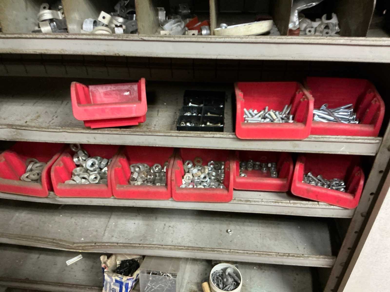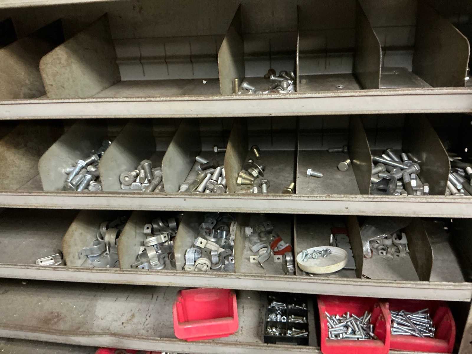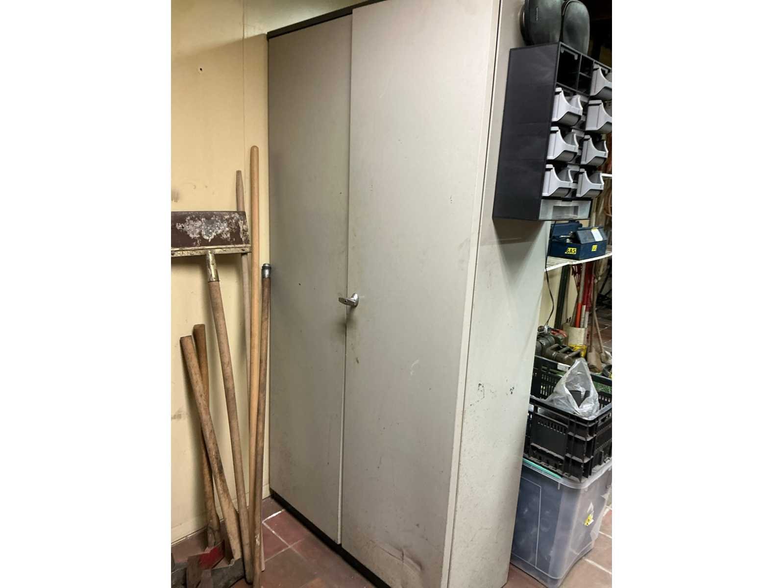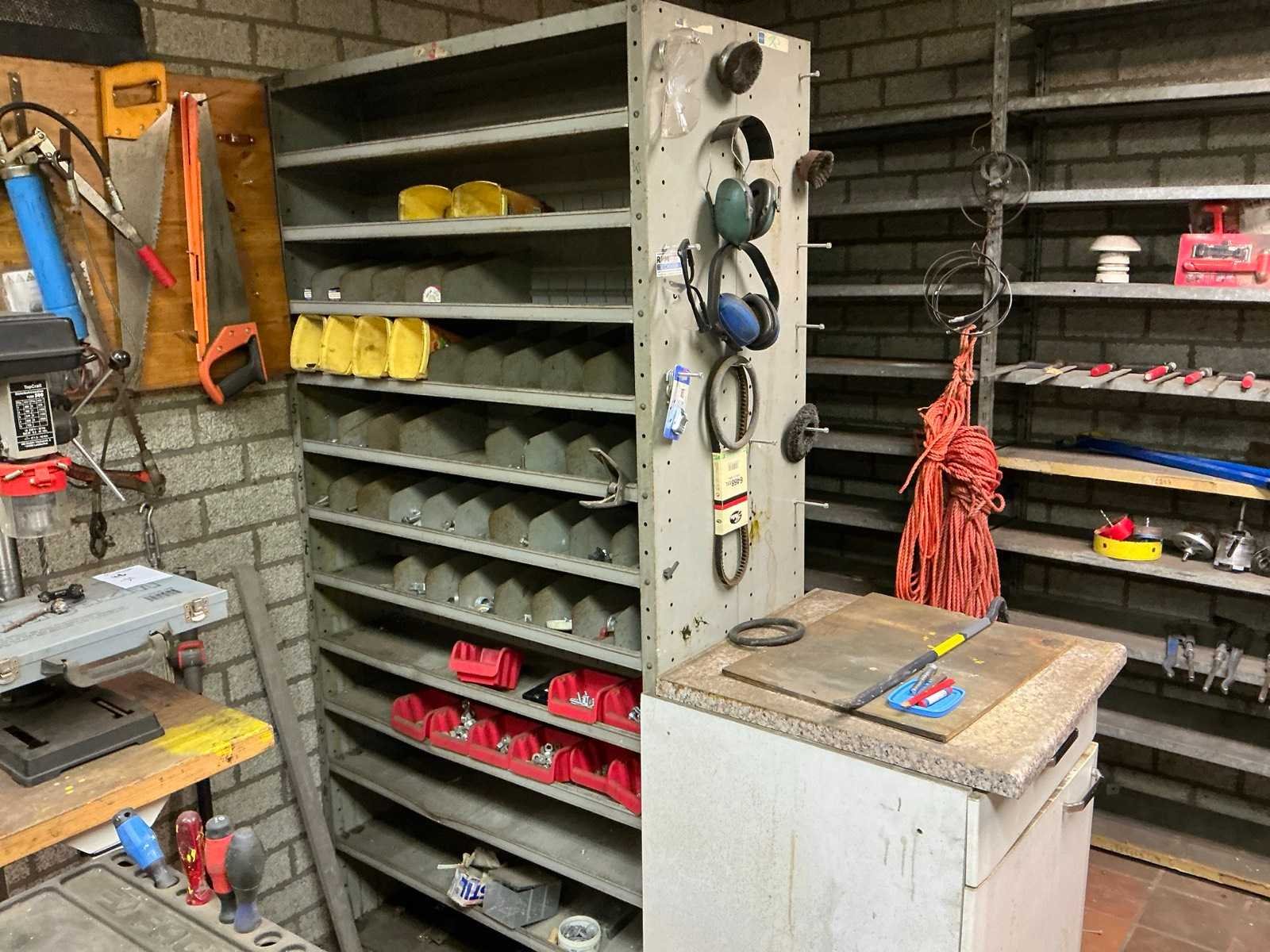 1x vakkenkast dubbelzijdig met inhoud ( 51x100x198cm), 1x kast met inhoud (41x100x196cm), 1x keukenkast met inoud (60x63x91cm), Inhoud bestaande uit bouten en moeren en divers Materiaal: Staal