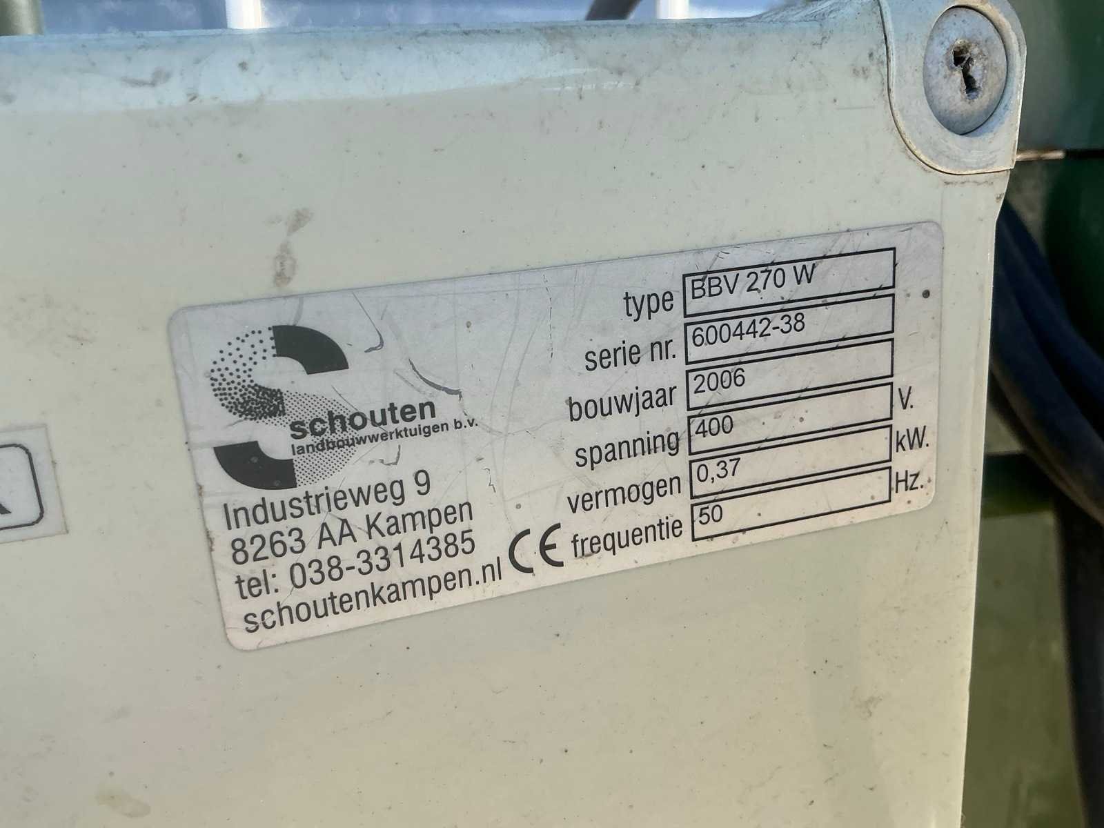 Voorzien van onder andere: valbreker en lepelinsteek Merk: Schouten Type: BBV 270 W Bouwjaar: 2006 Serienummer: 600442-38 Totale afmeting L: 1900mm Totale afmeting Breedte: 2000mm Totale afmeting Hoogte: 2700mm