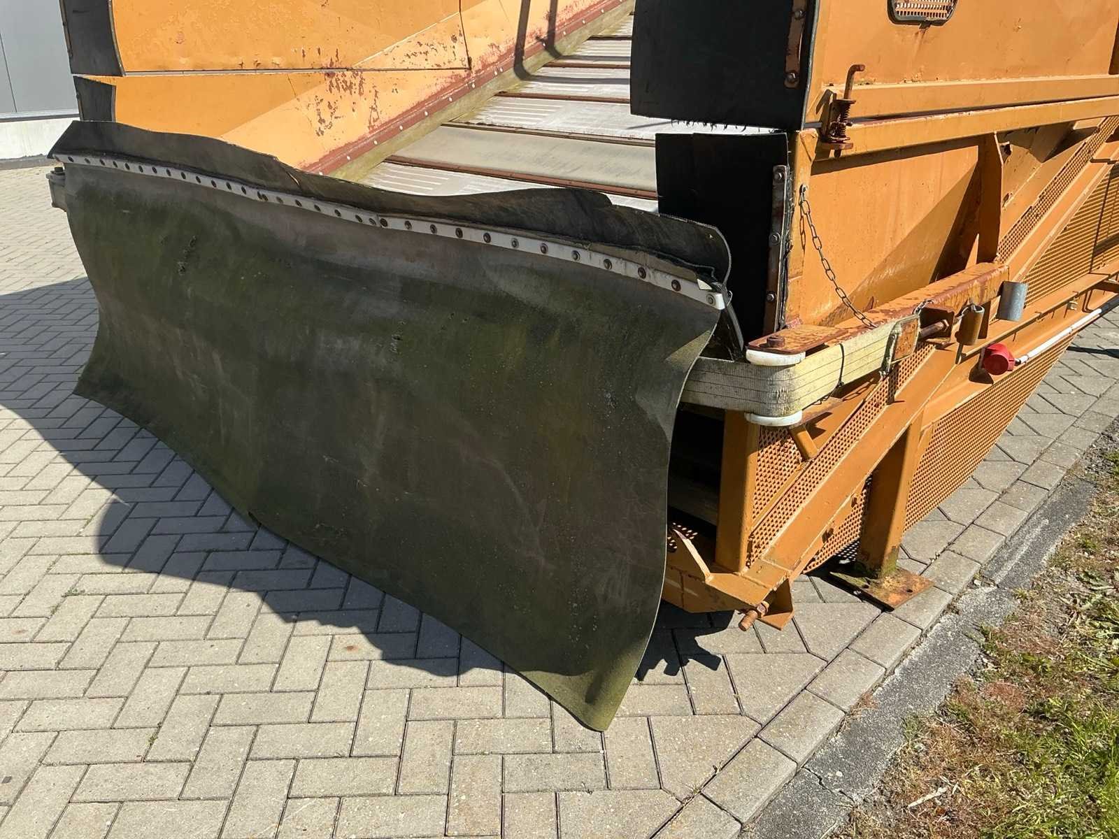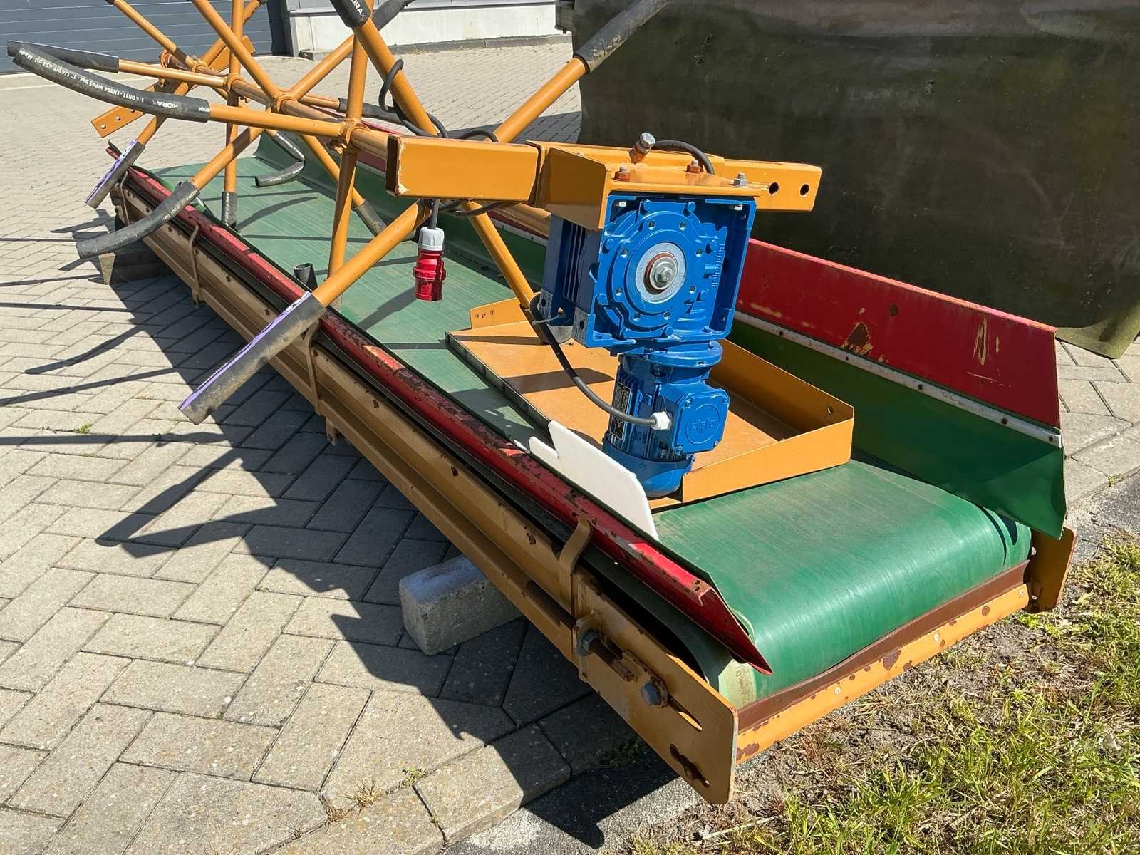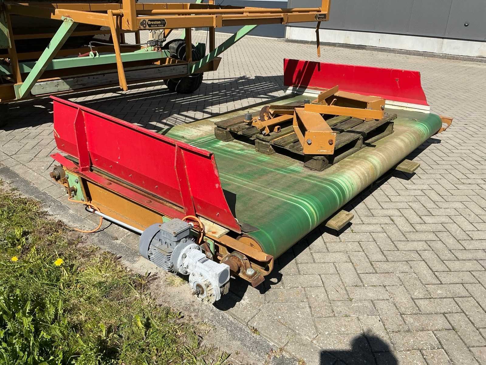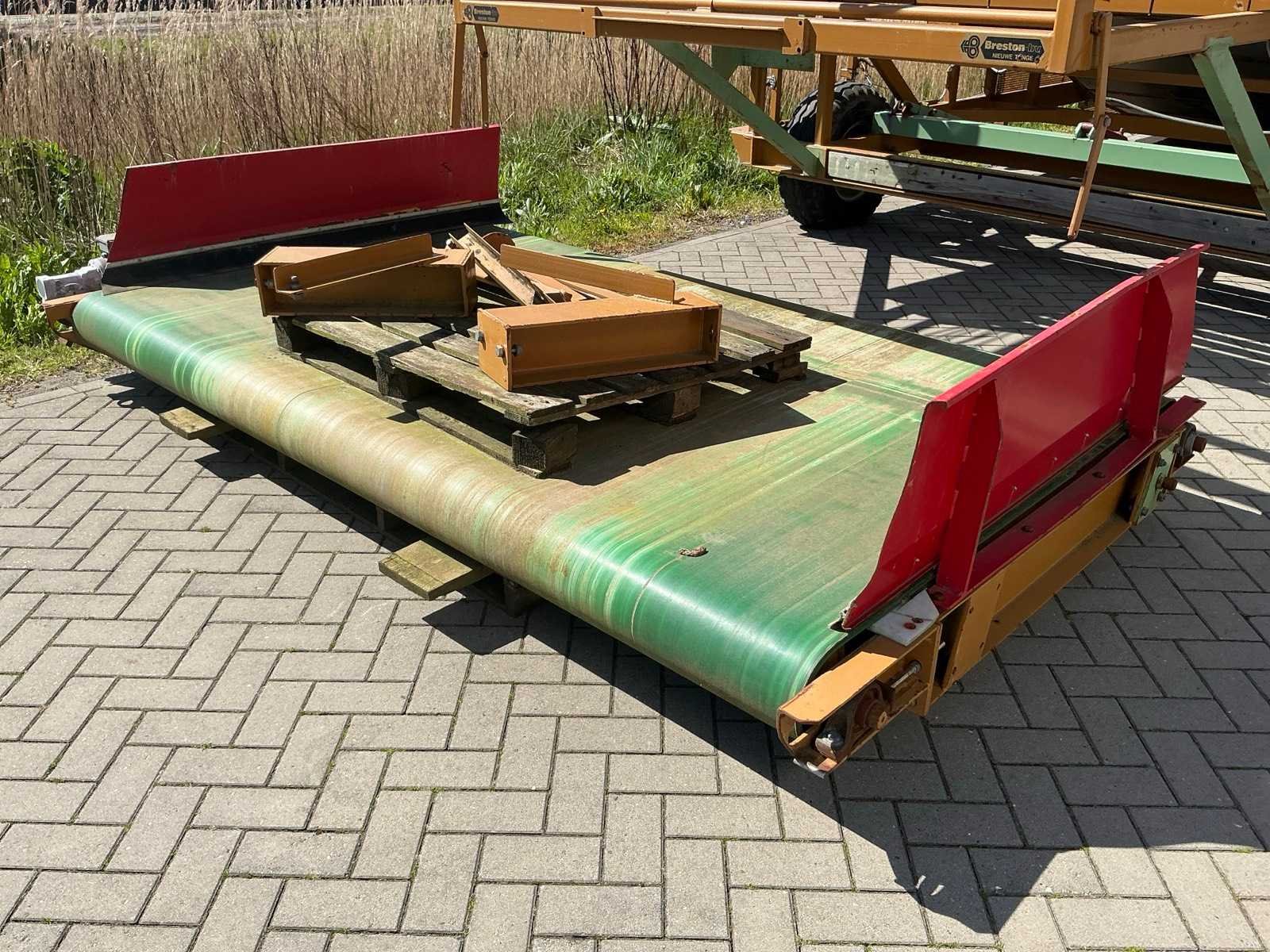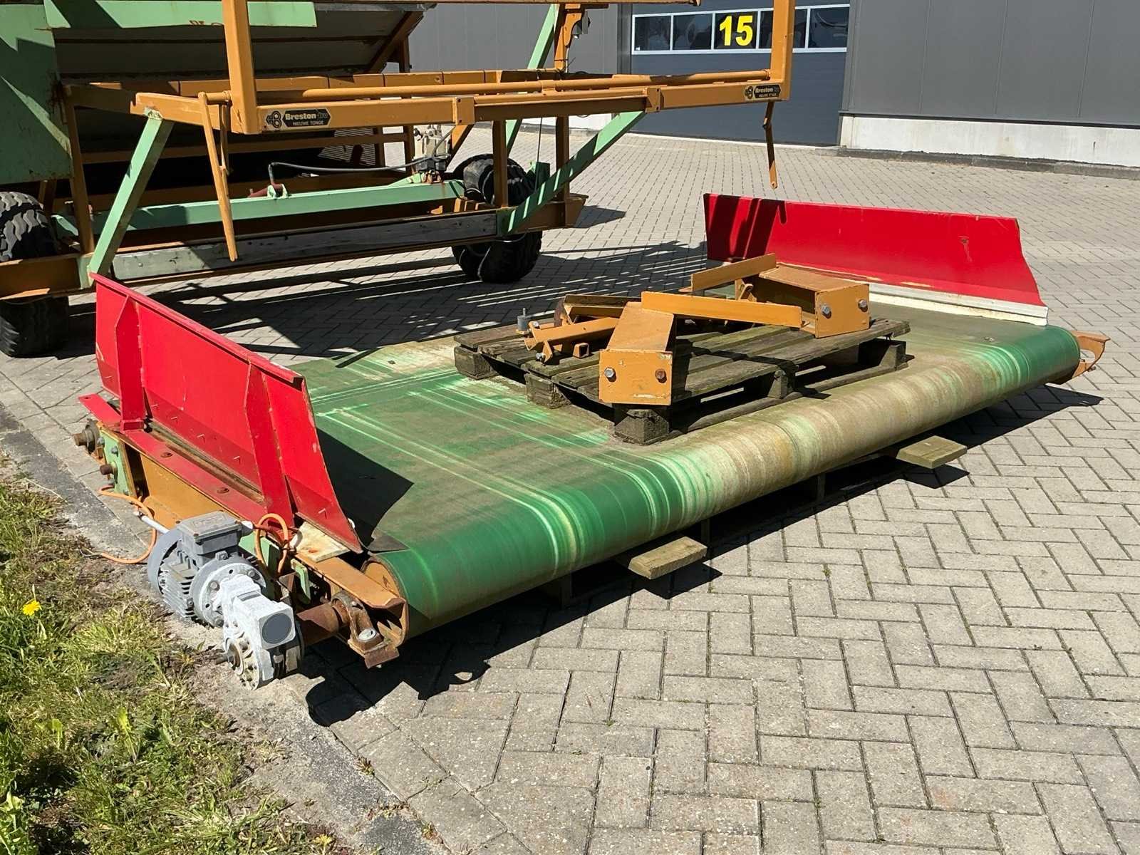 Breedte bunker: 3200mm. Voorzien van 8 rollen Ø 90mm. 1x Band van (LxB:1780x2980mm) en 1x breedte band: 640mm, lengte: 375mm. Met besturingskast. Merk: Breston Transportband afm. b: 2900mm Totale afmeting L: 8800mm Totale afmeting Breedte: 3550mm Totale afmeting Hoogte: 3350mm