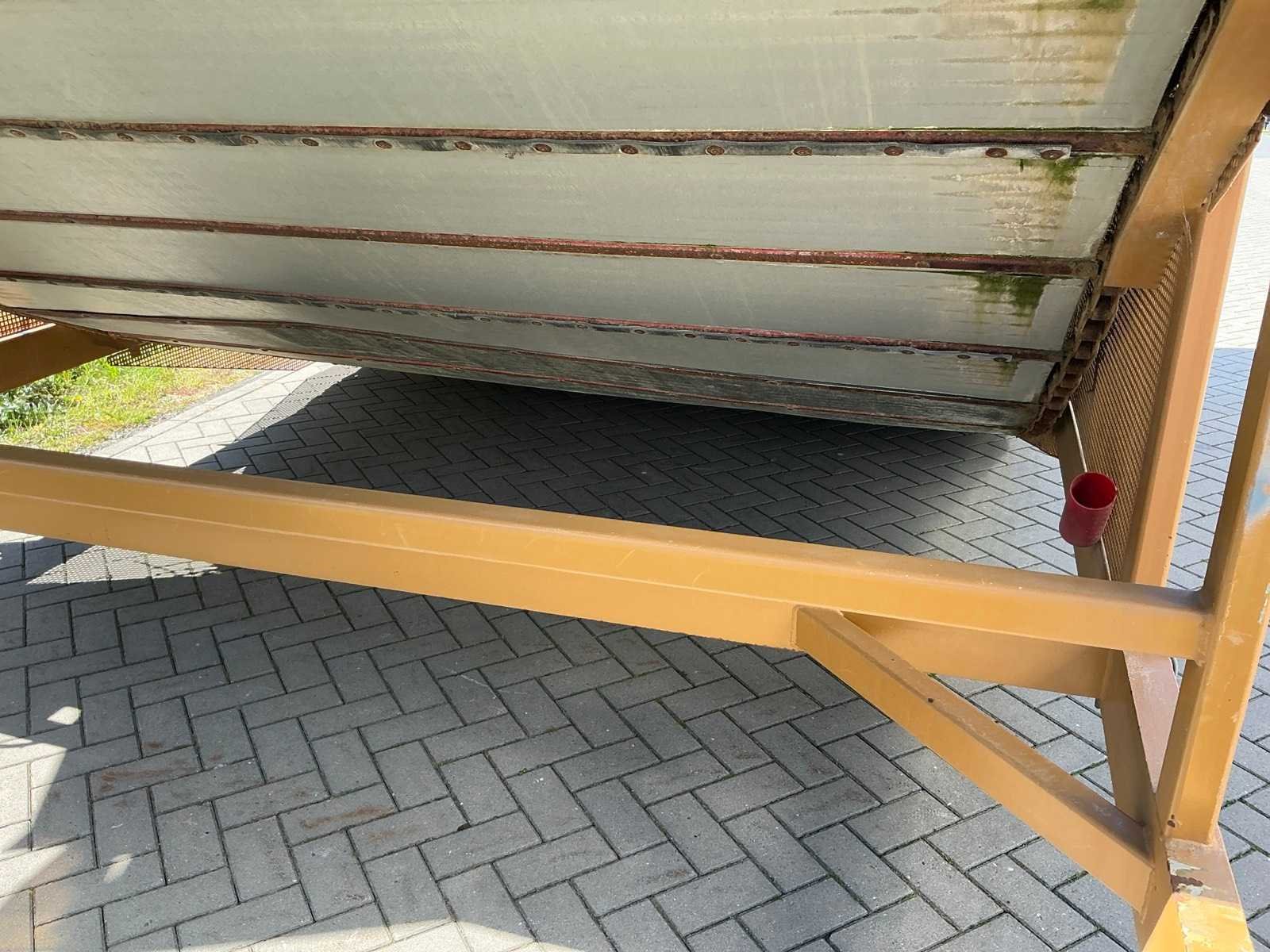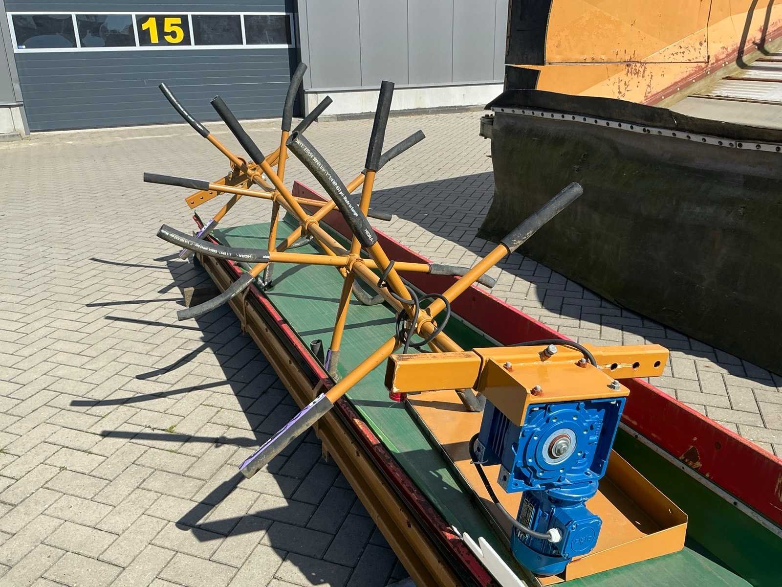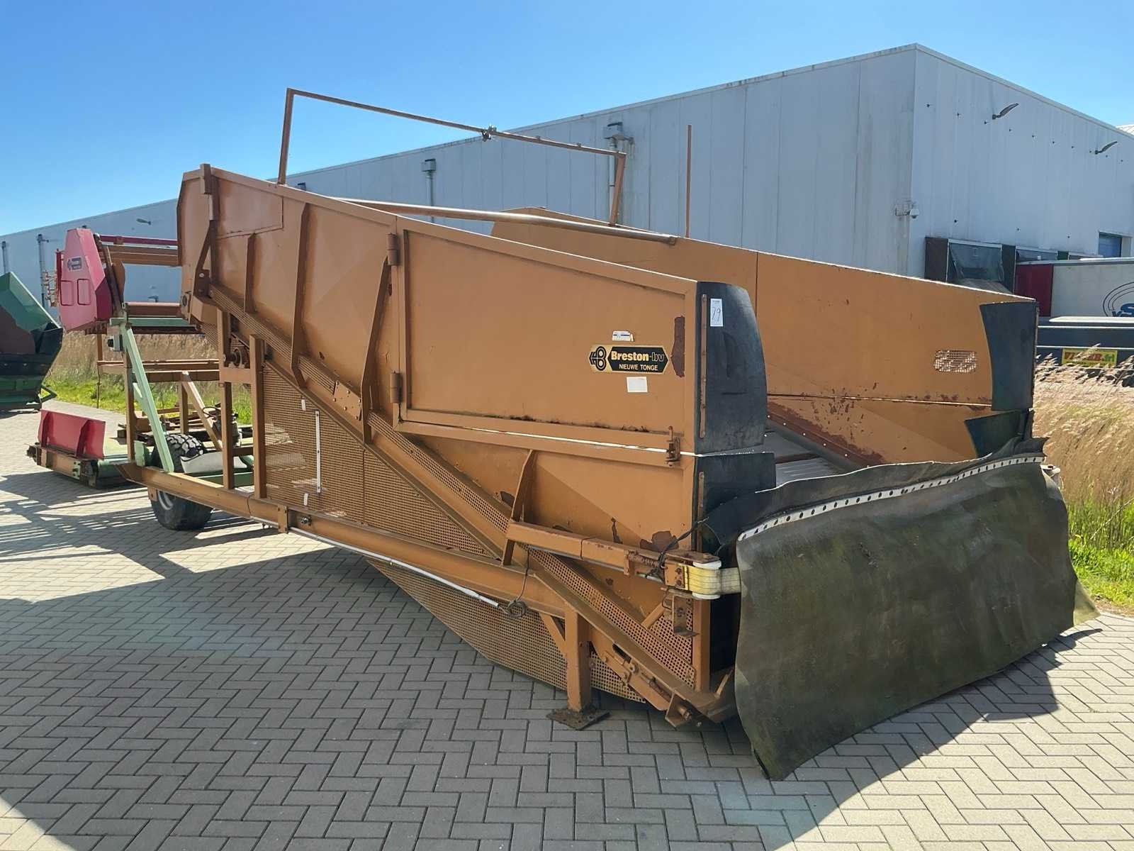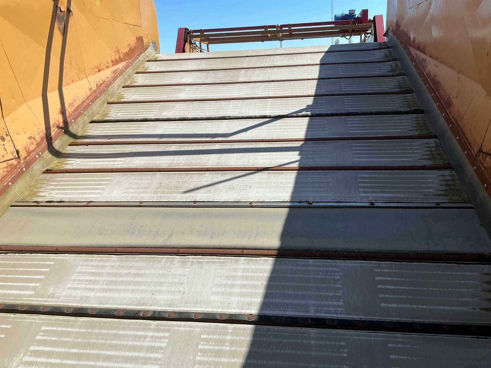 Breedte bunker: 3200mm. Voorzien van 8 rollen Ø 90mm. 1x Band van (LxB:1780x2980mm) en 1x breedte band: 640mm, lengte: 375mm. Met besturingskast. Merk: Breston Transportband afm. b: 2900mm Totale afmeting L: 8800mm Totale afmeting Breedte: 3550mm Totale afmeting Hoogte: 3350mm