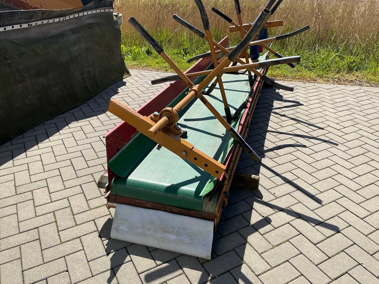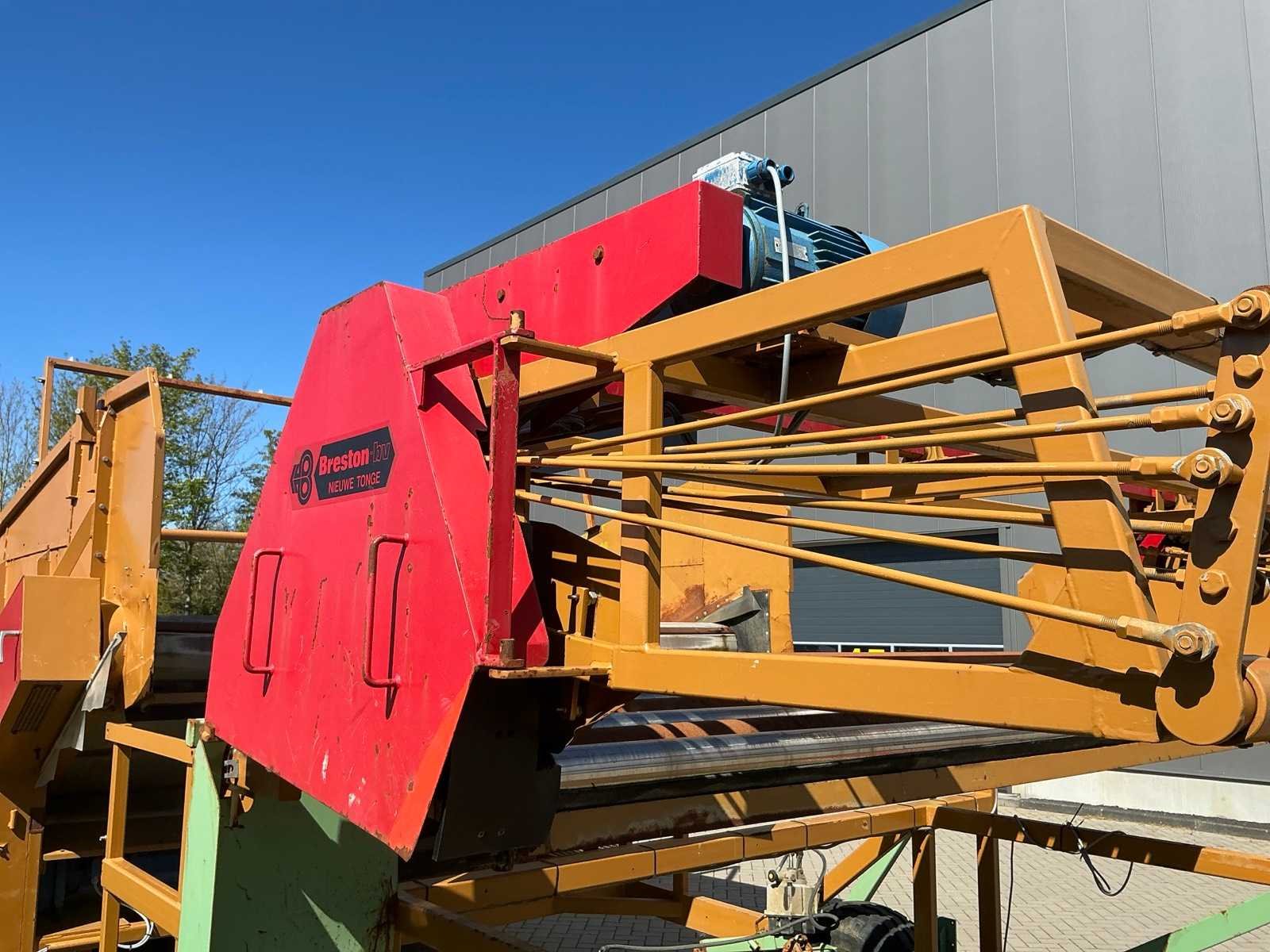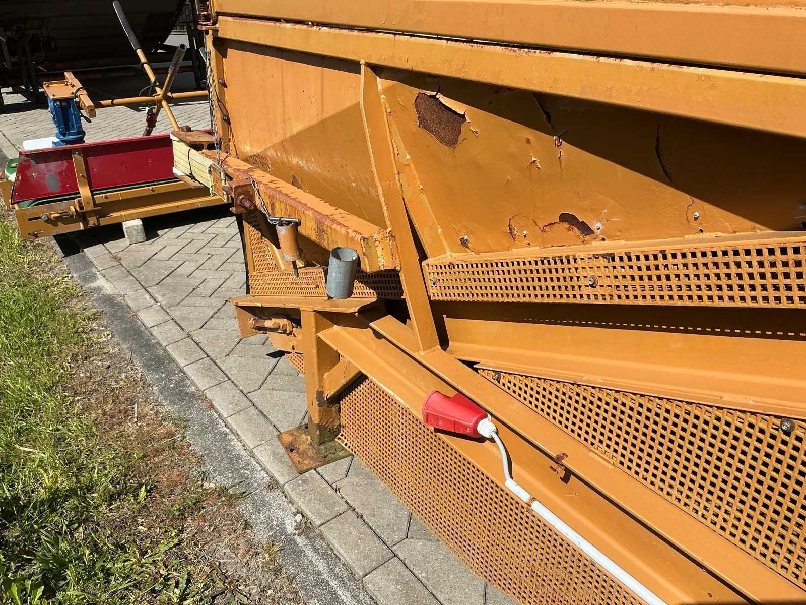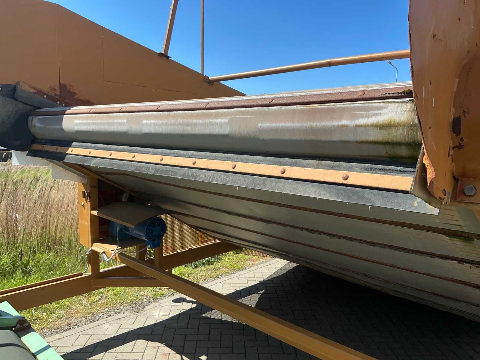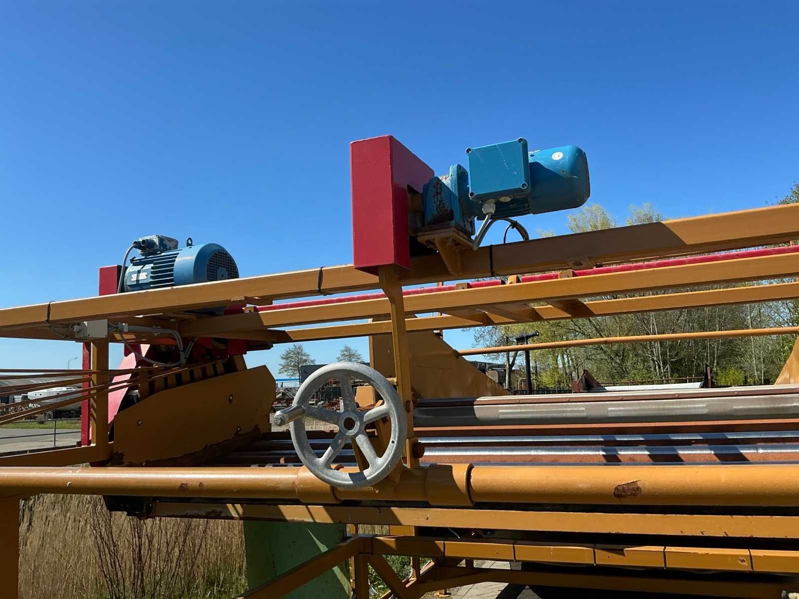 Breedte bunker: 3200mm. Voorzien van 8 rollen Ø 90mm. 1x Band van (LxB:1780x2980mm) en 1x breedte band: 640mm, lengte: 375mm. Met besturingskast. Merk: Breston Transportband afm. b: 2900mm Totale afmeting L: 8800mm Totale afmeting Breedte: 3550mm Totale afmeting Hoogte: 3350mm