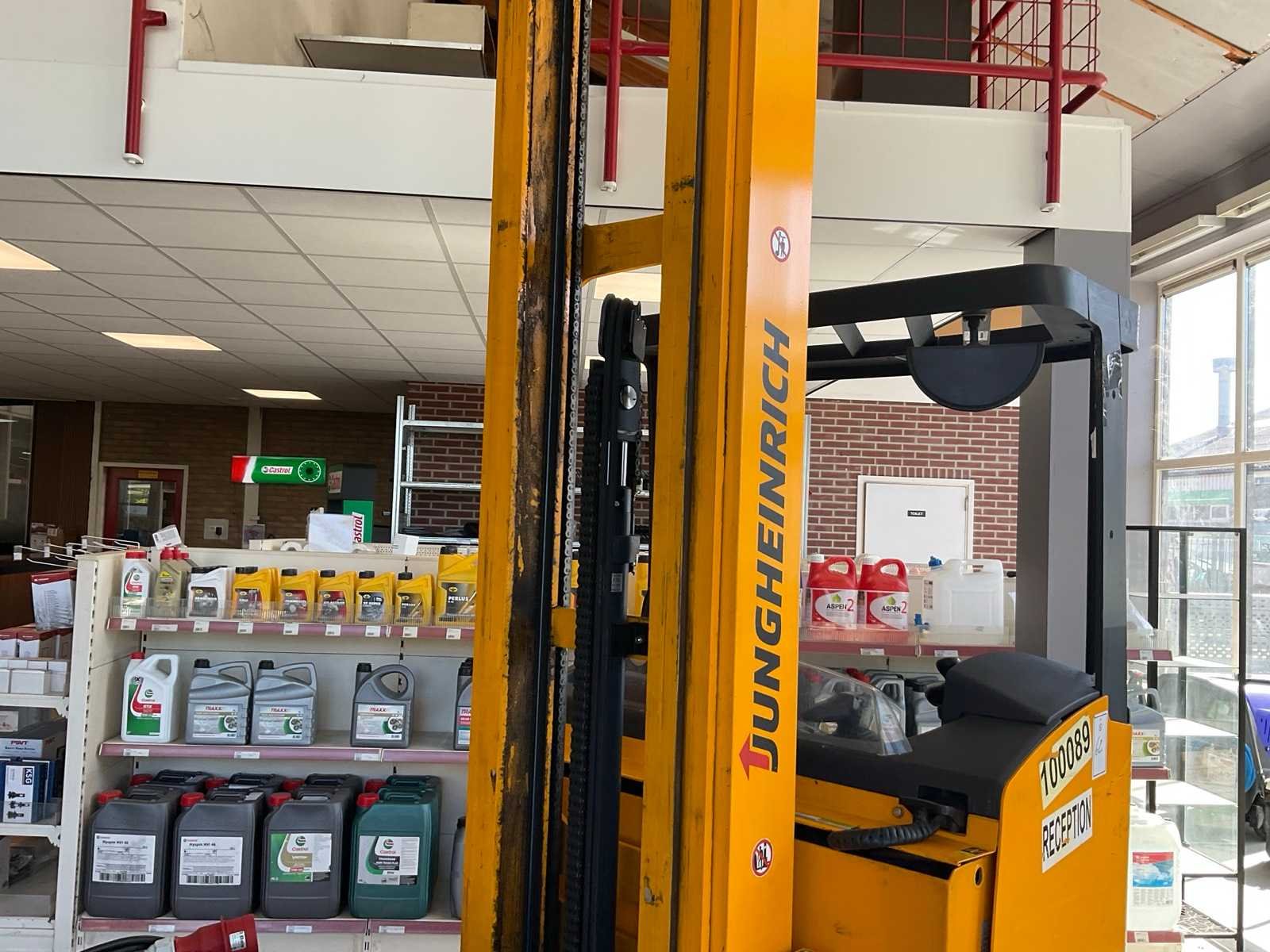 Merk: Jungheinrich Type: ETV 214 Brandstof: Elektrisch Mast: Triple Aantal wielen: 3 Afgelezen urenstand: 14764 Accu lader: true Free-lift: true Side-shift: true Triple mast: true Hefvermogen: 1400kg Lepellengte: 1150mm Max. hefhoogte: 8300mm Minimale doorrijhoogte: 3300mm Elektrisch: true