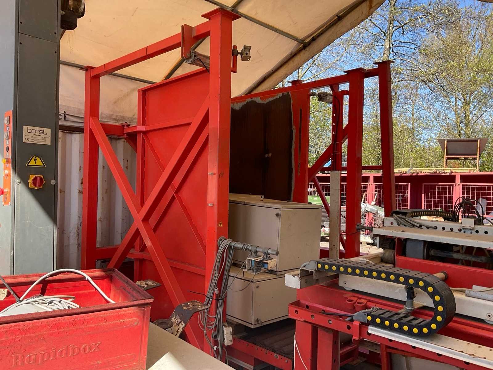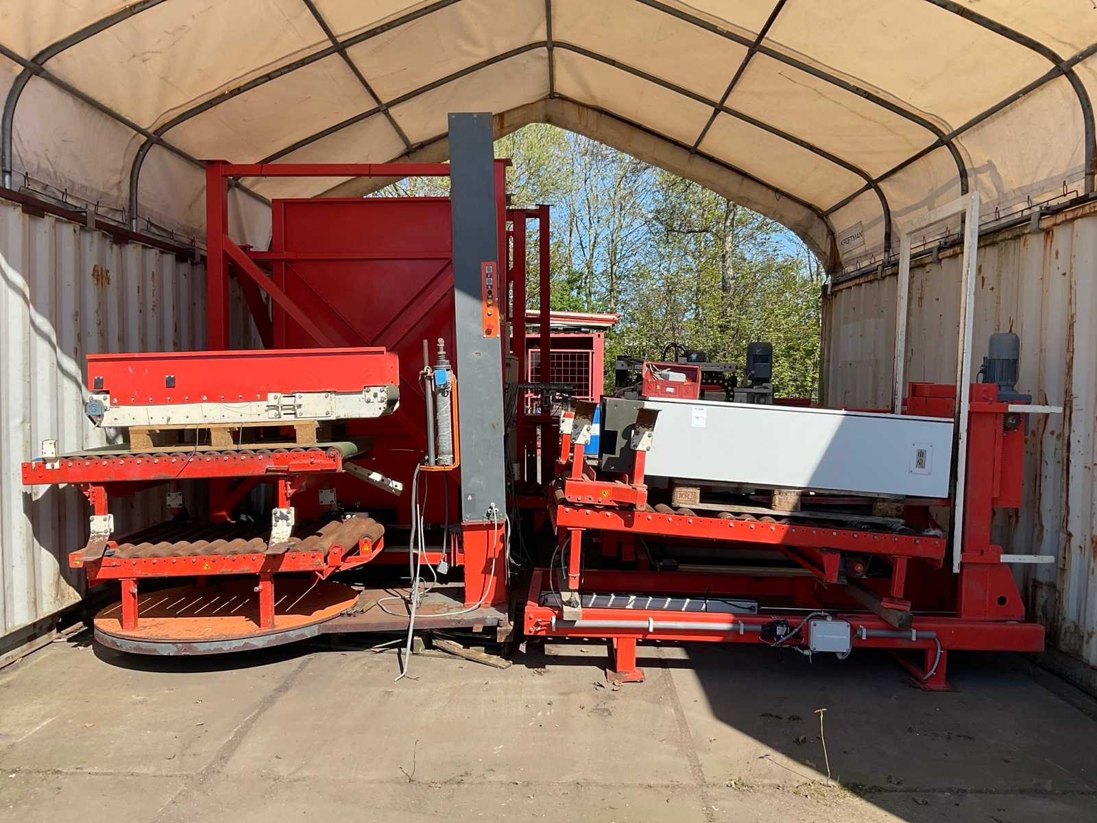 V.v. palletiseerunit; “Borst” palletfoliewikkelaar; plateau Ø 1500 mm; hoogte ca. 3000 mm; diverse rollenbanen en schakelkast Merk: De Feijter