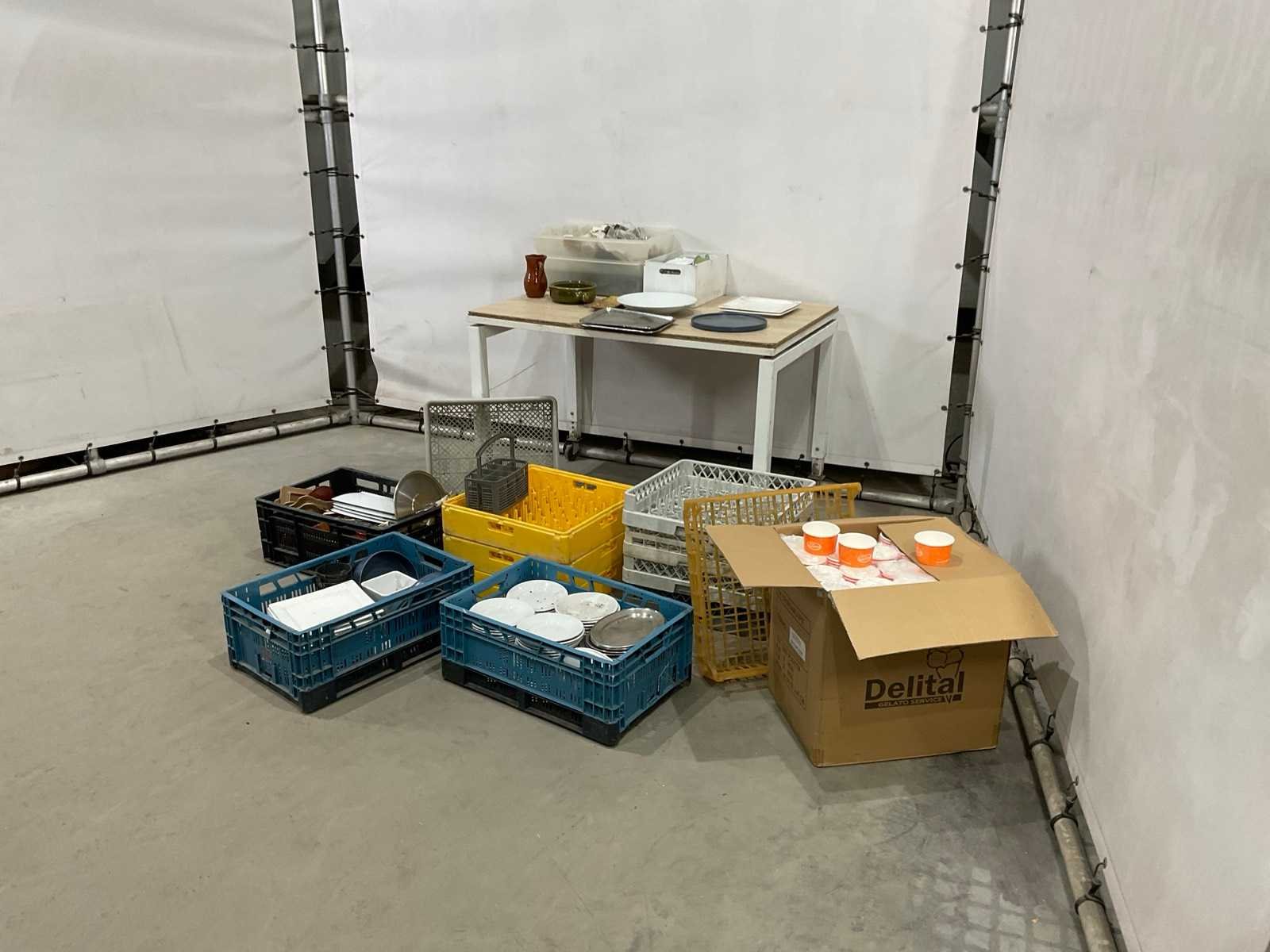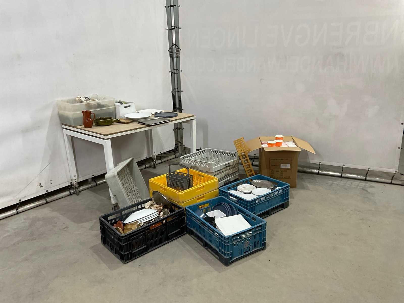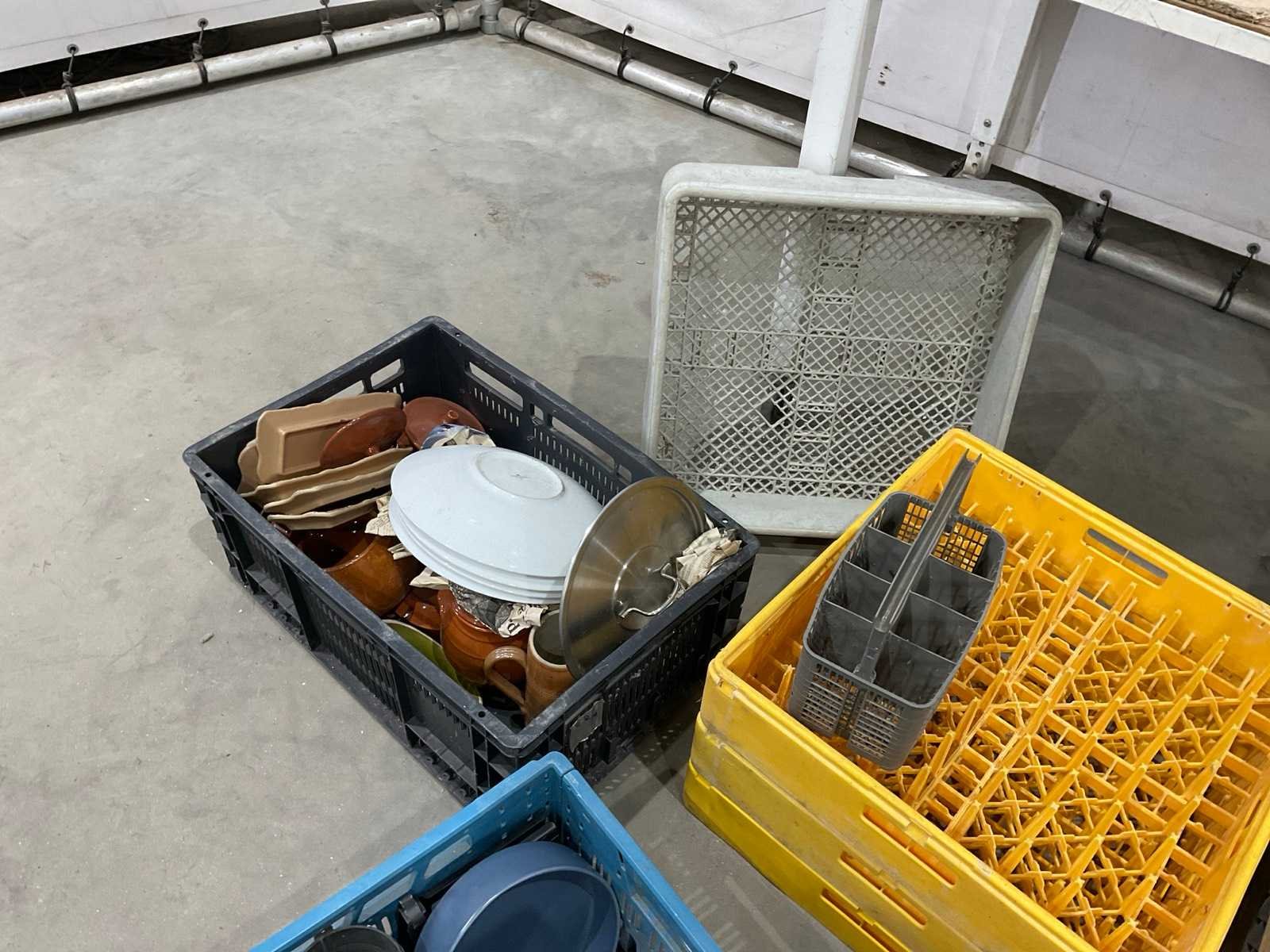 Diverse glaswerk en servies; keuken benodigdheden en spoelkorven ; grijs en geel inclusief veiling kratten ; statiegeld