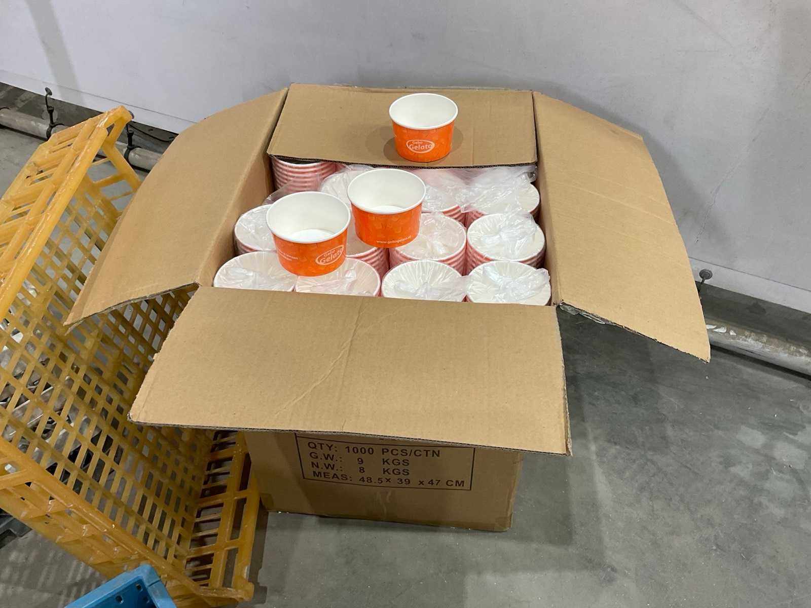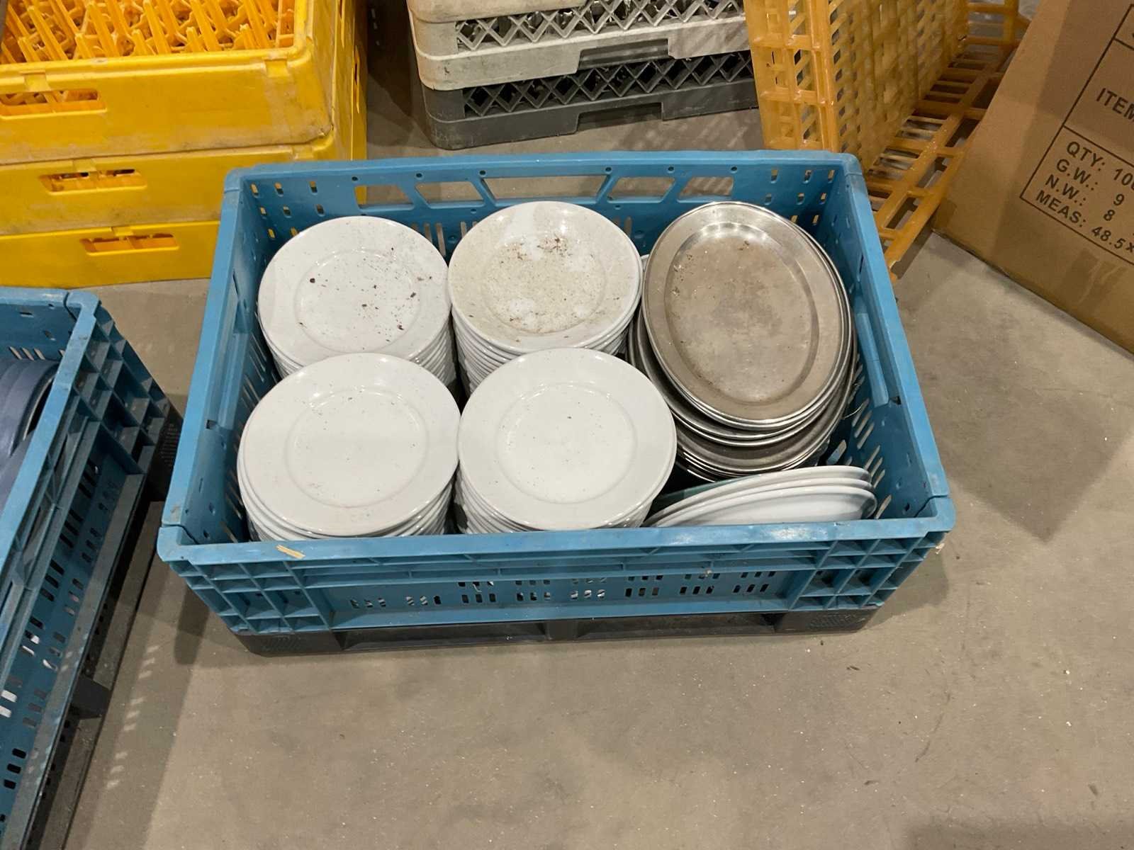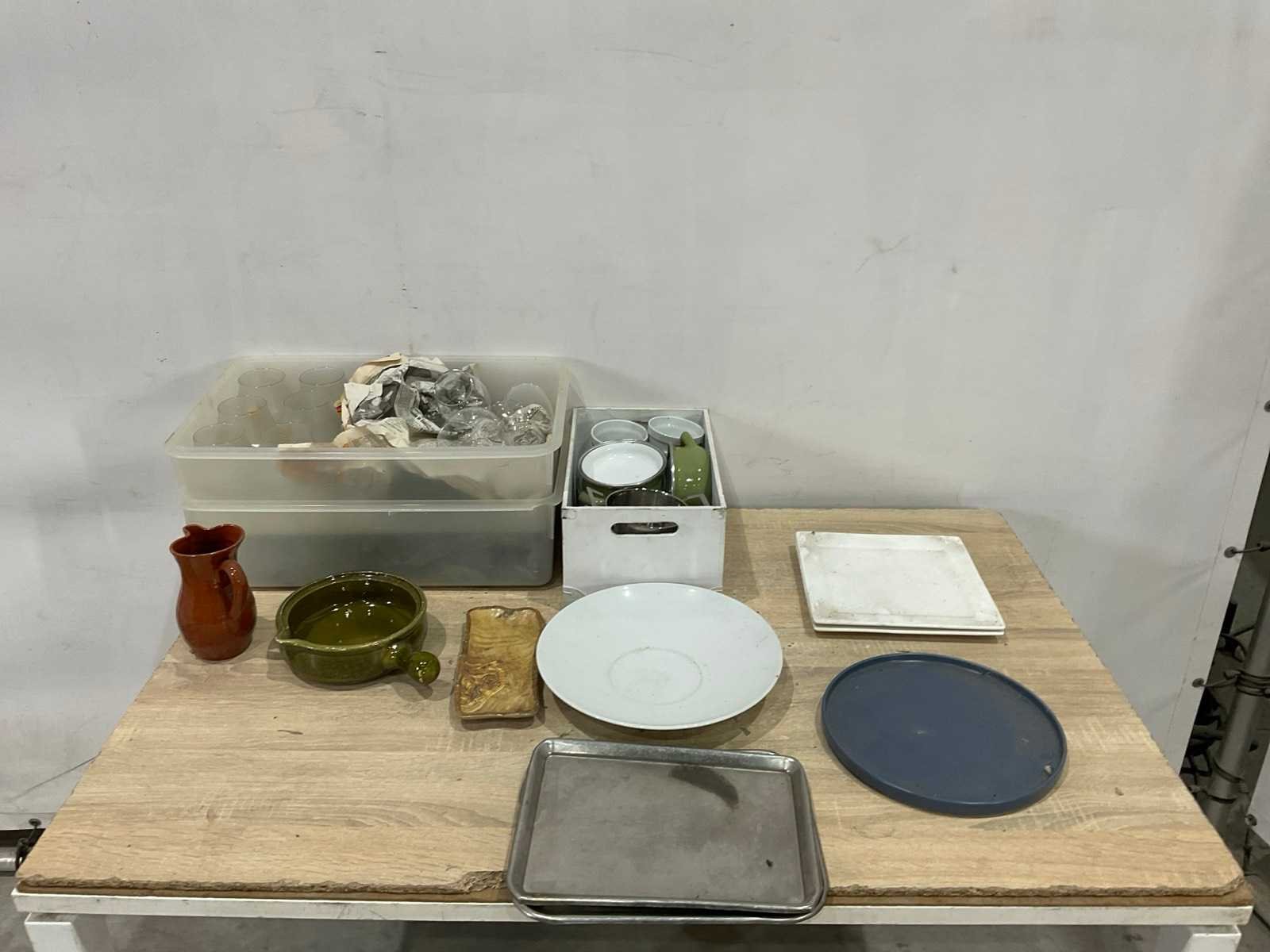 Diverse glaswerk en servies; keuken benodigdheden en spoelkorven ; grijs en geel inclusief veiling kratten ; statiegeld