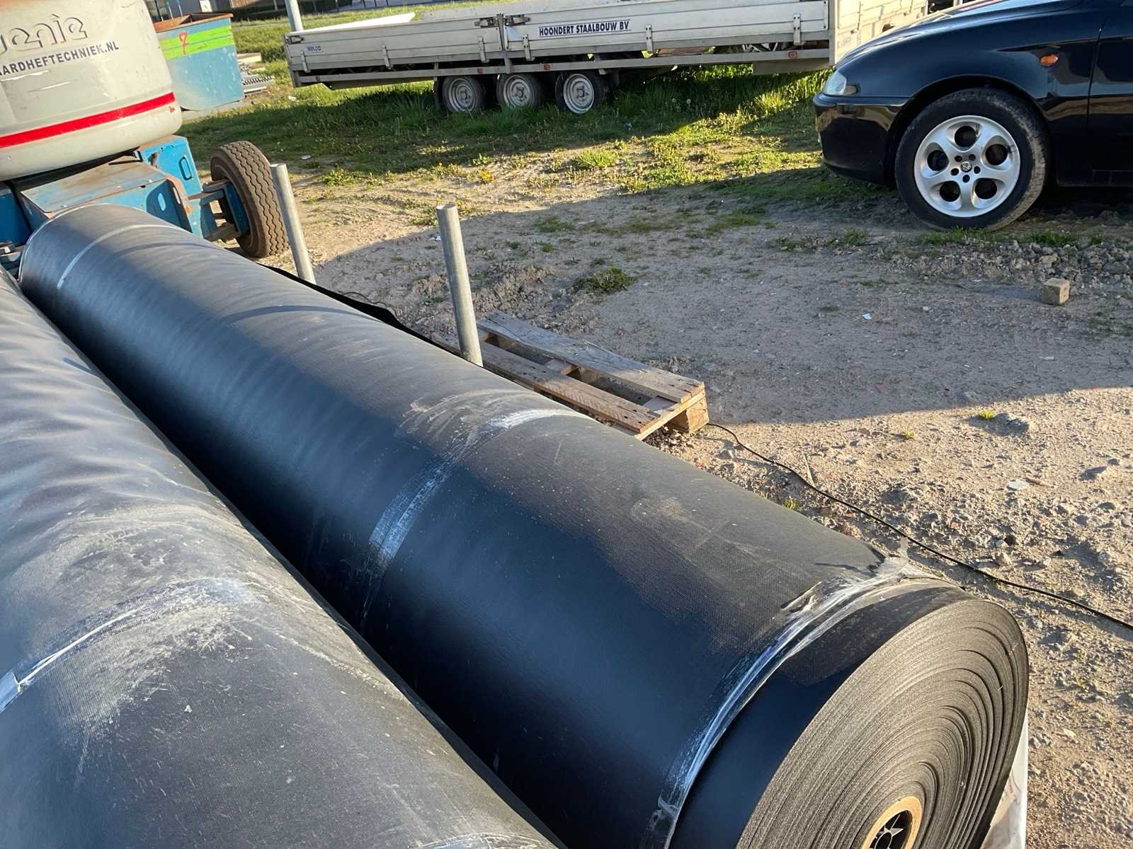 Circa 380 meter op rol, gewicht van de rol is circa 982 kg, RhinoMat® 1000 versterkte composiet geomembraan is ideaal voor afdichtingstoepassingen zoals landbouw, aquacultuur, mijnbouw en energie, secundaire opvang, afvalwaterlagunes en afdekkingen van stortplaatsen. Toepassingen voor waterretentie omvatten vijvers op golfbanen, regenwaterbeheer, irrigatieopslag, kanaalbekleding en reservoirs voor drinkwater. De flexibele constructie maakt efficiënte verbinding van een breed scala aan paneelvormen en -afmetingen mogelijk. Prefabricage in de fabriek vermindert de benodigde lastijd op locatie en beperkt tijdrovende destructieve veldtesten. Het maakt ook maatwerkpanelen mogelijk om de installatie te versnellen. Een geweven kern van hoge dichtheid polyethyleen (HDPE) met hoge sterkte zorgt voor uitstekende maatvastheid en stabiliteit. De speciaal ontworpen coating van lineair lage dichtheid polyethyleen/lage dichtheid polyethyleen (LLDPE/LDPE) biedt flexibiliteit, chemische bestendigheid en bescherming tegen ultraviolet licht, ozon en oxidatie, exclusief bok Merk: Rhinomat Type: 1000 Bouwjaar: 2019 Totale afmeting Breedte: 3650mm