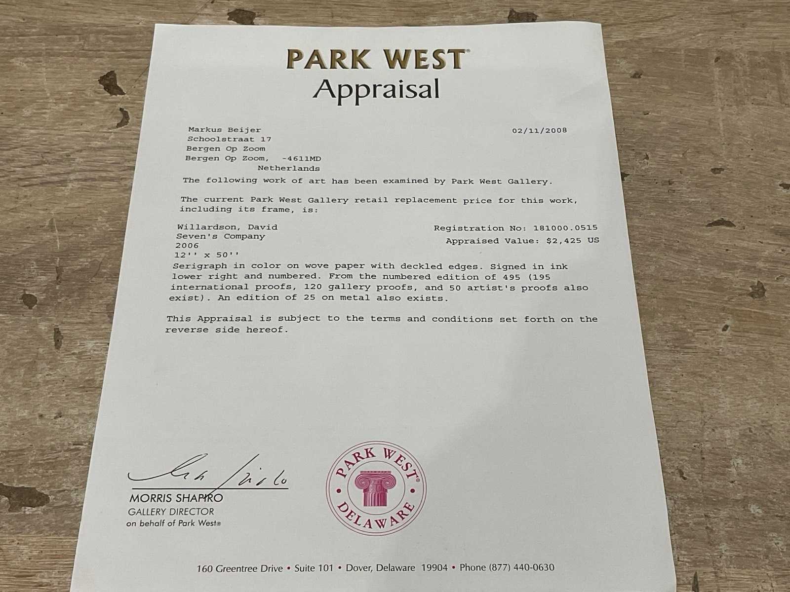 Met park west certificaat Kunstenaar: David Willardson Titel van werk: Seven ‘ s Company Datering: 2006 Hoogte incl. lijst: 68cm Breedte incl. lijst: 165cm Frame: true