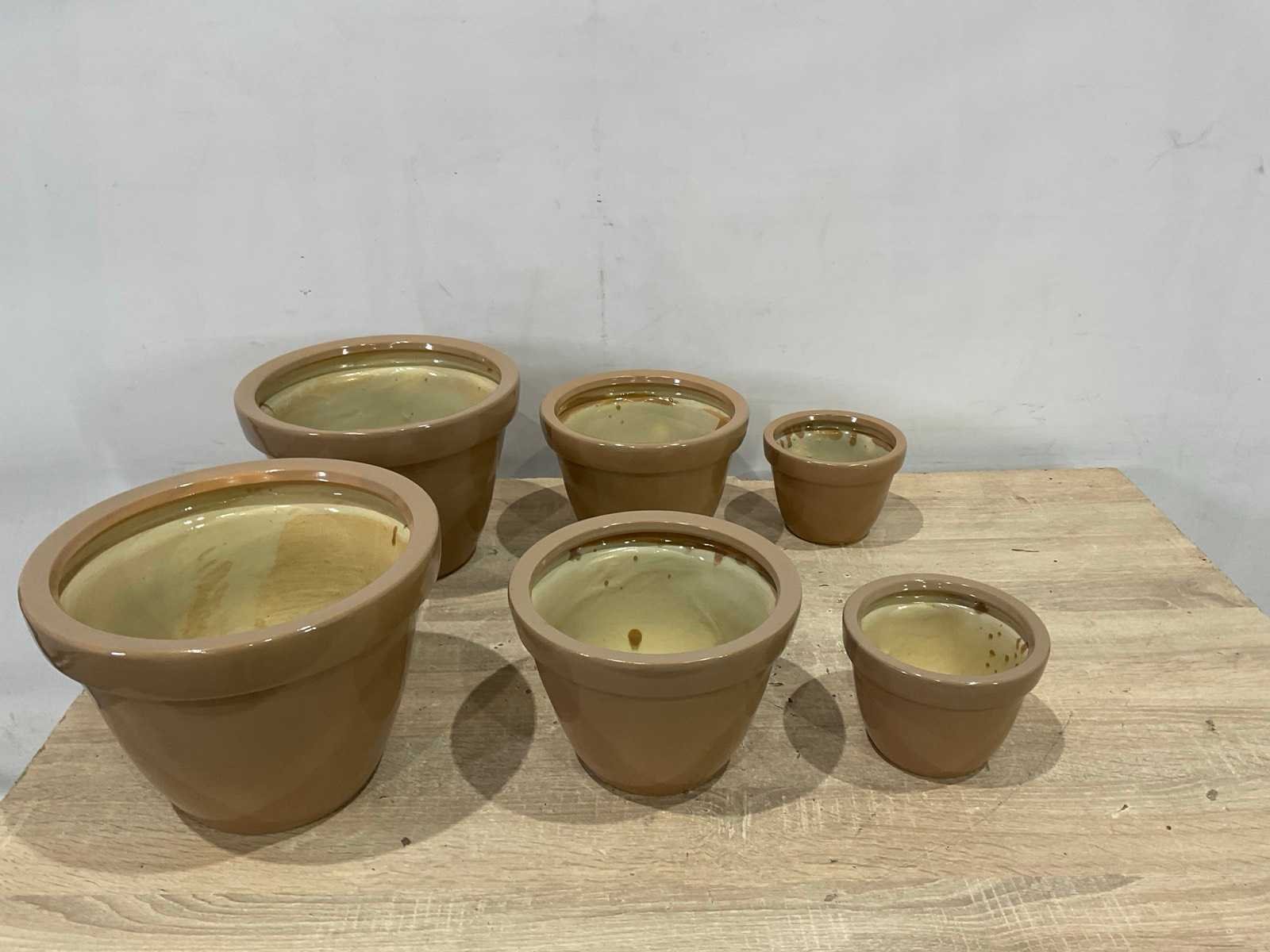 Kavel bestaat uit 1 doos met 6 bloempotten ; 2x circa 30 cm doorsnede; 2x circa 24 cm doorsnede; 2x circa 16 cm doorsnede; ongebruikt