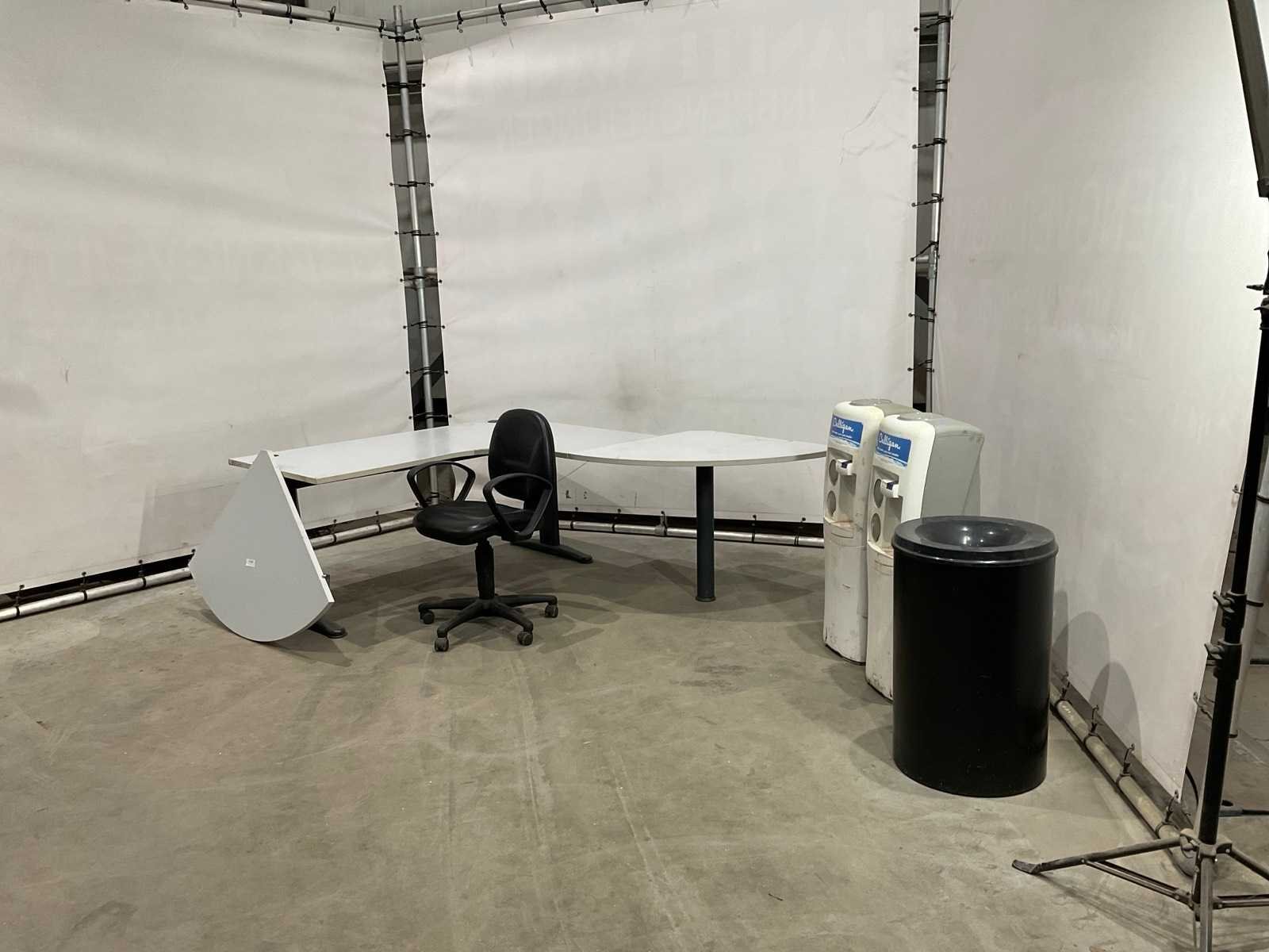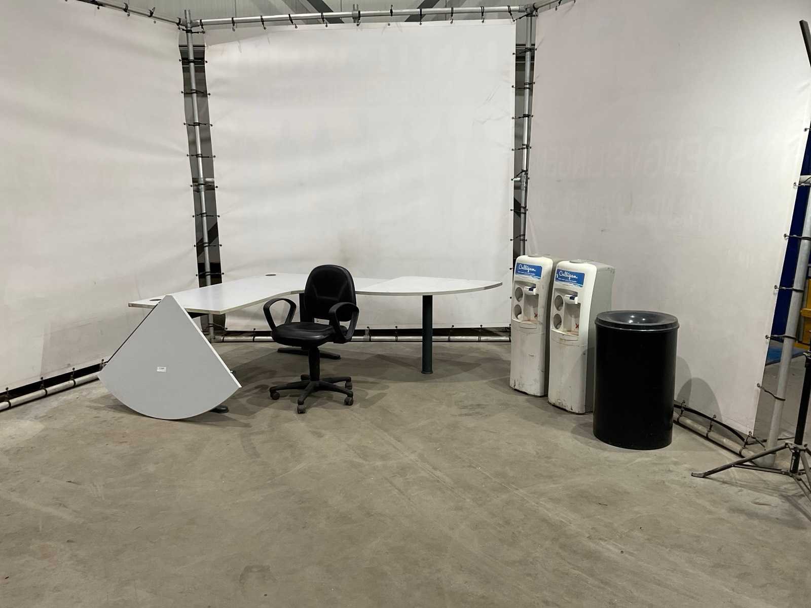 Kavel bestaat uit 1x afvalbak; 2x water dispenser; 1x bureau stoel; tafel met zijstukken