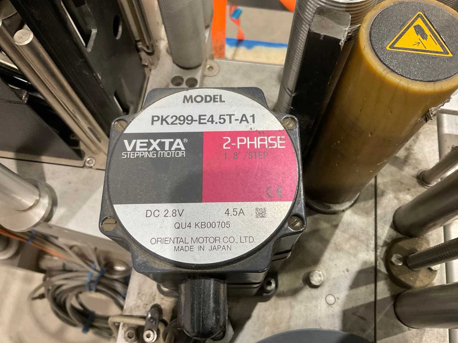 Machine voorzien van zebra ze 500 etiketten machine; vextra stepping motor ; transportband circa 124 cm lang; band breedte 43 cm Totale afmeting L: 1600mm Totale afmeting Breedte: 1350mm Totale afmeting Hoogte: 131mm