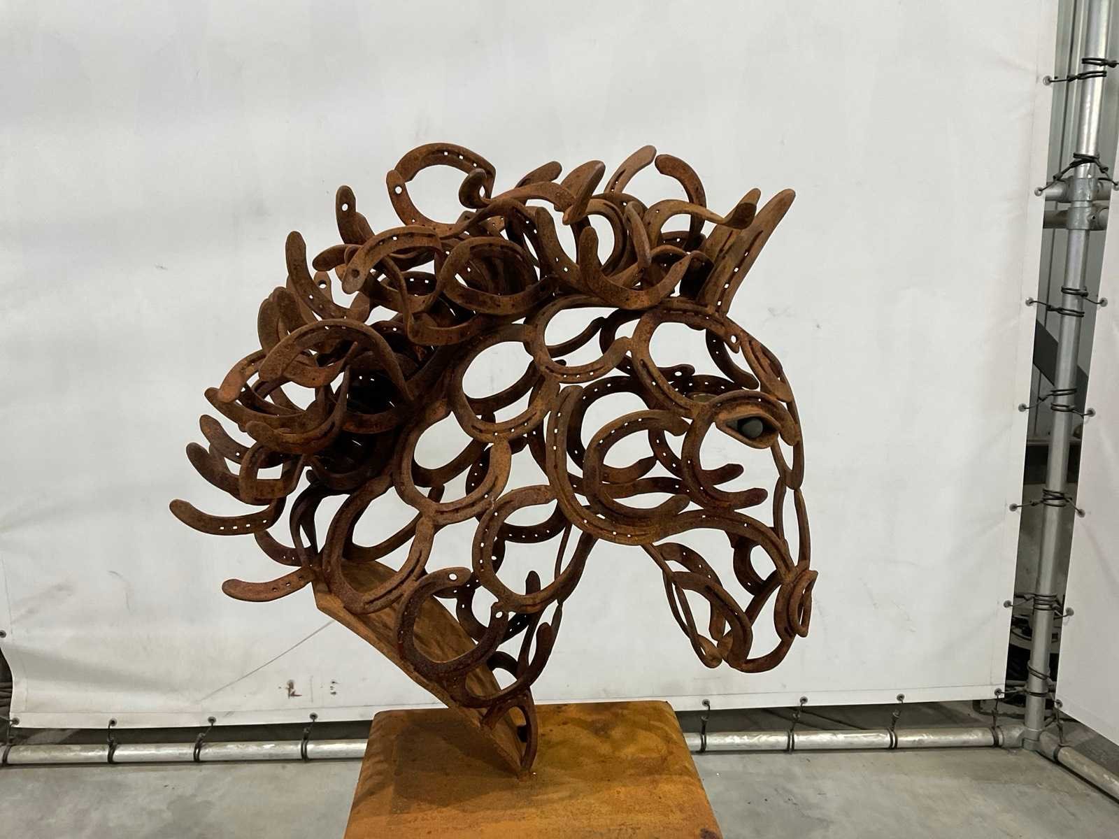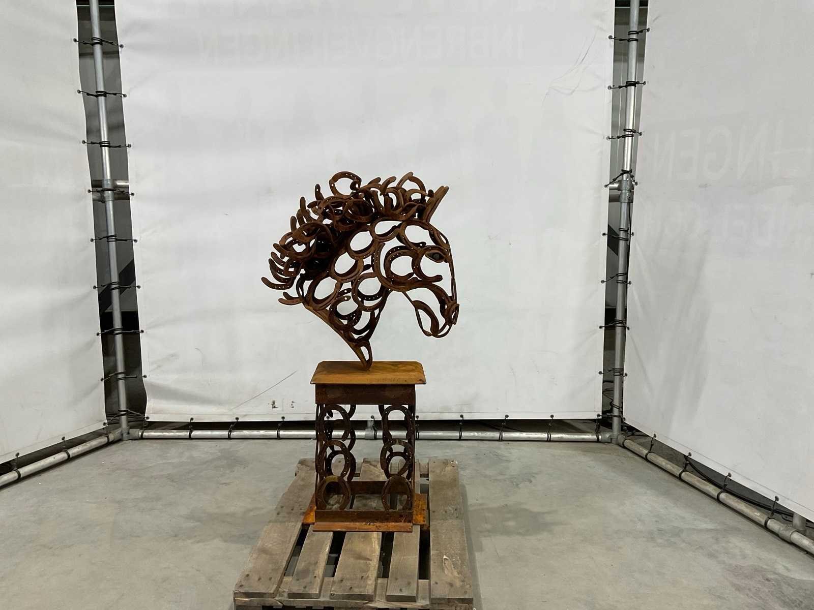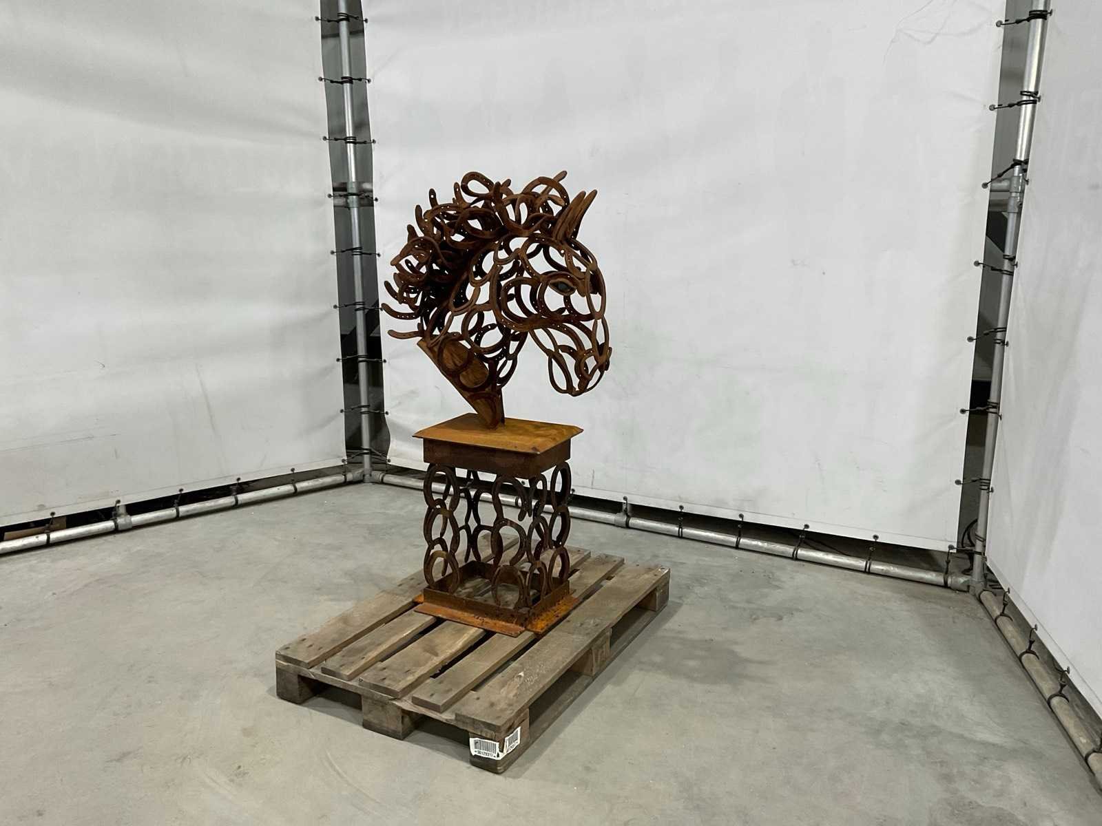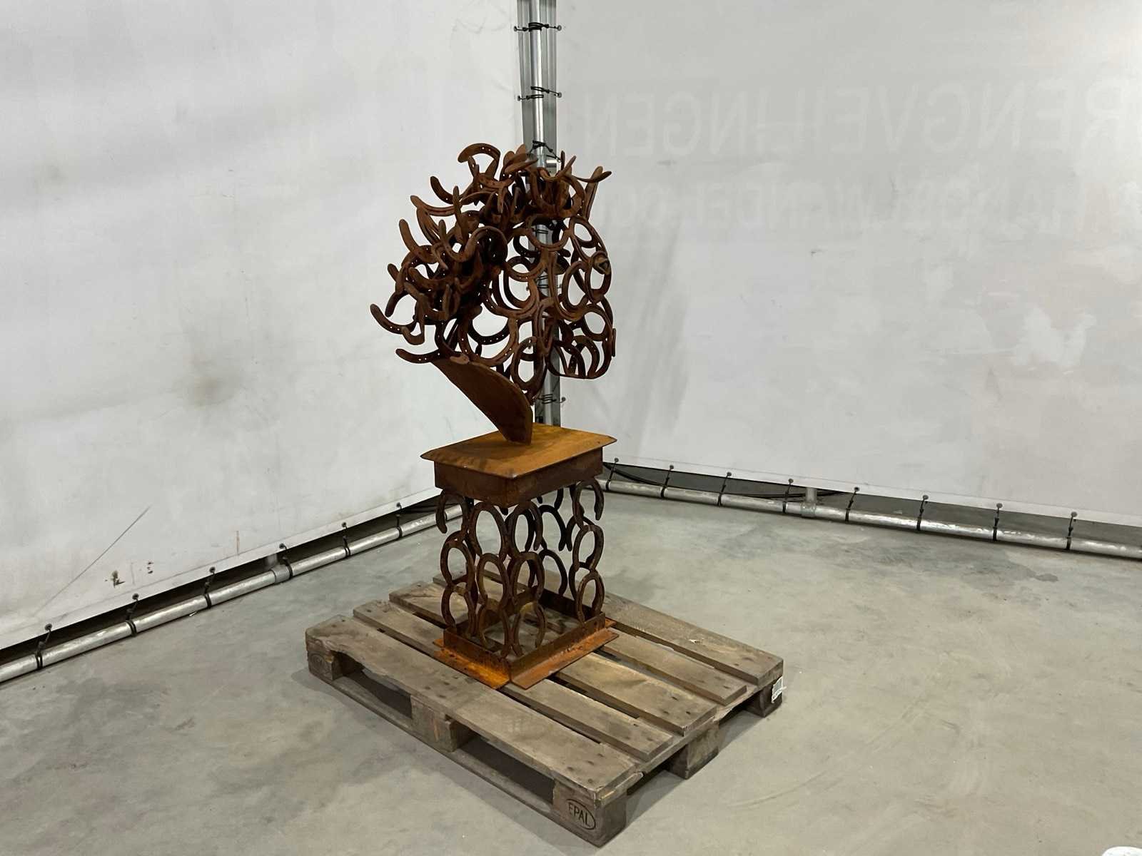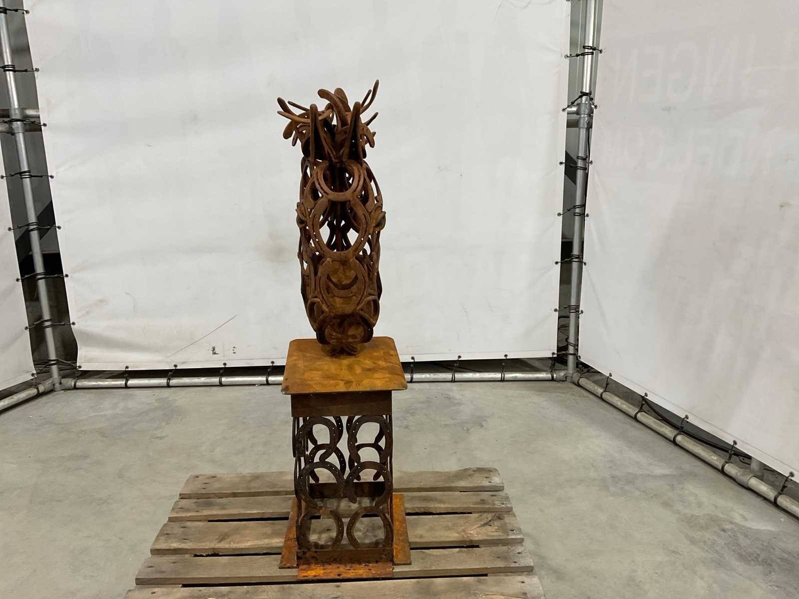 Gemaakt van oude hoefijzers; hoofd 90 cm hoog ; 75 cm breed; geschat gewicht 65 kg ; zuil 60 cm hoog; 40 cm breed; 30 cm diep; geschat gewicht 15 kg Hoogte: 150cm Materiaal: IJzer