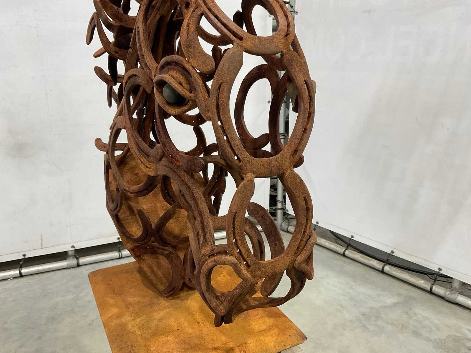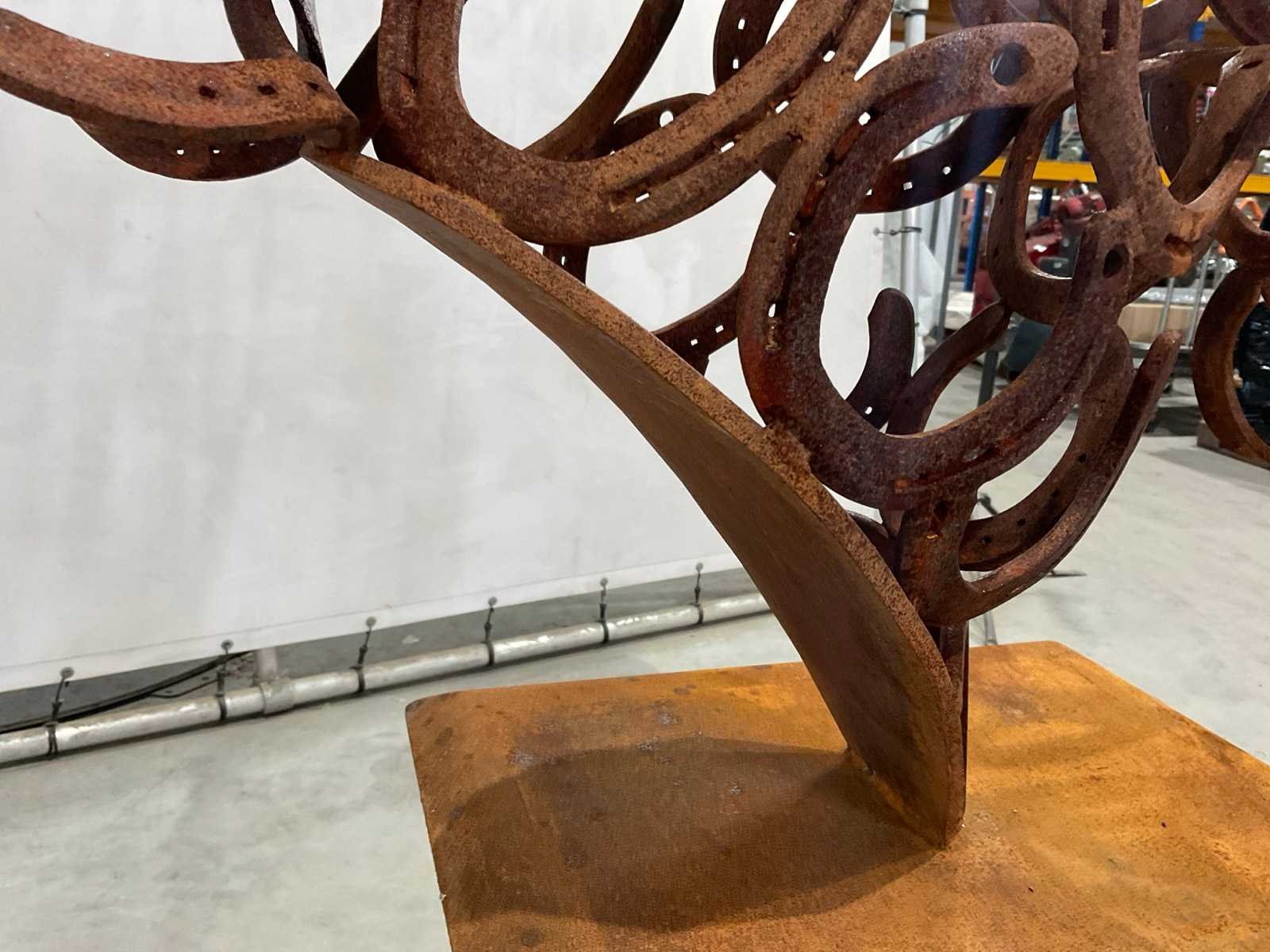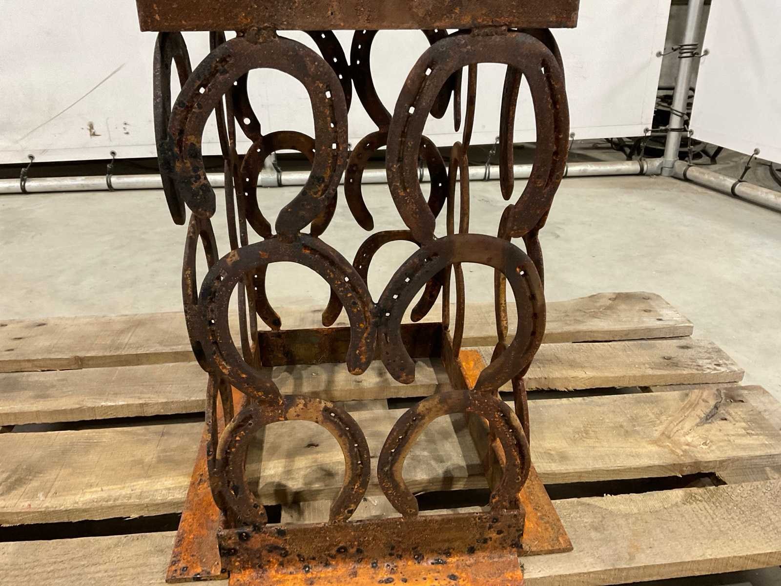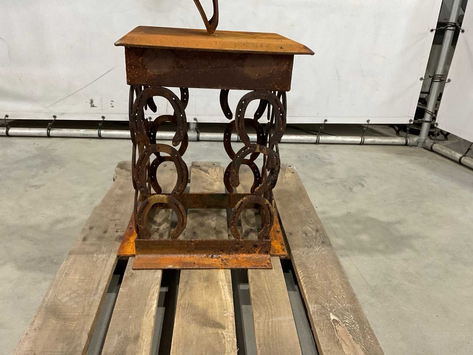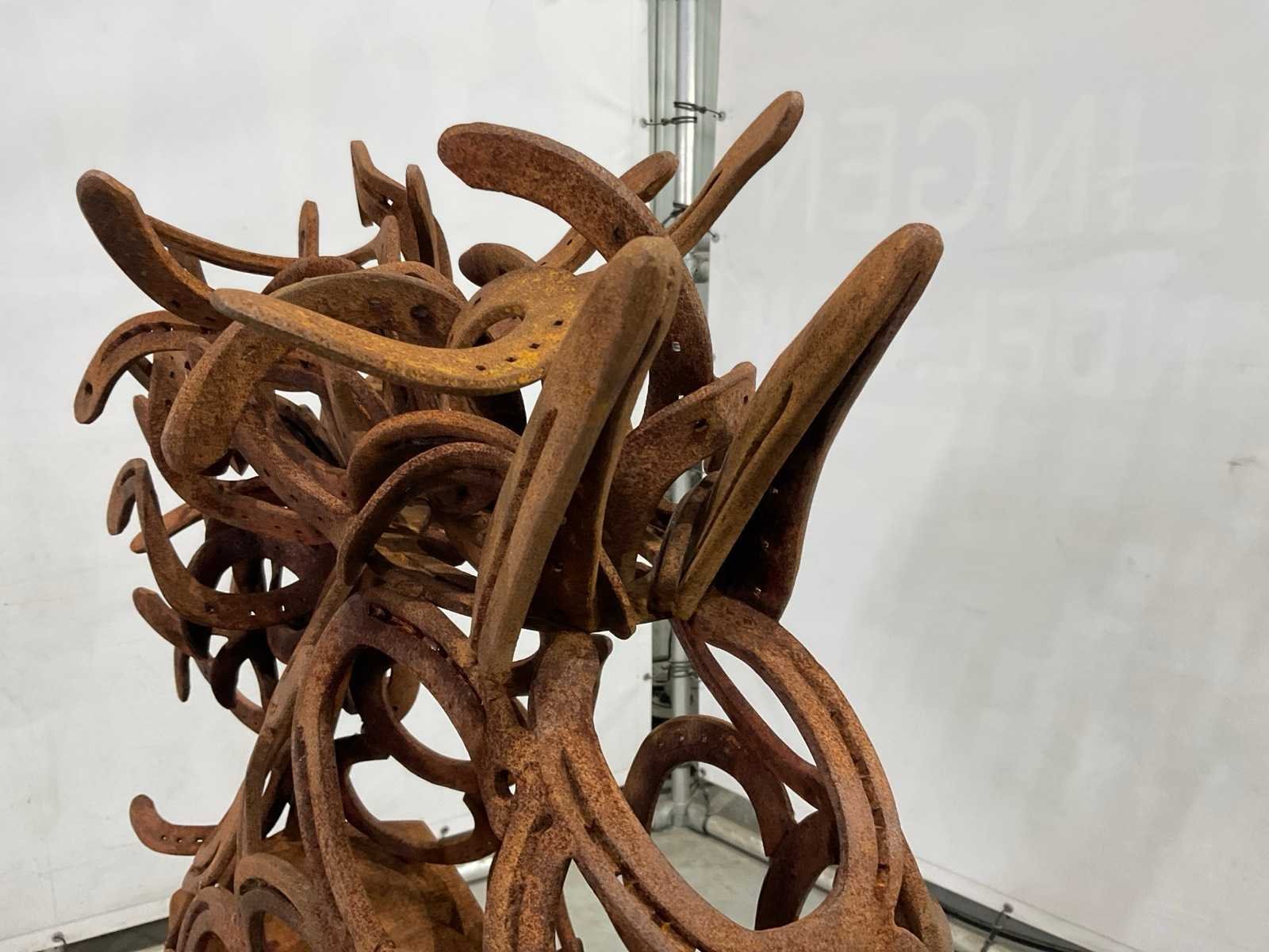 Gemaakt van oude hoefijzers; hoofd 90 cm hoog ; 75 cm breed; geschat gewicht 65 kg ; zuil 60 cm hoog; 40 cm breed; 30 cm diep; geschat gewicht 15 kg Hoogte: 150cm Materiaal: IJzer