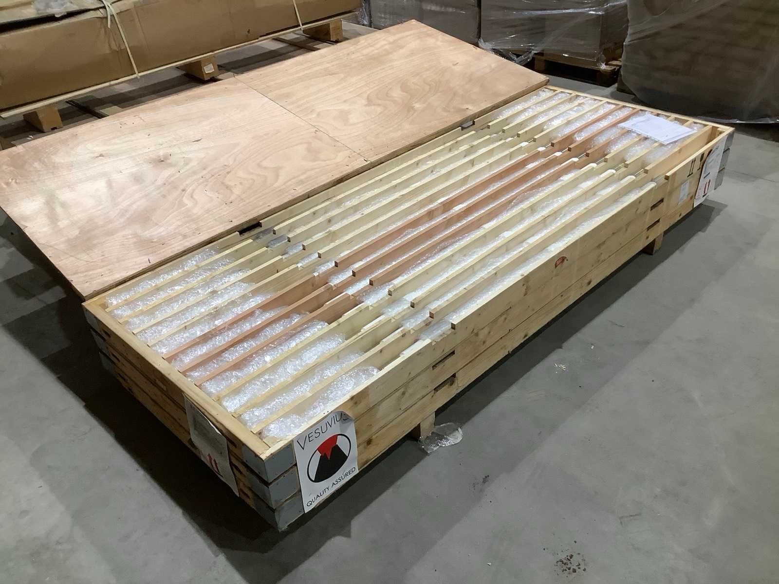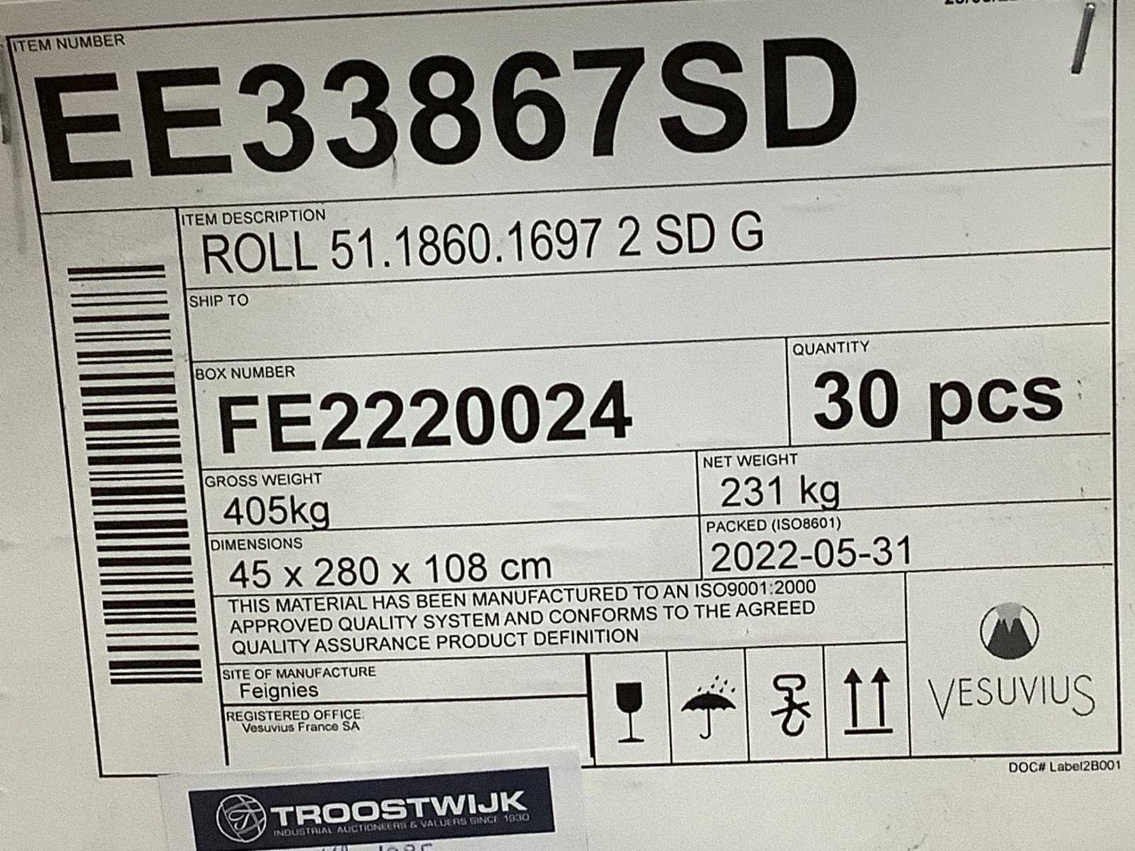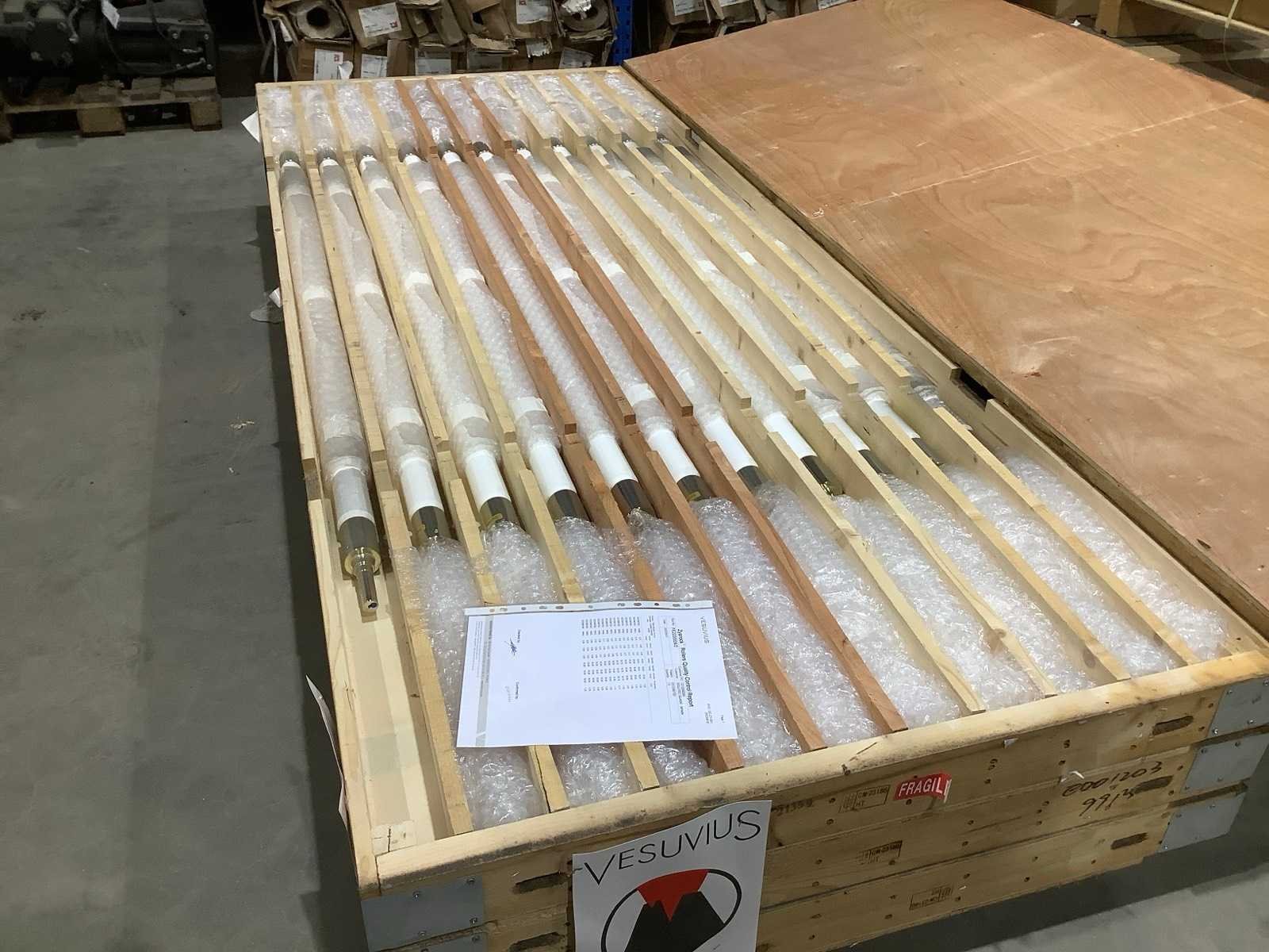 Dit kavel bestaat uit circa 30 rollen, een fused silica roller (gesmolten silica-rol) is een hoogwaardige keramische rol gemaakt van vrijwel zuiver siliciumdioxide die wordt gebruikt in industriële ovens, met name in glasverwerkingsprocessen. Deze rollen staan bekend om hun vermogen om extreme temperaturen en thermische schokken te weerstaan zonder te vervormen; Toepassingen: Ze worden voornamelijk gebruikt als transportrollen in glasfabrieken (glasoven-tempering) en bij de productie van zonne-energiecellen (solar thin film processing); afmetingen 45x280x108 cm Merk: Vesuvius Type: Roll 51.1860.1697 2 SDG Bouwjaar: 2024