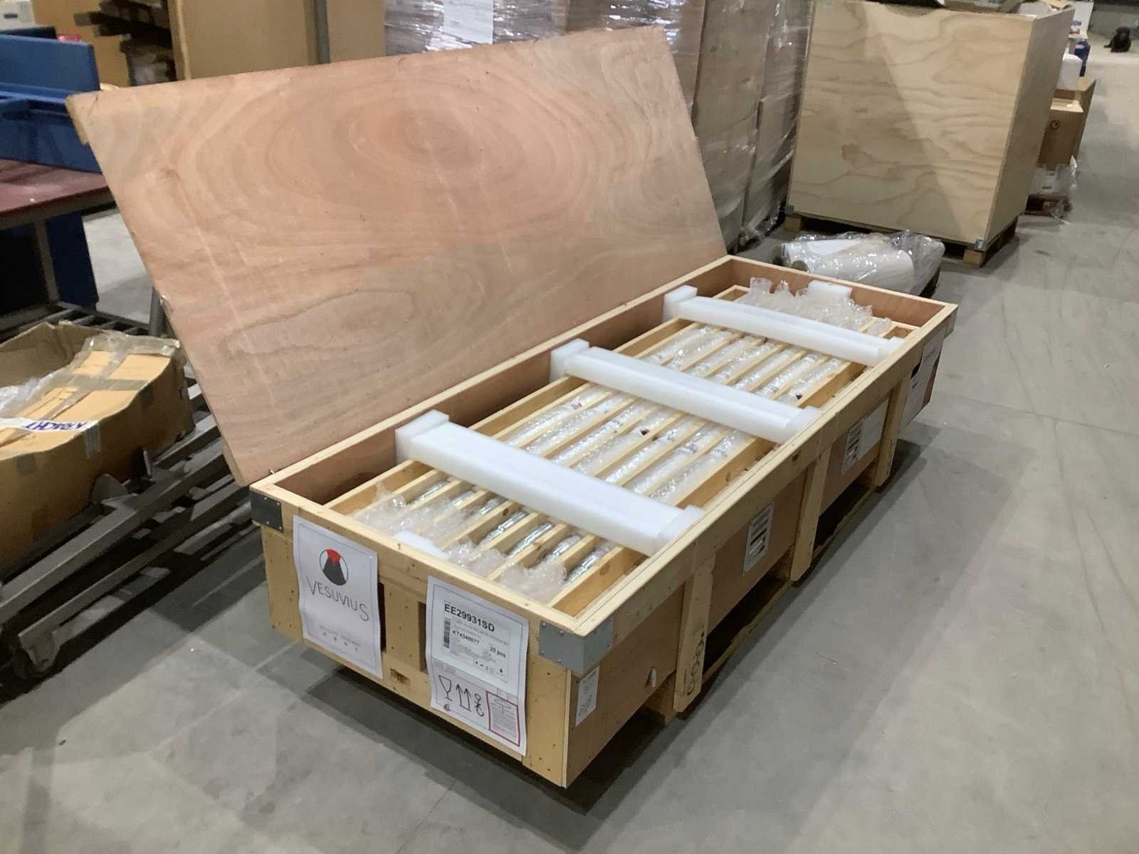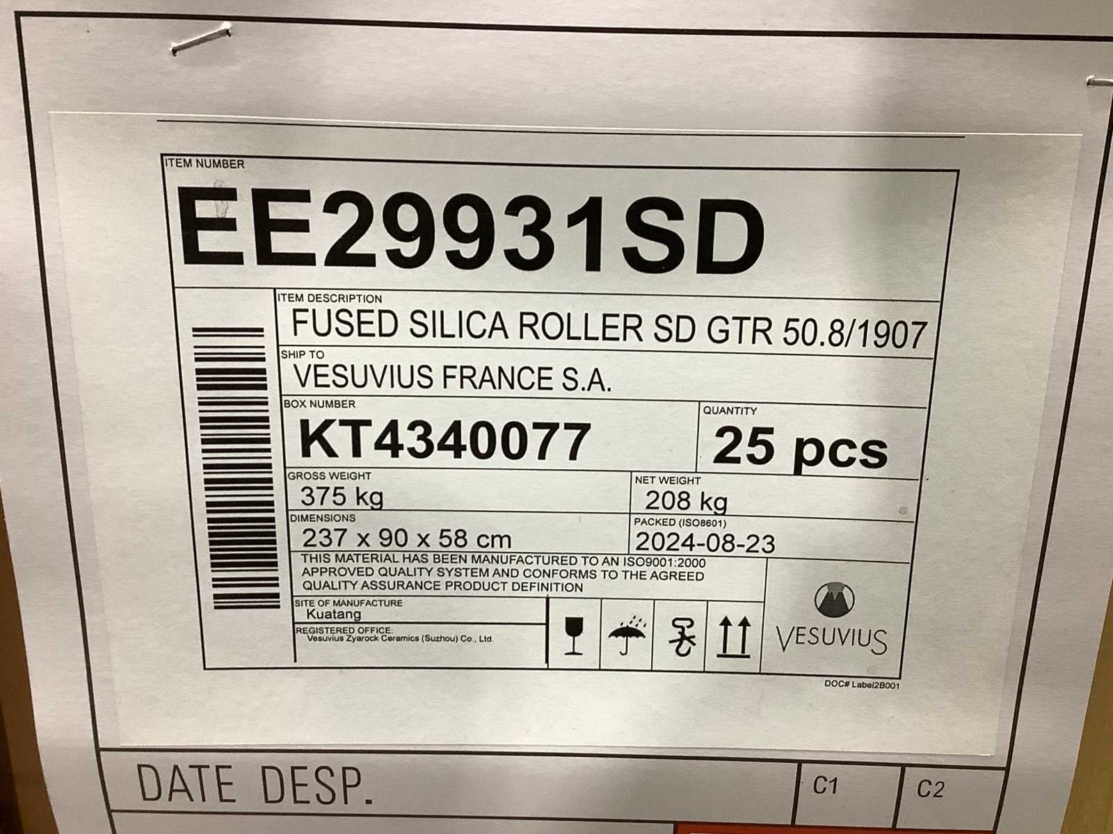 Kavel bevat 25 rollen, een fused silica roller (gesmolten silica-rol) is een hoogwaardige keramische rol gemaakt van vrijwel zuiver siliciumdioxide die wordt gebruikt in industriële ovens, met name in glasverwerkingsprocessen. Deze rollen staan bekend om hun vermogen om extreme temperaturen en thermische schokken te weerstaan zonder te vervormen; Toepassingen: Ze worden voornamelijk gebruikt als transportrollen in glasfabrieken (glasoven-tempering) en bij de productie van zonne-energiecellen (solar thin film processing); afmetingen 237x99x58 Merk: Vesuvius Type: SD GTR 59.8/1907 Bouwjaar: 2024