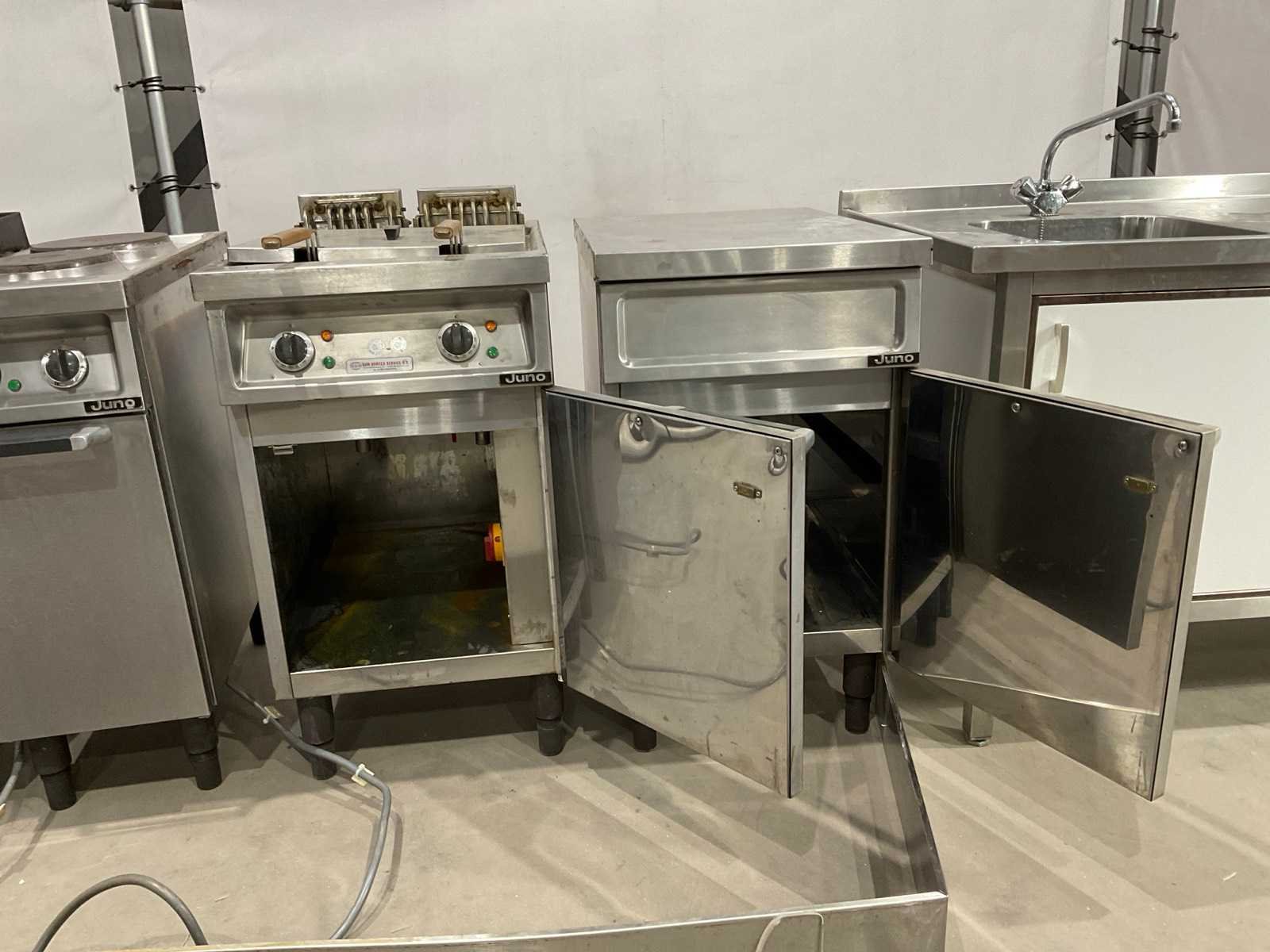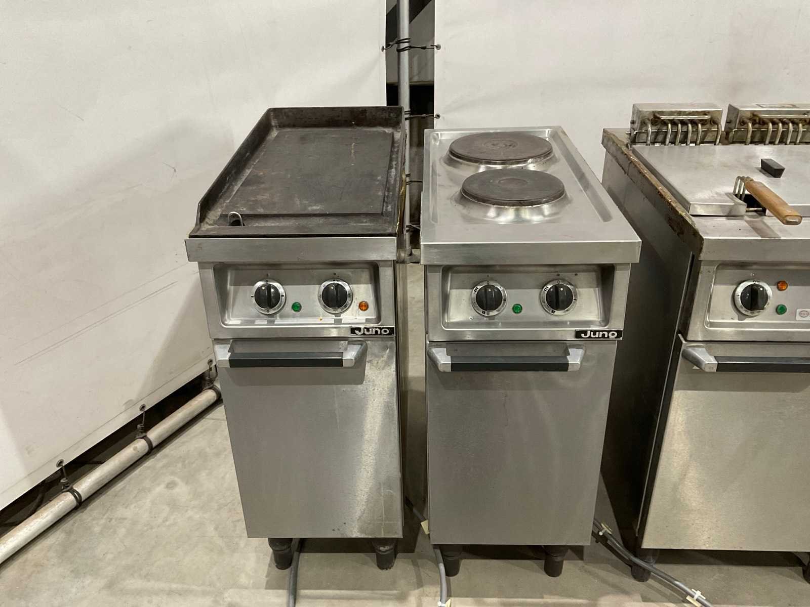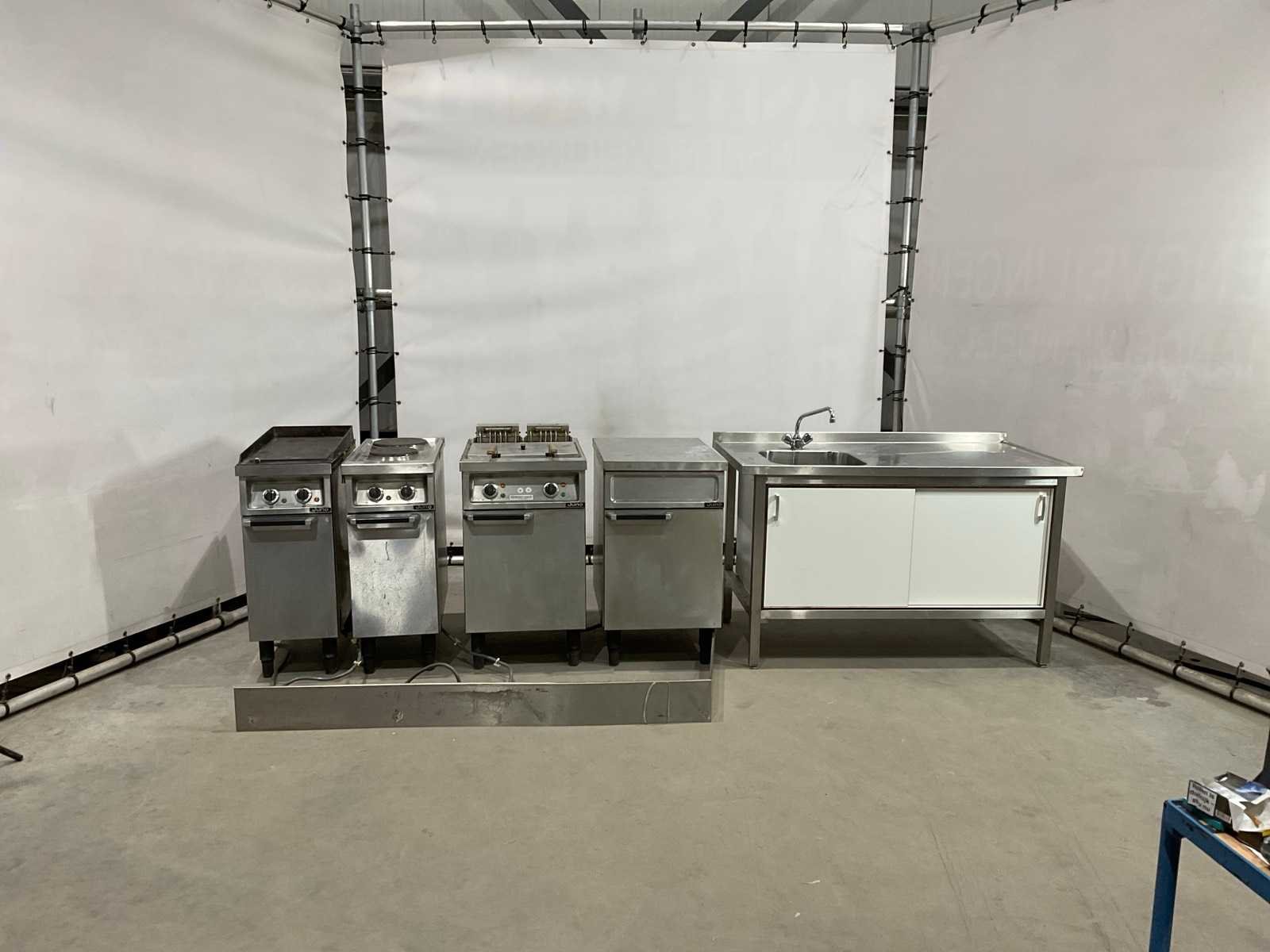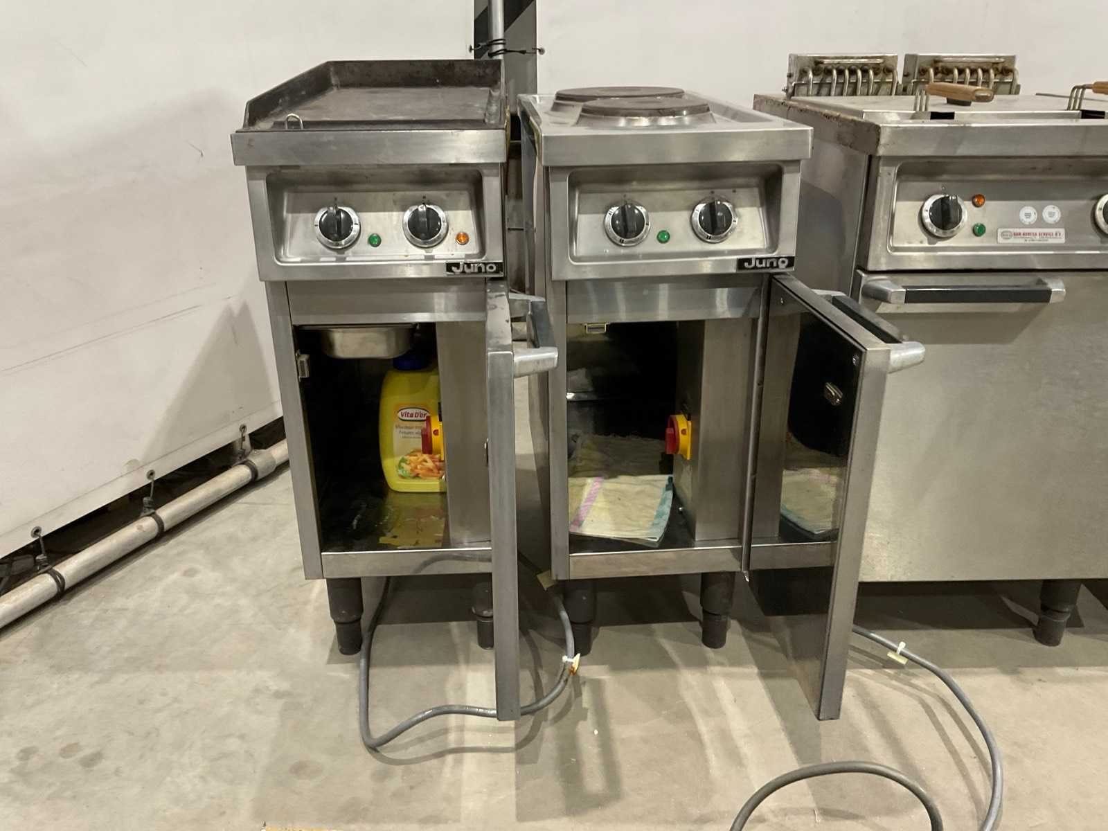 Bakplaat unit circa 95 cm hoog; 35 cm breed; 75 cm lang; 2 pits kookplaat unit circa 89 cm hoog; 35 cm breed; 75 cm lang; dubbele frituur circa 97 cm hoog; 50 cm breed; 75 cm lang; neutrale unit circa 88 cm hoog; 50 cm breed; 75 cm lang ; keukenblok circa 140 cm breed ; 91 cm hoog; 75 cm lang Merk: Juno Materiaal: Rvs