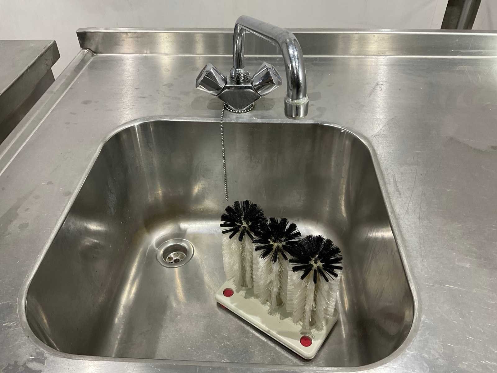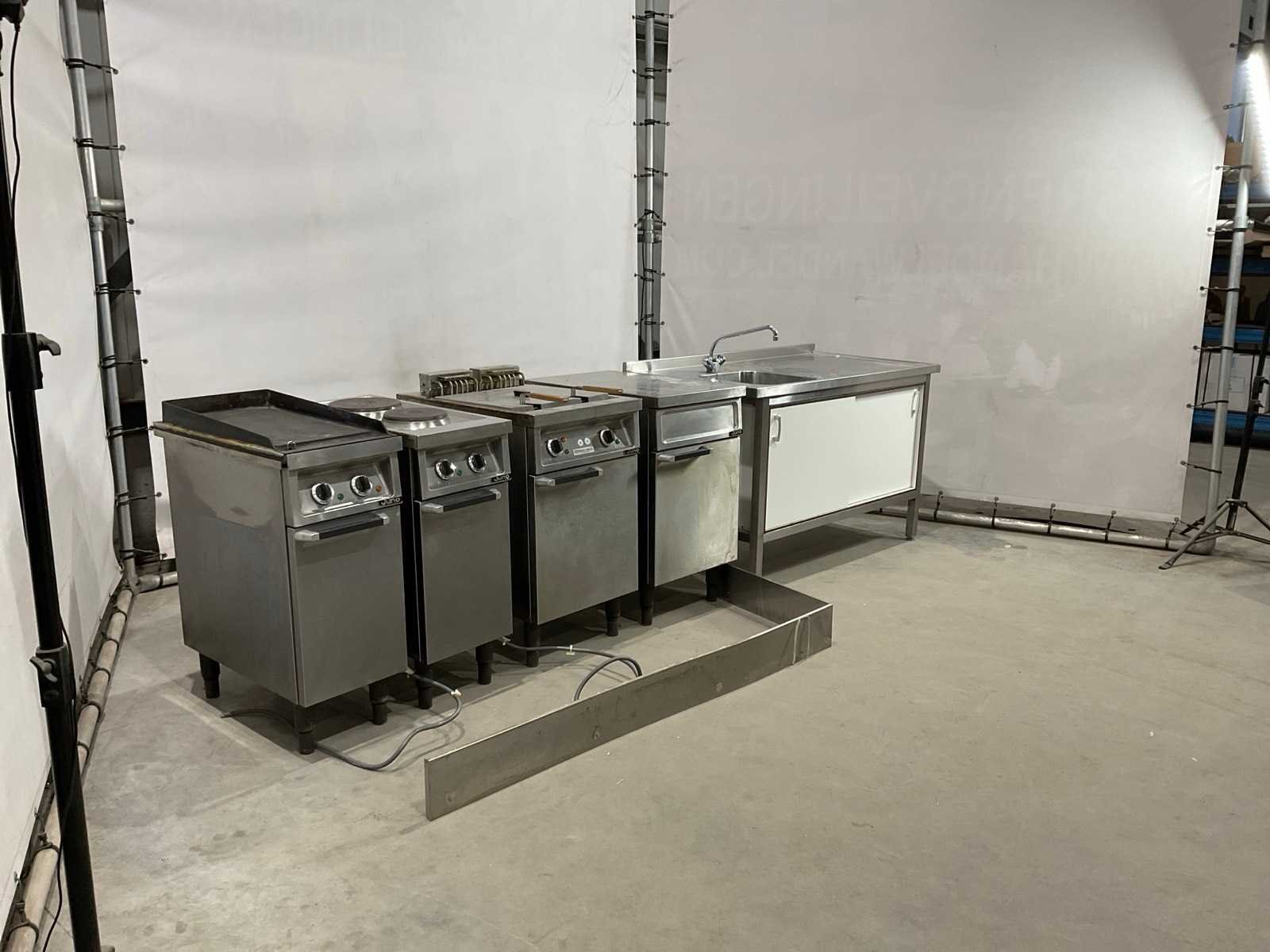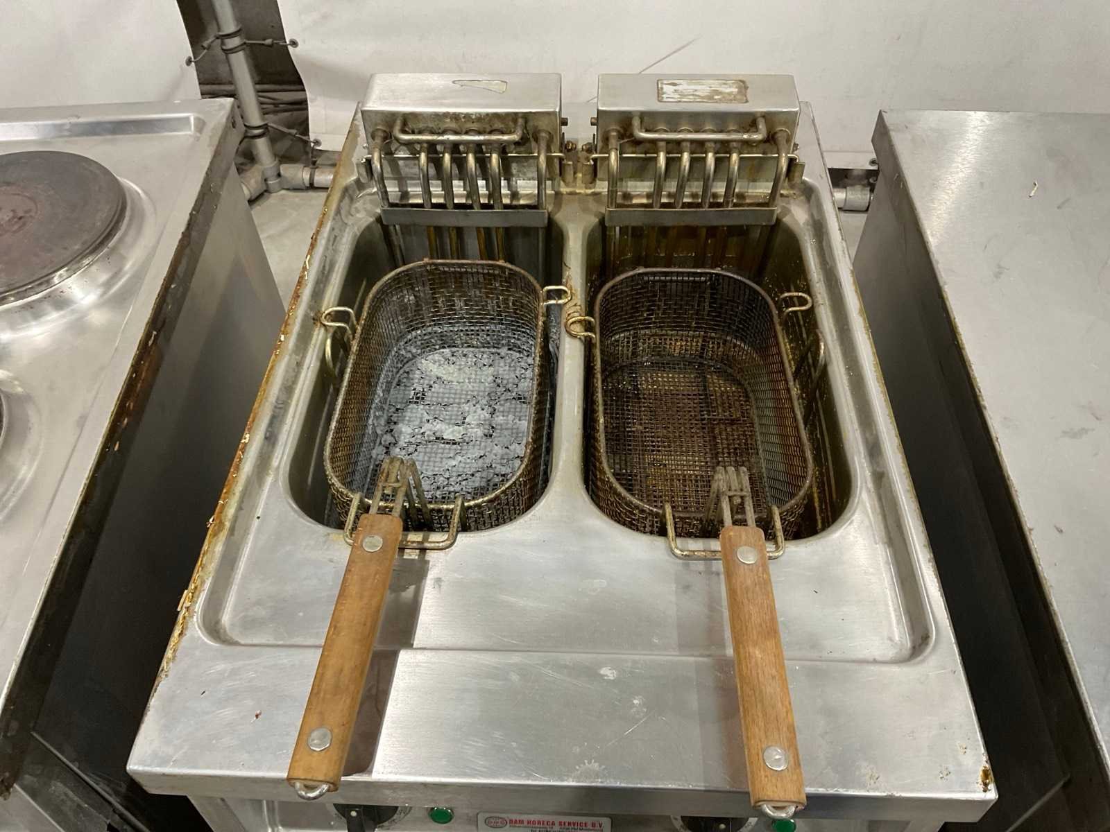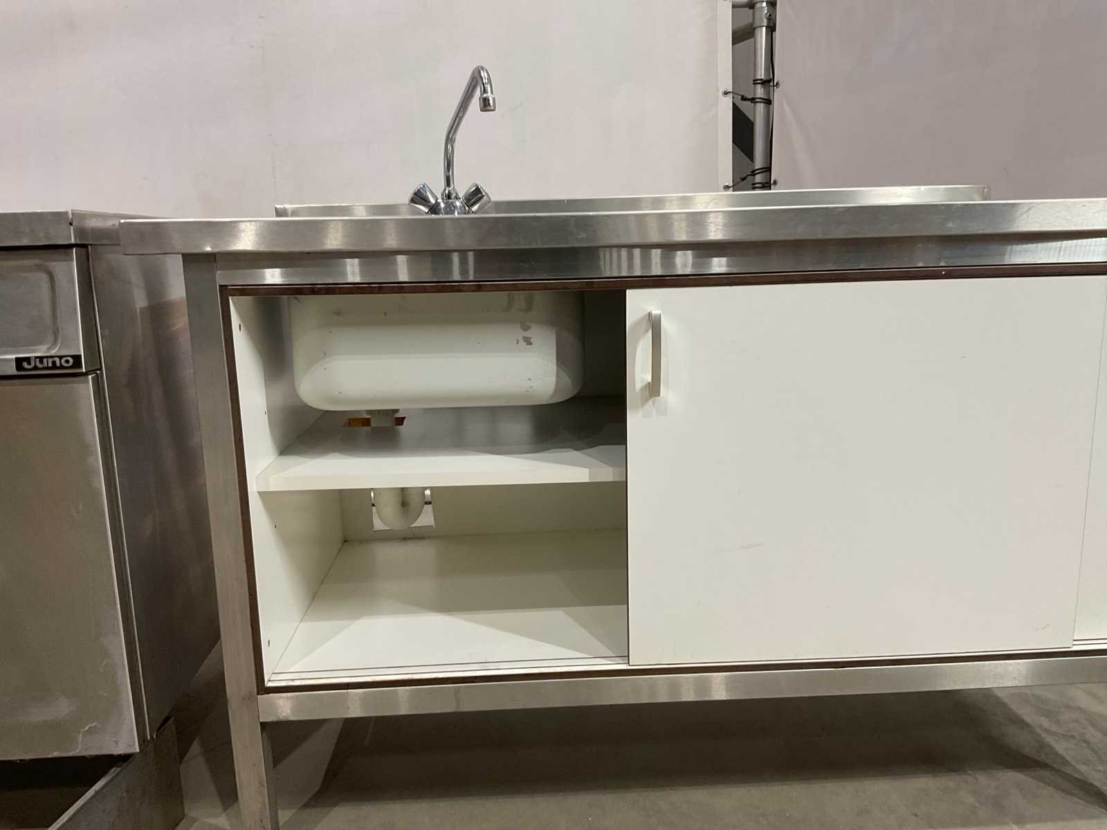 Bakplaat unit circa 95 cm hoog; 35 cm breed; 75 cm lang; 2 pits kookplaat unit circa 89 cm hoog; 35 cm breed; 75 cm lang; dubbele frituur circa 97 cm hoog; 50 cm breed; 75 cm lang; neutrale unit circa 88 cm hoog; 50 cm breed; 75 cm lang ; keukenblok circa 140 cm breed ; 91 cm hoog; 75 cm lang Merk: Juno Materiaal: Rvs